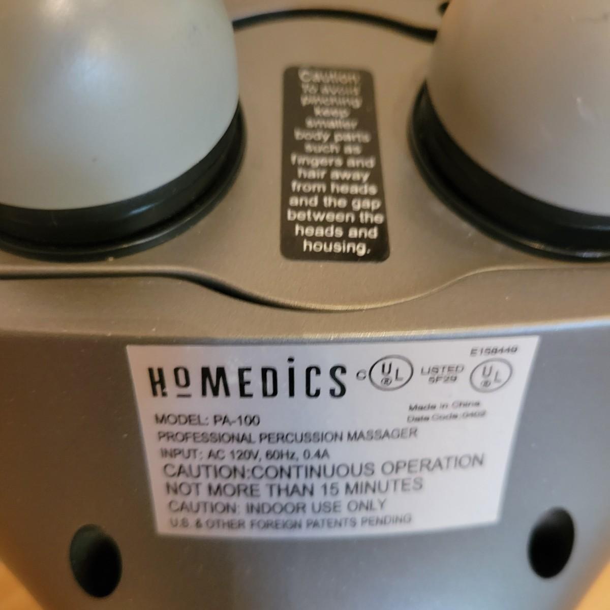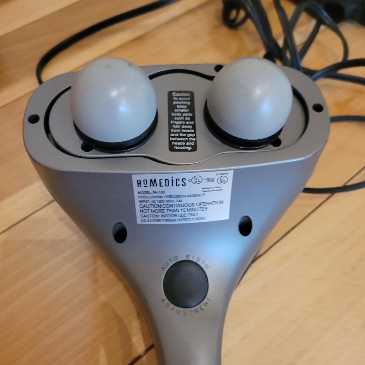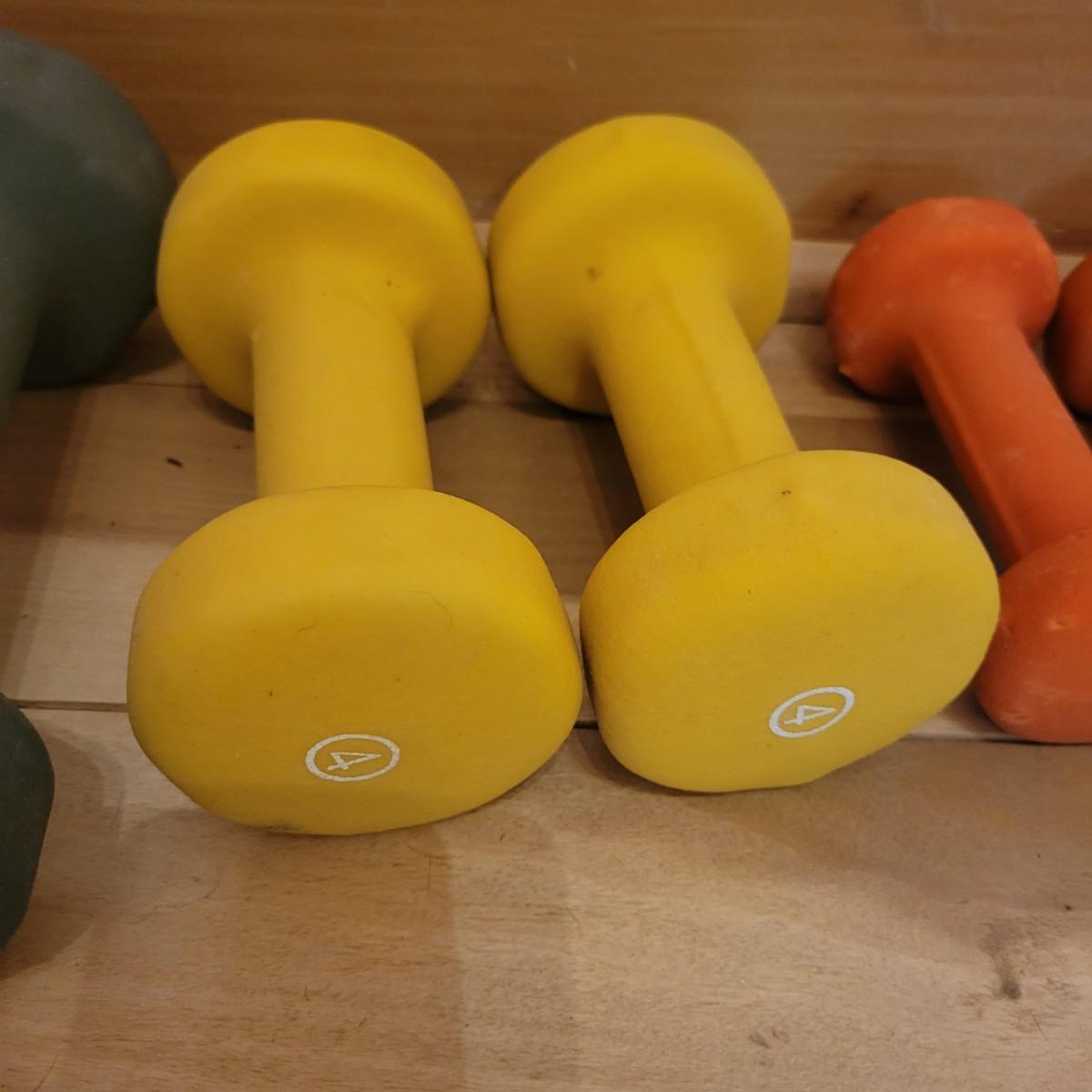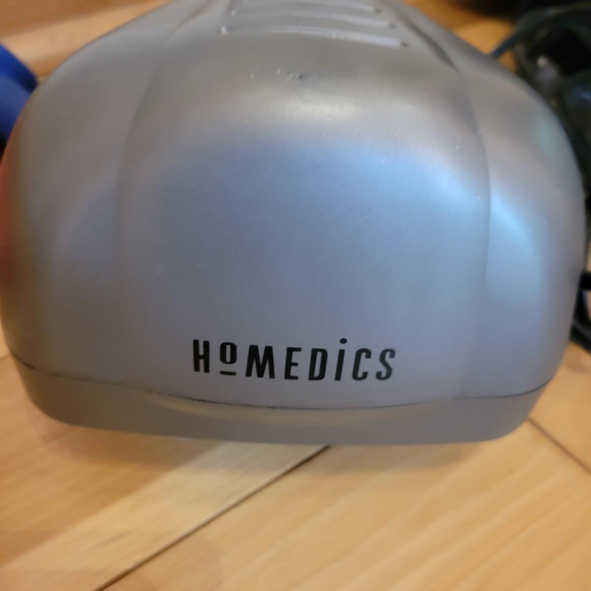 A Homedics massager that powered on when plugged in. It features adjustable vibration and and the width of the vibrators can be adjusted. This lot also also includes eight dumbells ranging from eight pounds to two pounds. Local pickup only