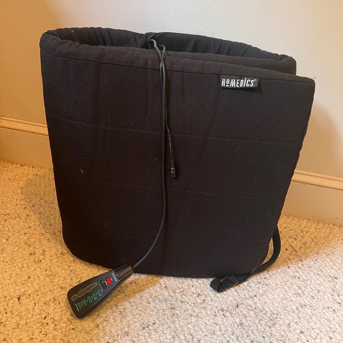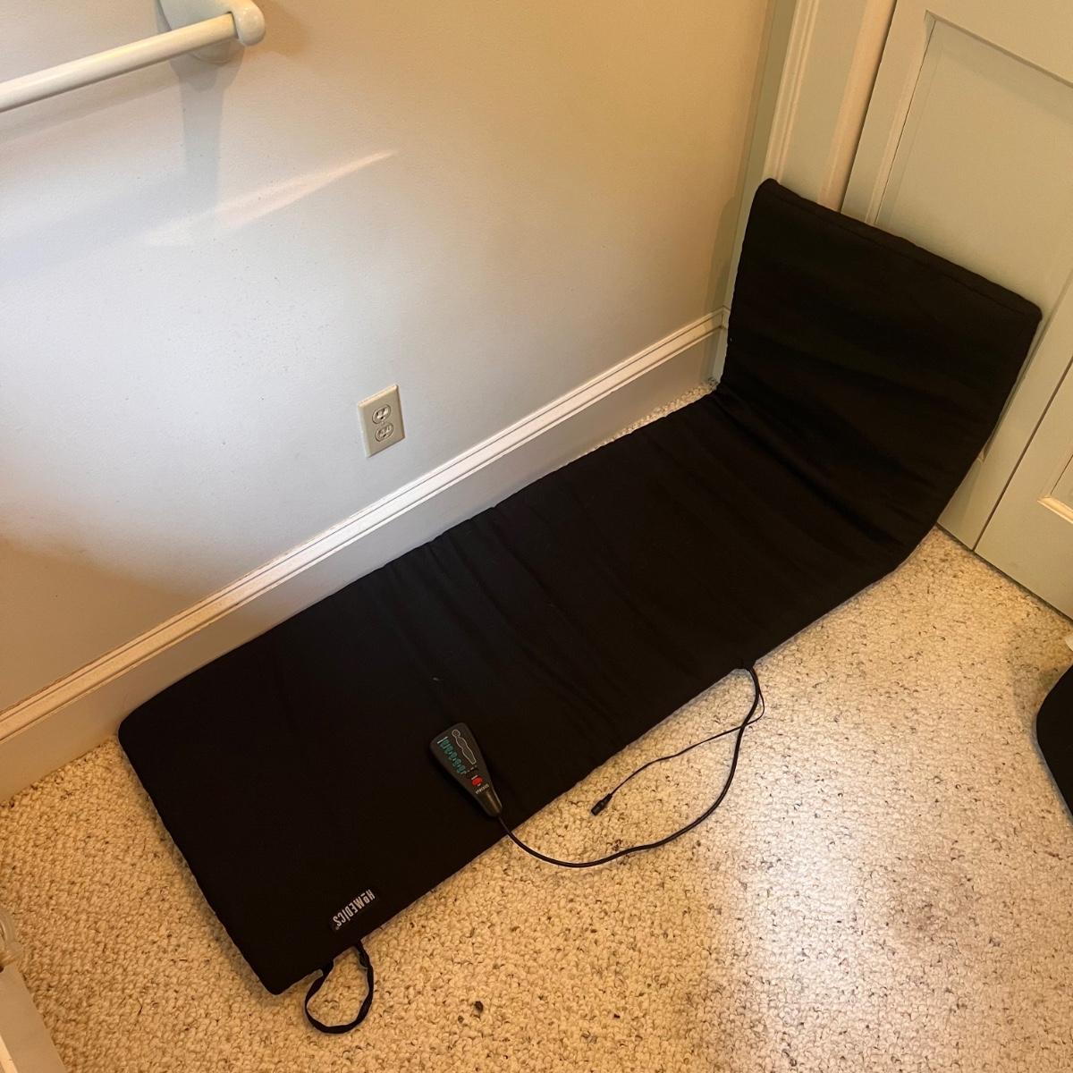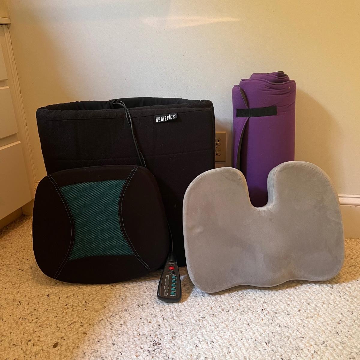 This lot includes one HomeMedics remote controlled massage pad, one roll-up foam mat, one memory foam cushion, and one polyurethane cushions. The grey memory foam cushion measures 18.1” x 14.2” x 3.15”H. The remote controlled massage pad powered on. Shipping available.