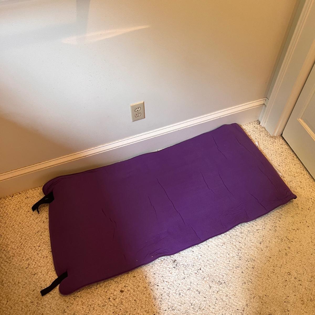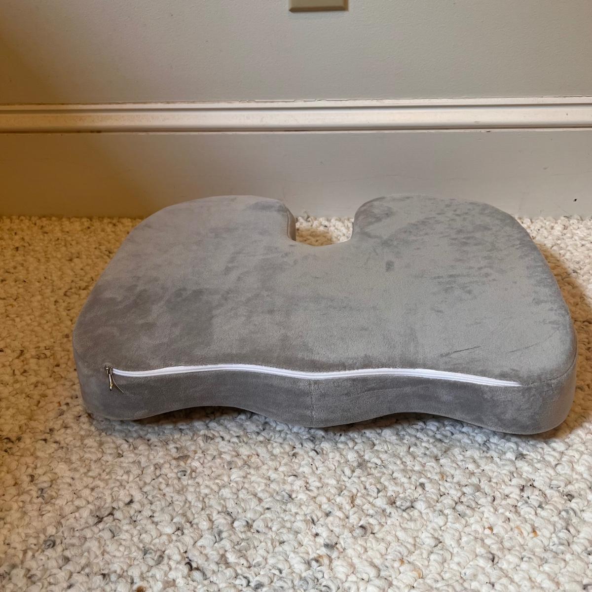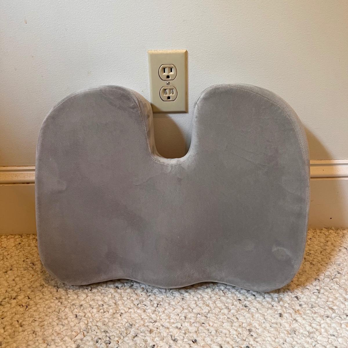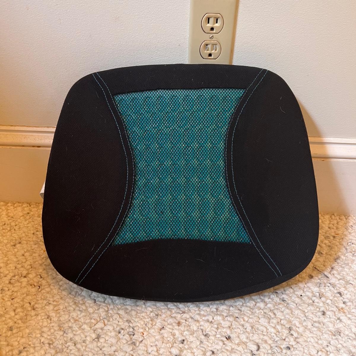 This lot includes one HomeMedics remote controlled massage pad, one roll-up foam mat, one memory foam cushion, and one polyurethane cushions. The grey memory foam cushion measures 18.1” x 14.2” x 3.15”H. The remote controlled massage pad powered on. Shipping available.