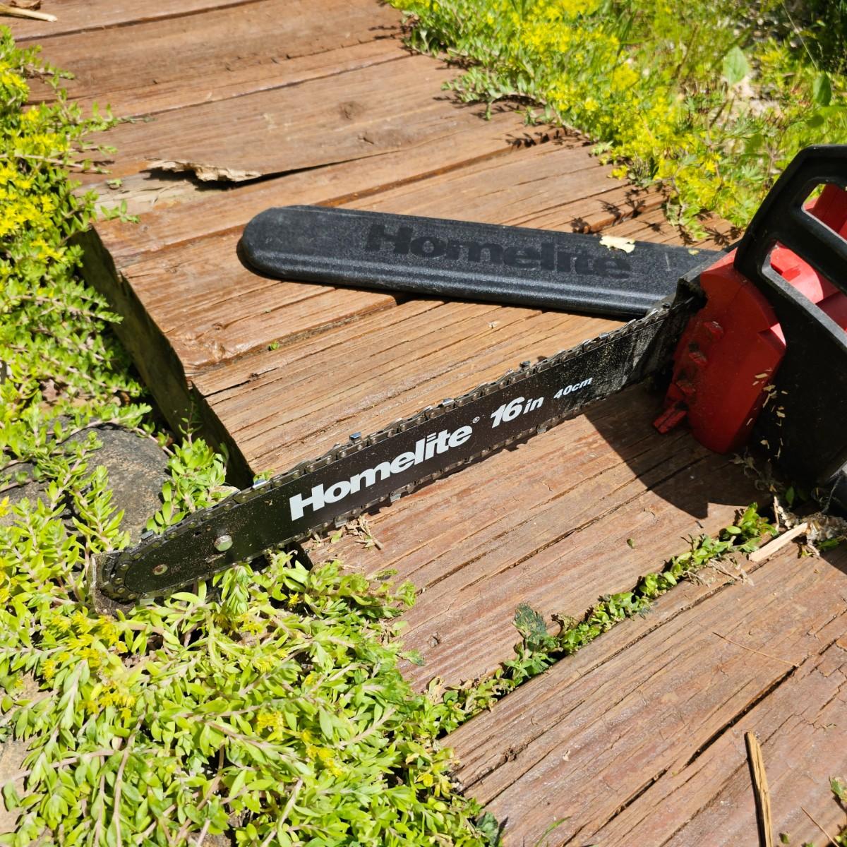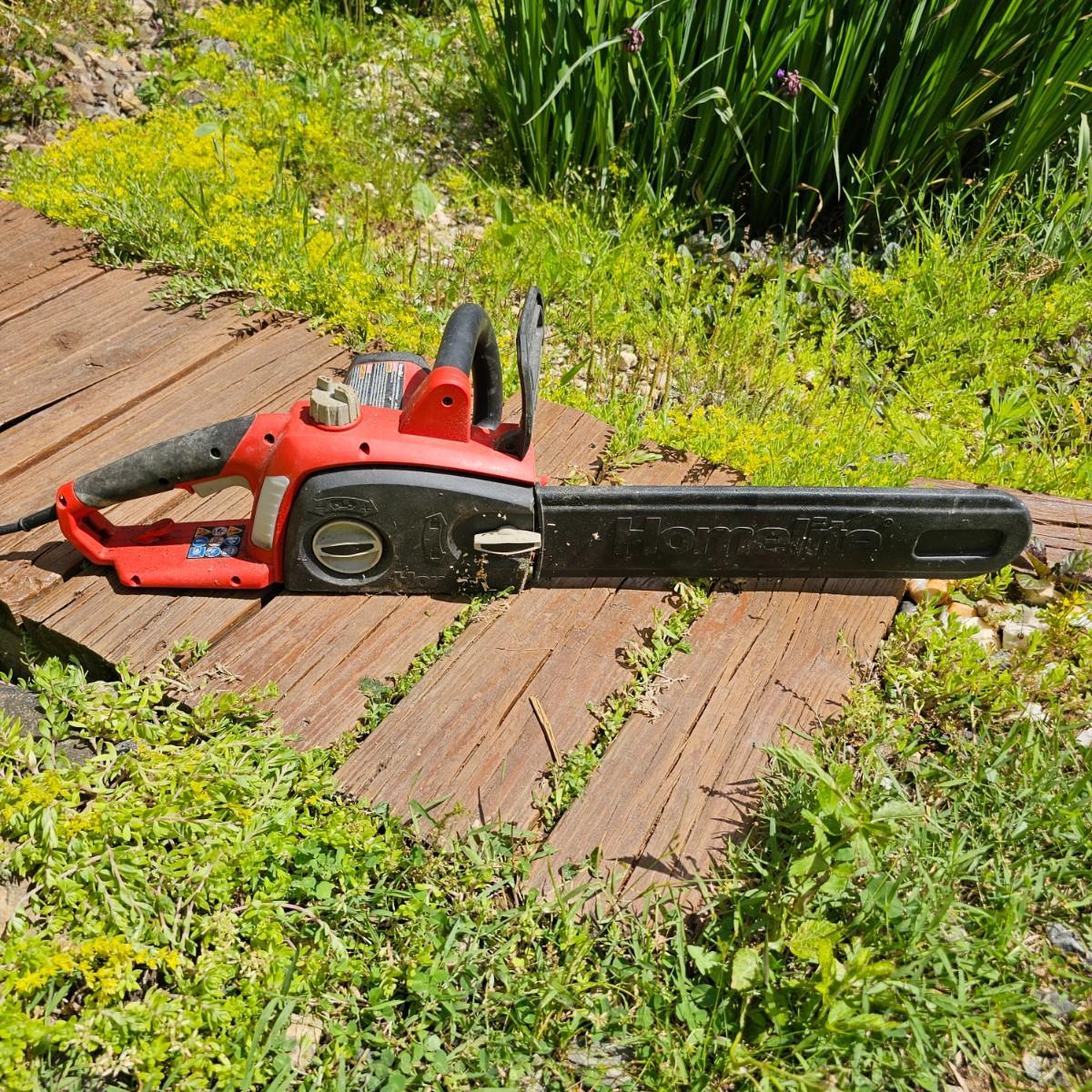 One Homelite model UT43122B electric chainsaw with 16" blade and cover. Uses standard 110 volt power. Unit powered on when plugged in. See photos for details. Local pickup only.