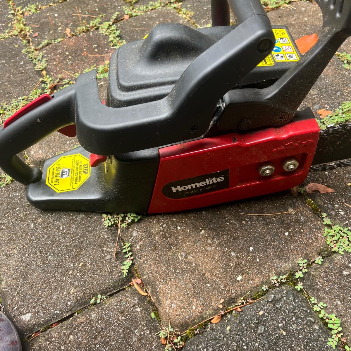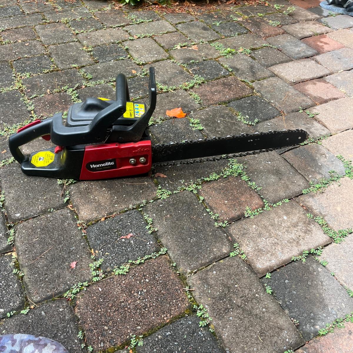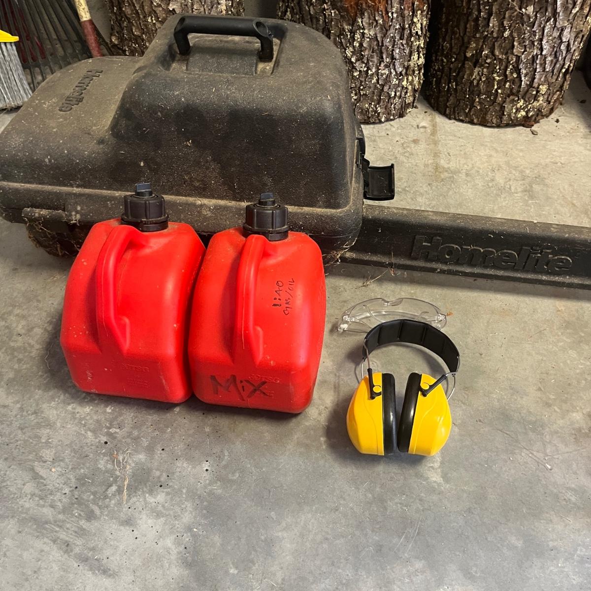 Lot includes a Homelite 16” bar chainsaw with plastic carrying case and safety glasses and ear protection. Also includes two one-gallon gas cans. Chainsaw started when starter cord was pulled. Gas cans have liquid in them, but we cannot guarantee what it is.