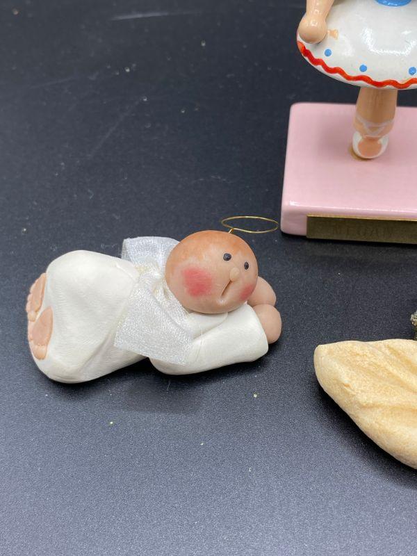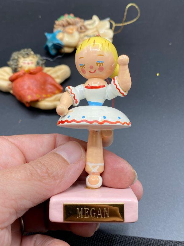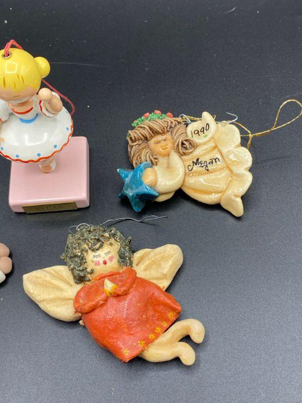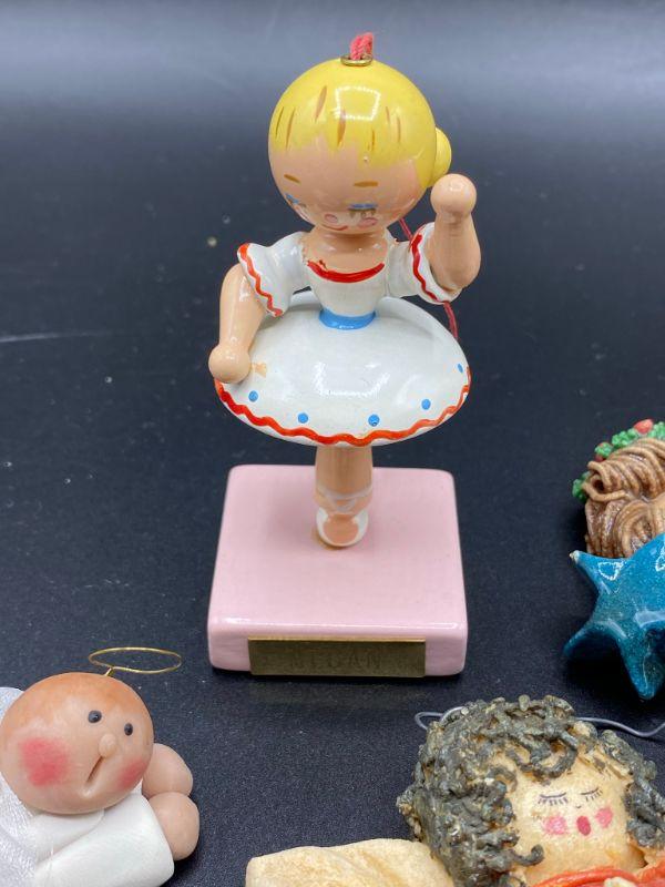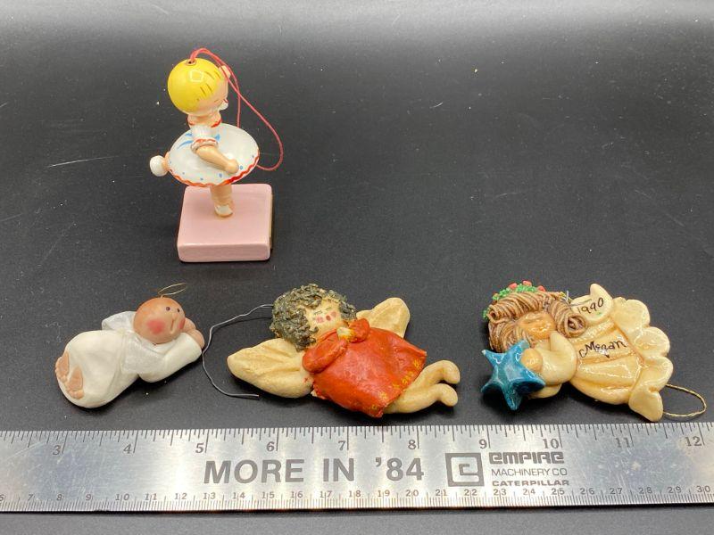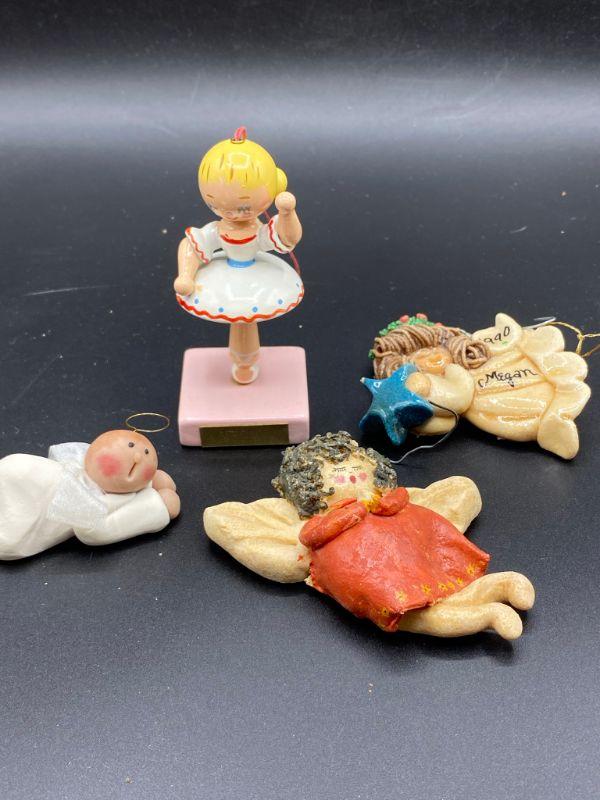 3 homemade clay ornaments and a wood ballerina. The ballerina is personalized with a name plate. One angel is personalized also.