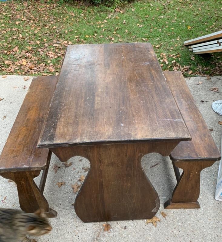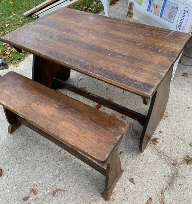 Child’s Hand made Table and 2 Benches with surface ware in good condition.