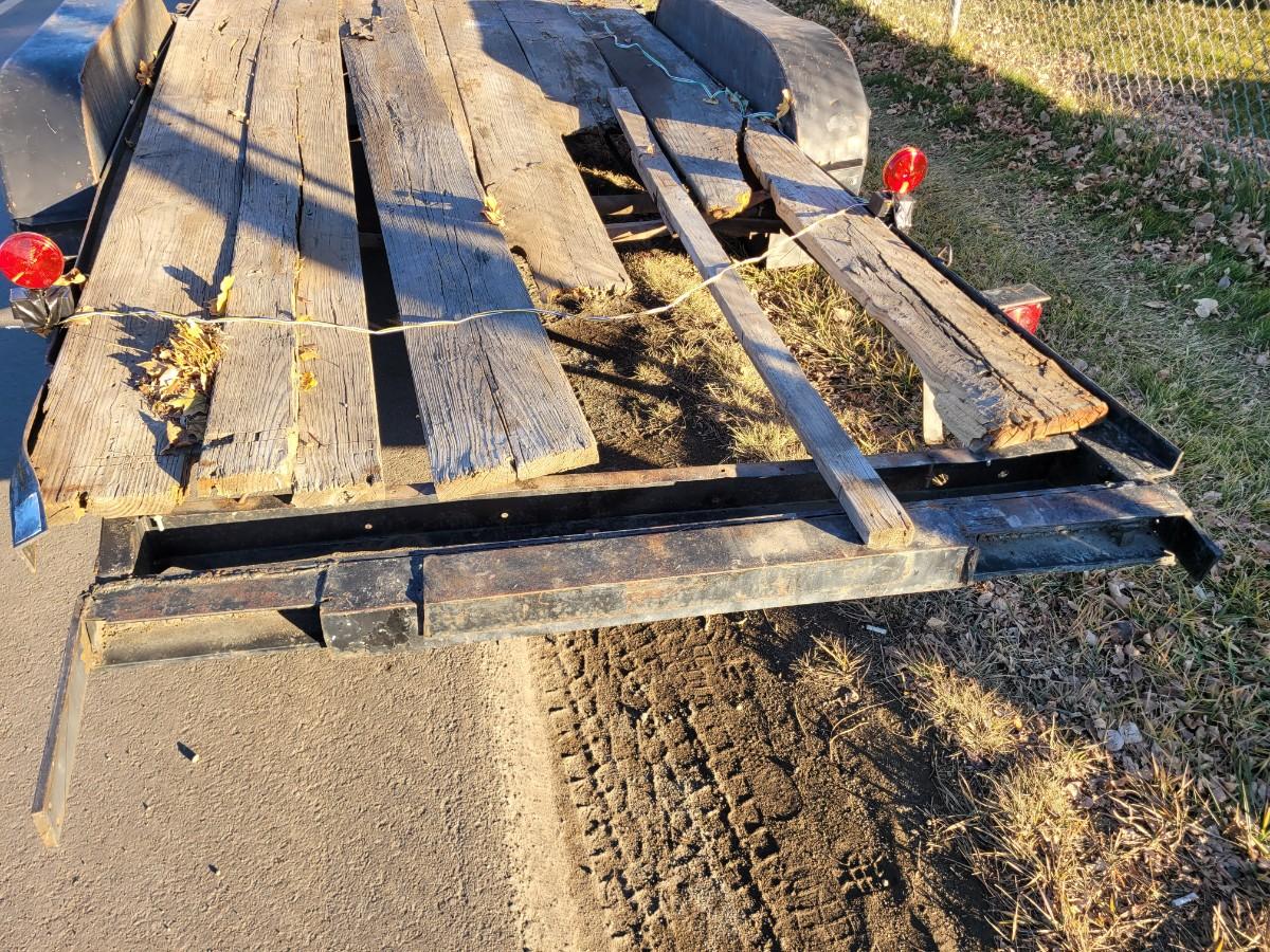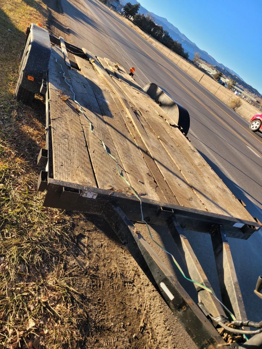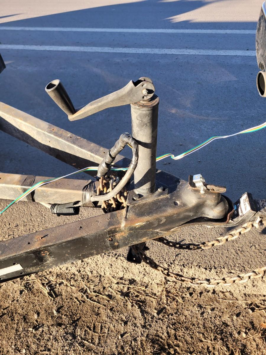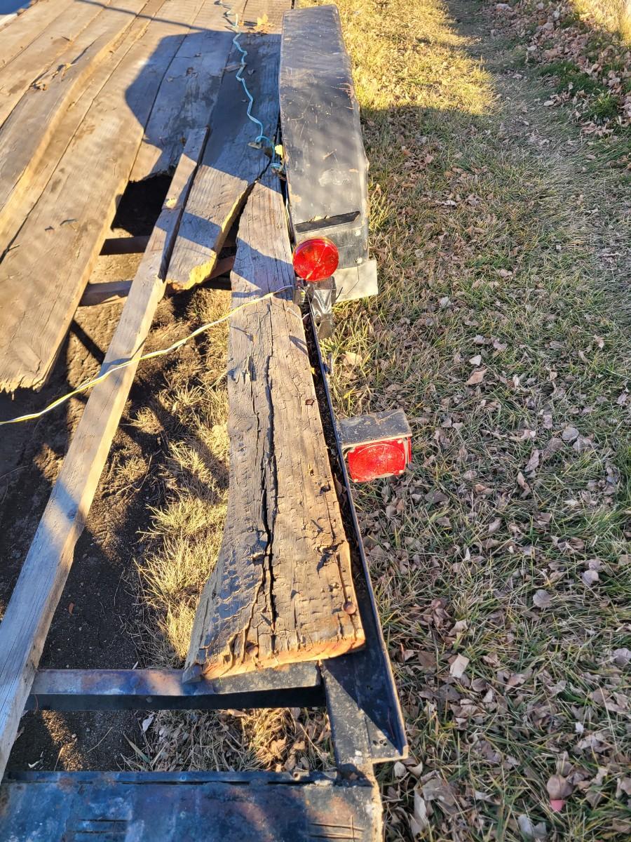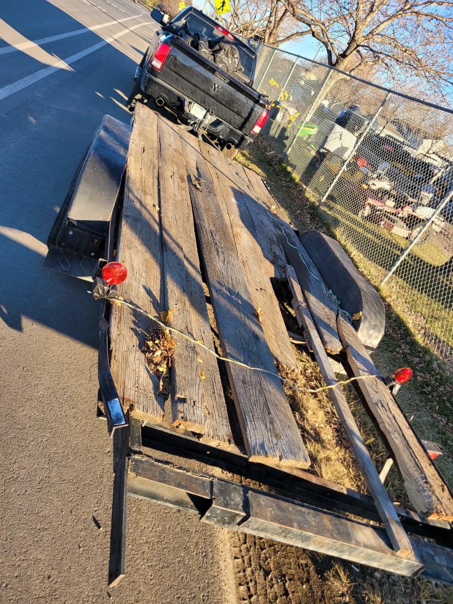 Trailer measures 17 feet long with an additional four foot tongue. Some of the lights work but this is definitely a project, needs decking and wiring and the jack does not go down. The good news is that it has one brand new tire that I put on and paid for in order to move the trailer, and that's where we're starting the bidding. Comes with the auxiliary removable magnetic lights. Two inch ball. Measures 6'3" between wheel wells