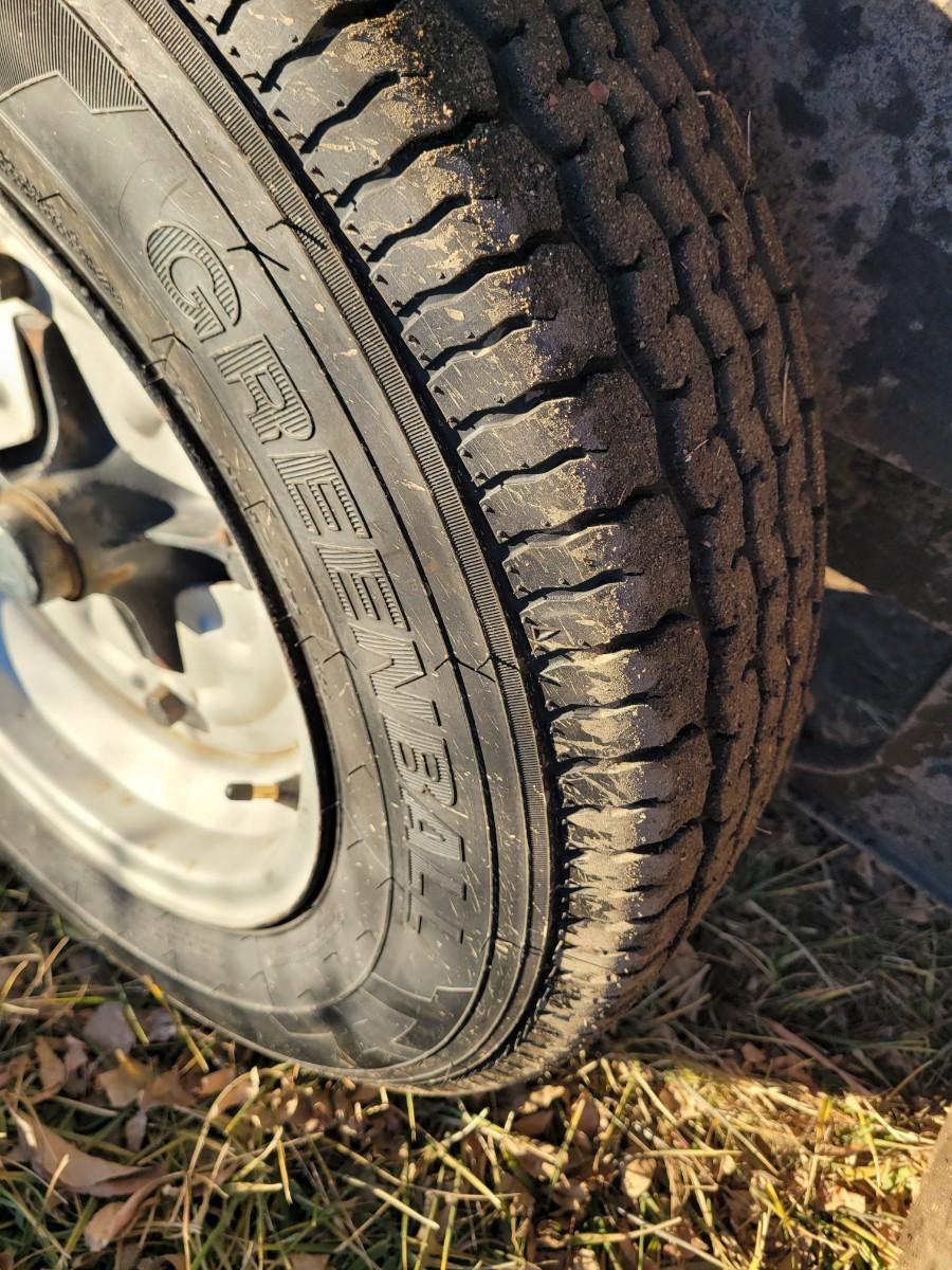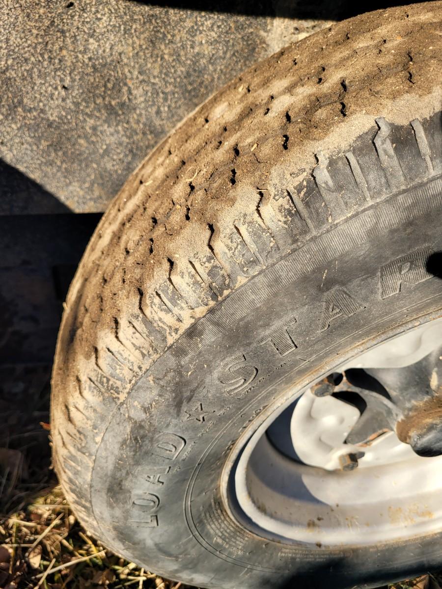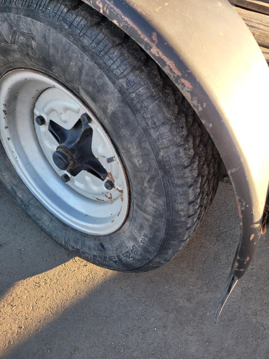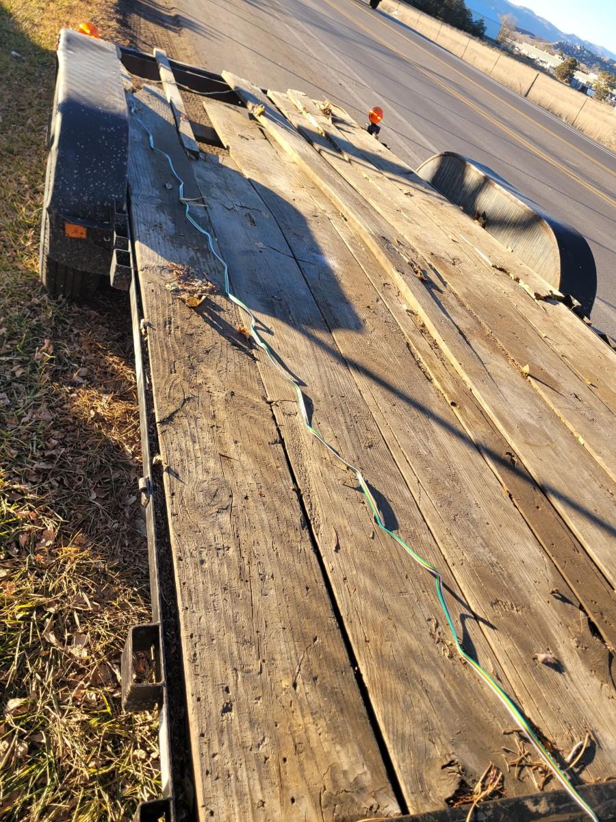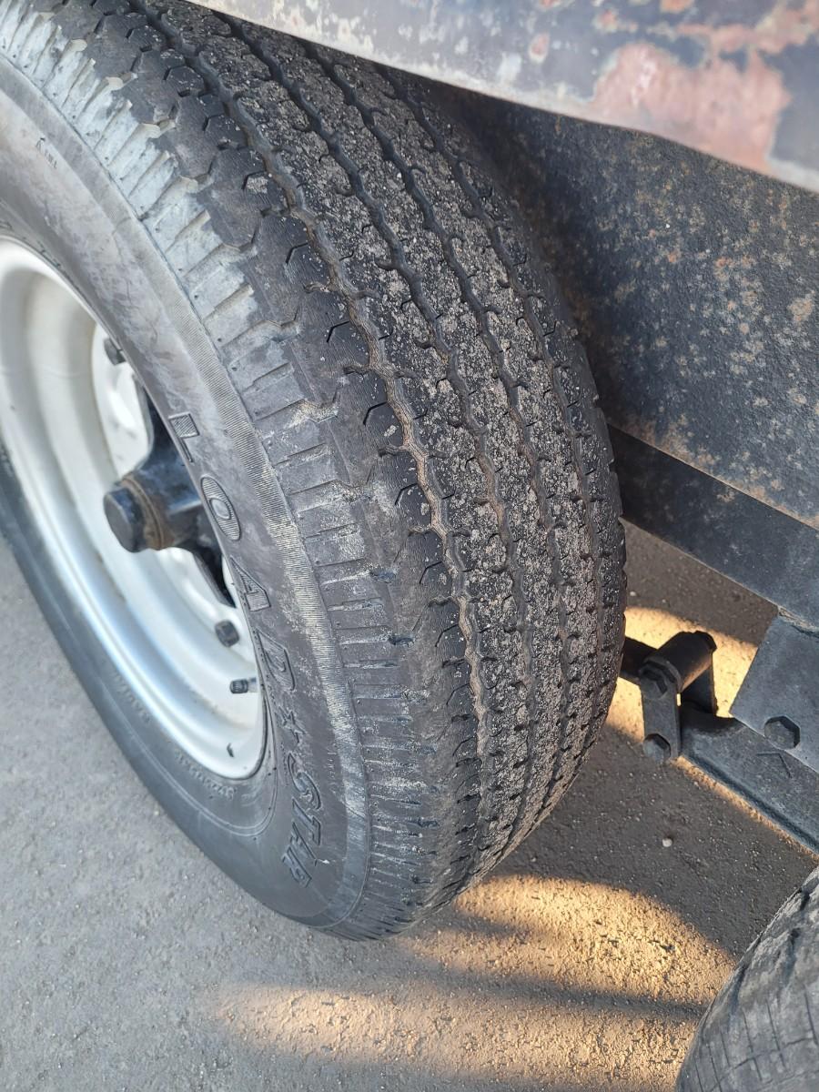 Trailer measures 17 feet long with an additional four foot tongue. Some of the lights work but this is definitely a project, needs decking and wiring and the jack does not go down. The good news is that it has one brand new tire that I put on and paid for in order to move the trailer, and that's where we're starting the bidding. Comes with the auxiliary removable magnetic lights. Two inch ball. Measures 6'3" between wheel wells