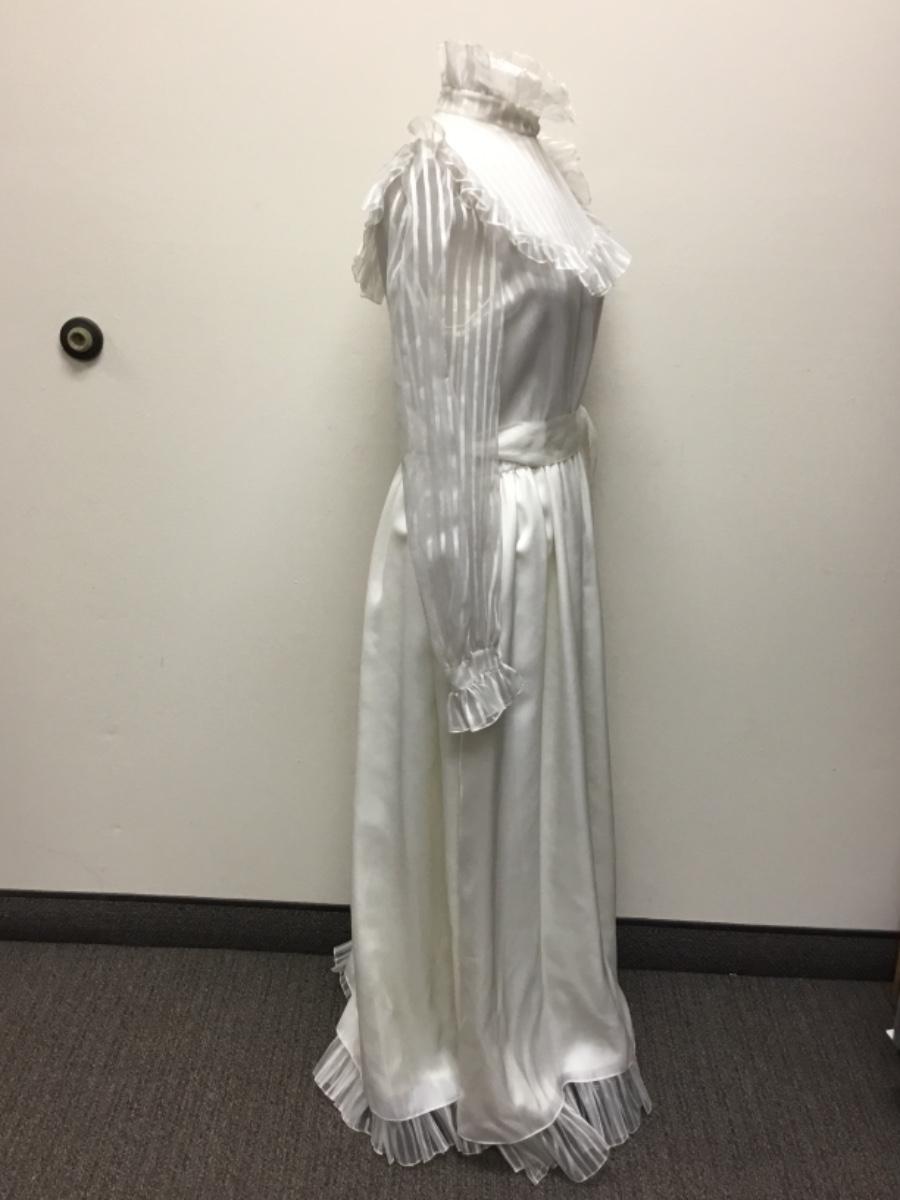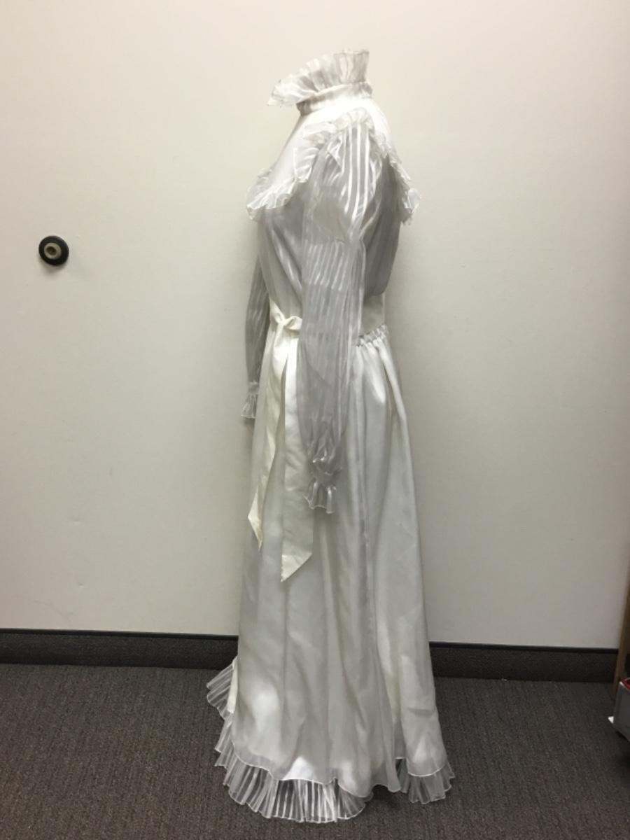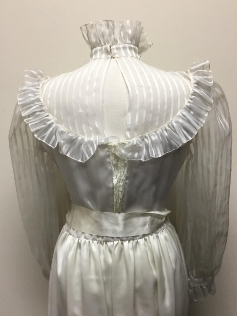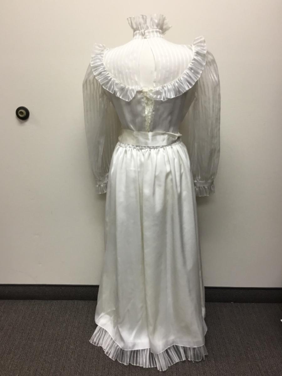 Size is most likely a medium. The sleeves have clips on the end. Comes with a ribbon to tie around the waist. There is lace on the back.