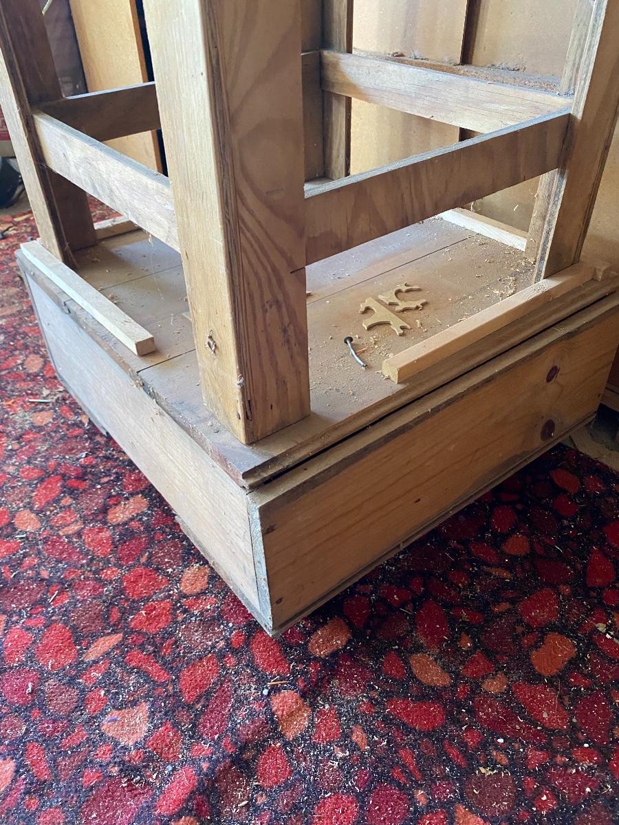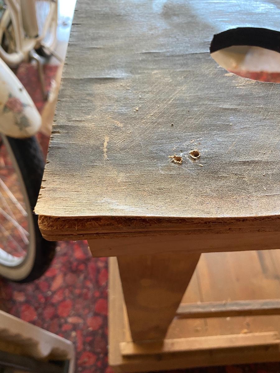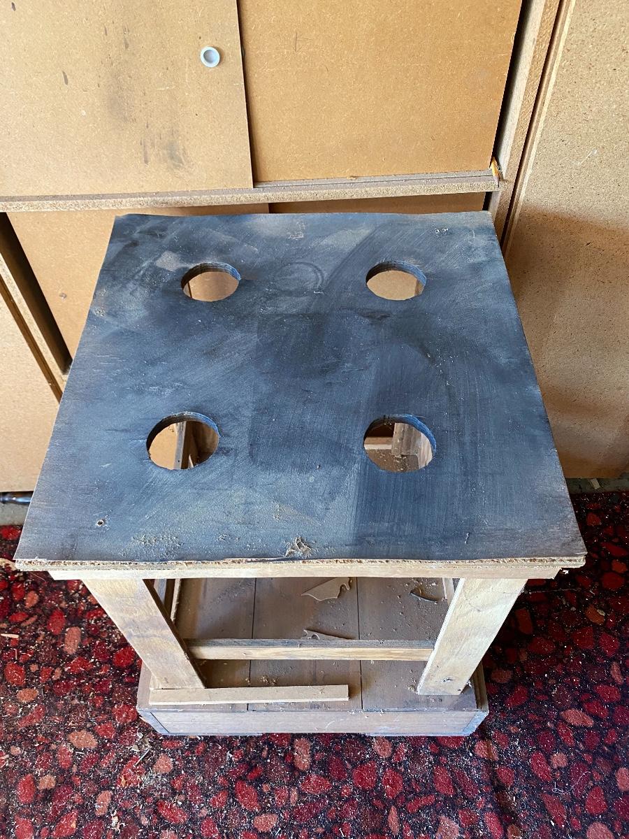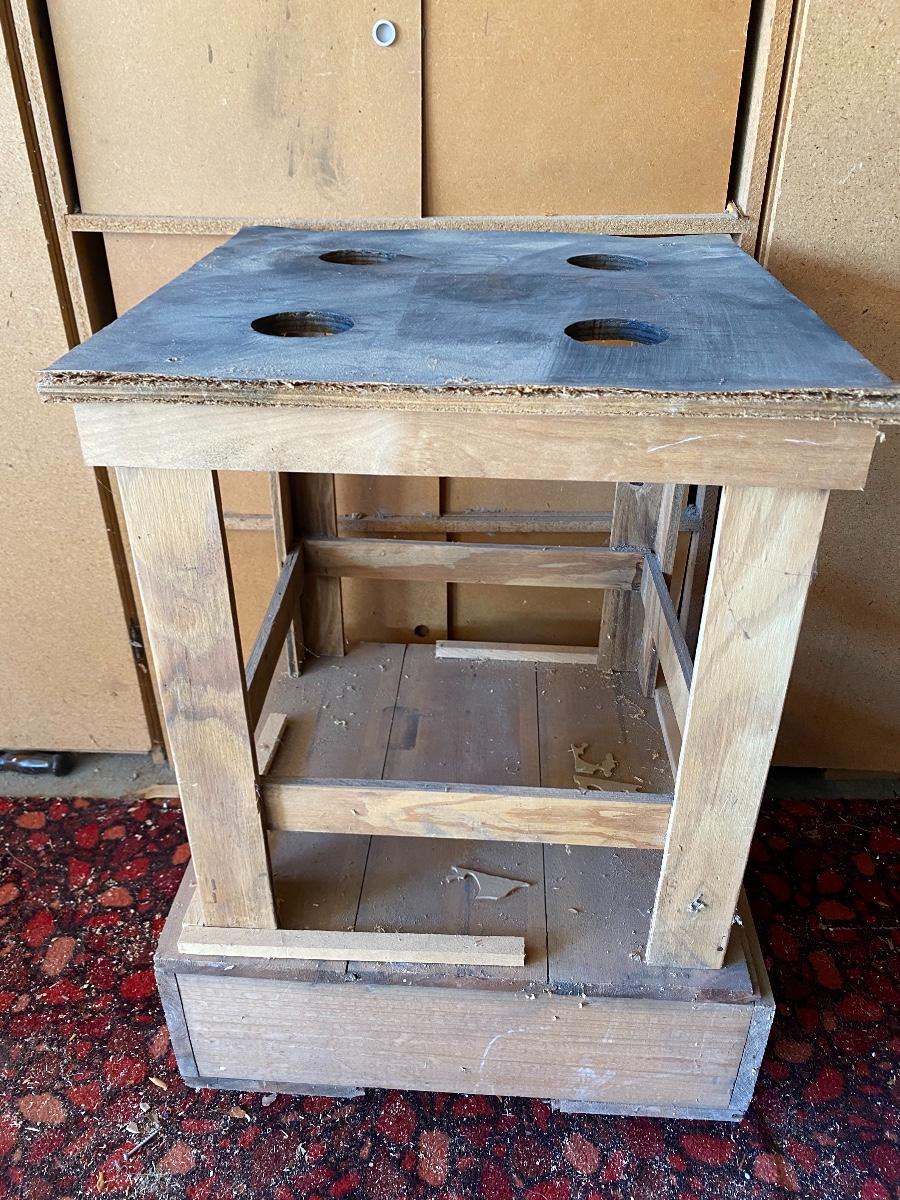 Homemade would rolling workbench cart. Top piece comes off rolling cart base.