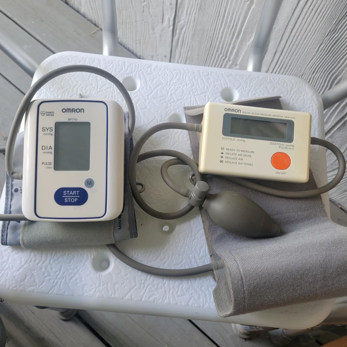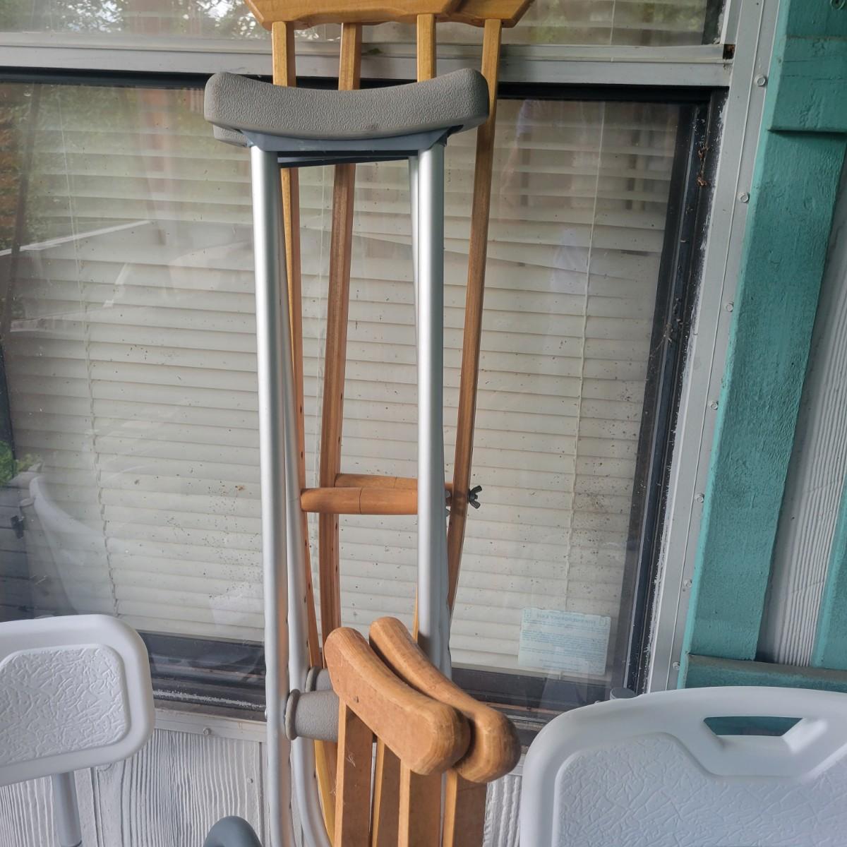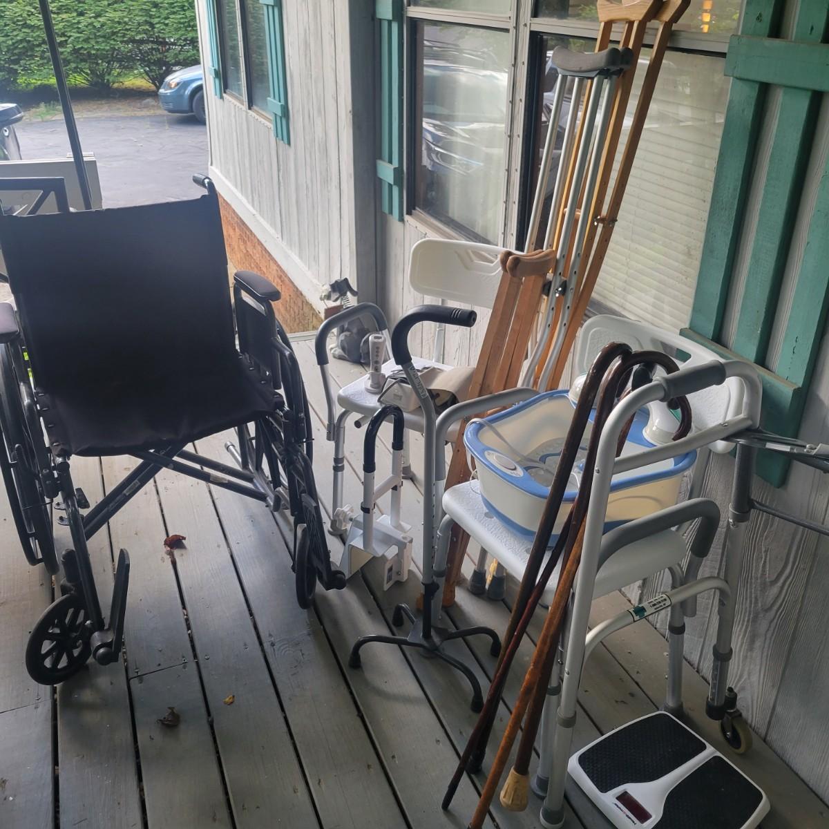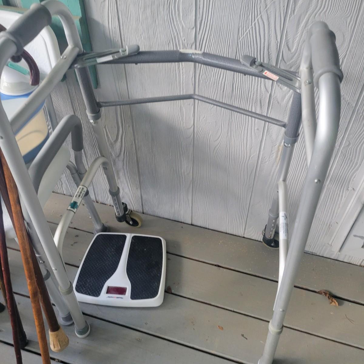An assortment of ambulatory equipment in good condition. Two automatic blood pressure cuffs, crutches, canes, a walker and a scale. Safety bars for the bathroom and bed, a Homemedic foot spa, two shower chairs and a wheelchair. Local pickup only
