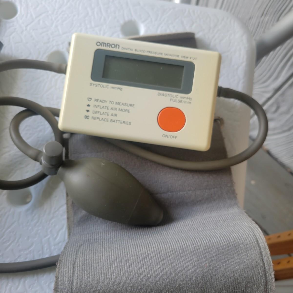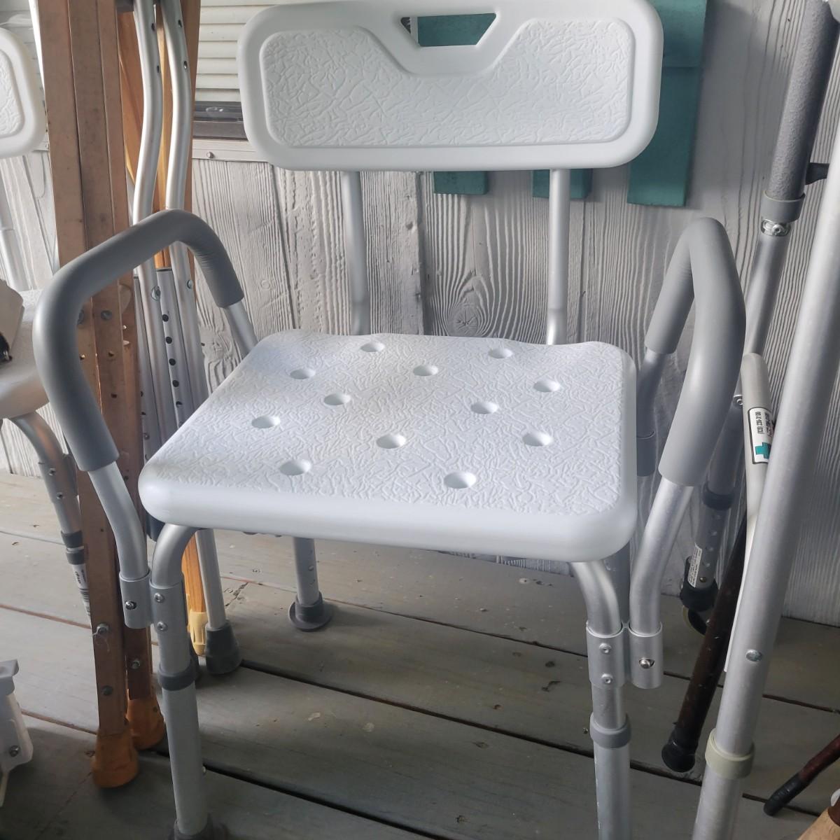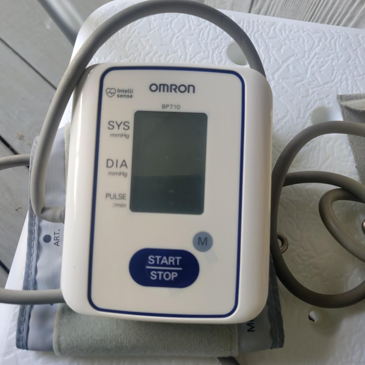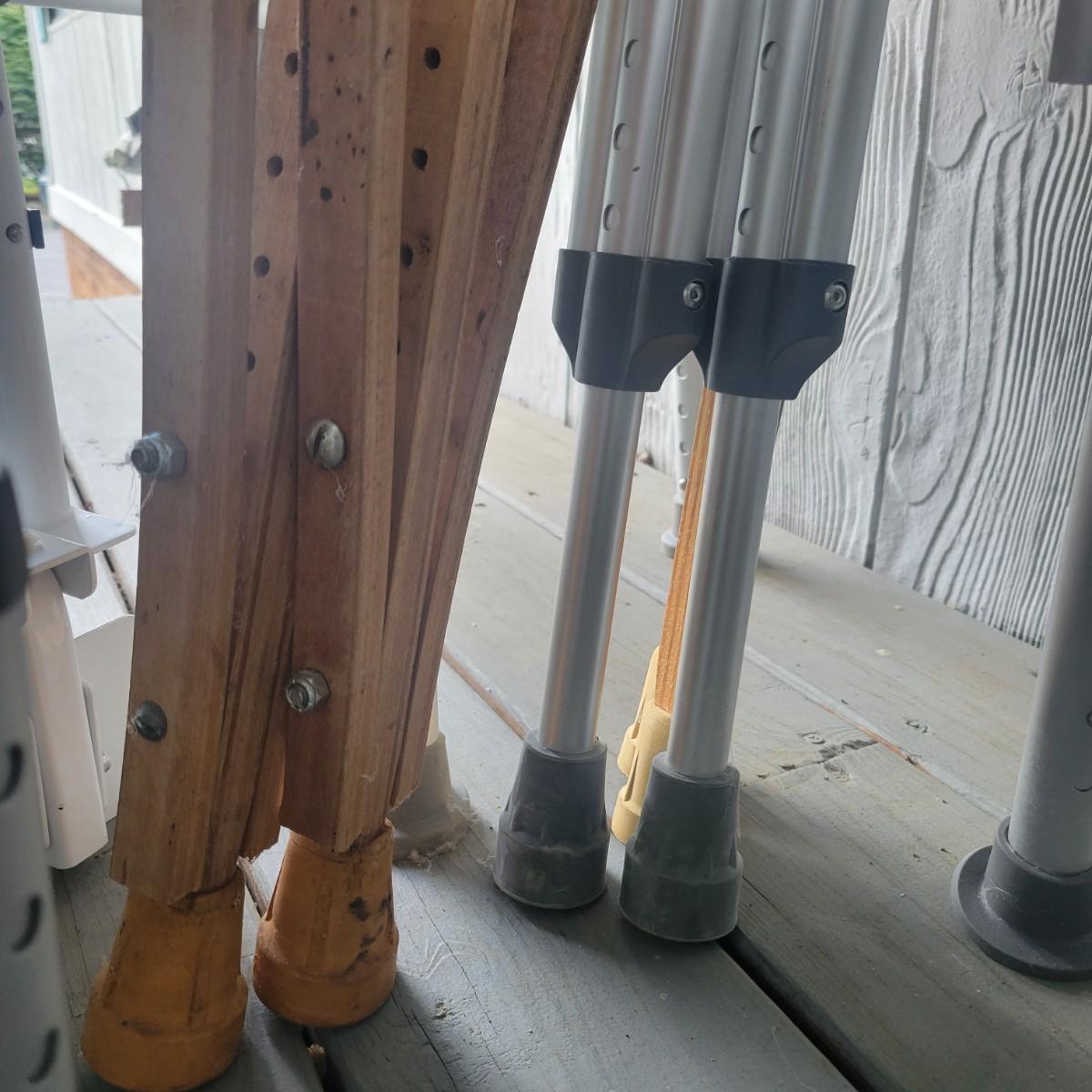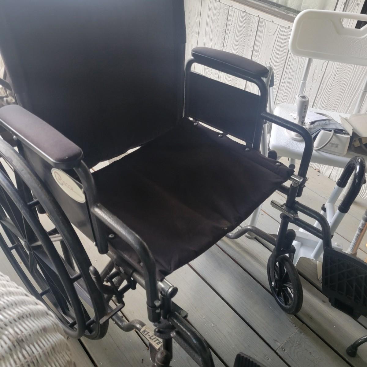 An assortment of ambulatory equipment in good condition. Two automatic blood pressure cuffs, crutches, canes, a walker and a scale. Safety bars for the bathroom and bed, a Homemedic foot spa, two shower chairs and a wheelchair. Local pickup only