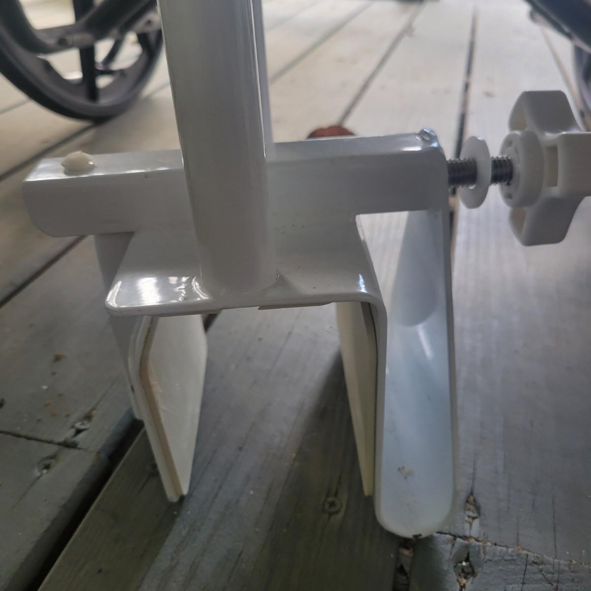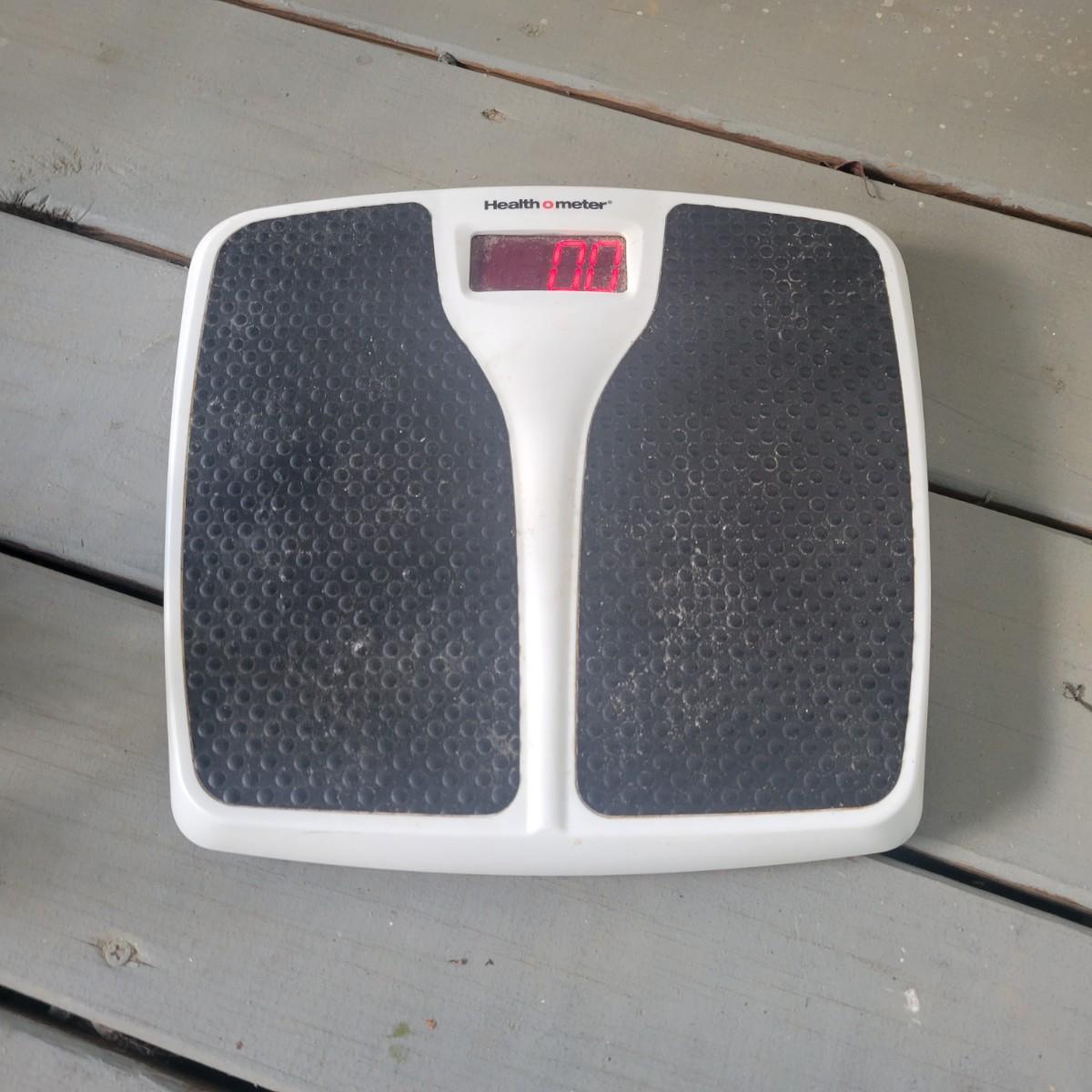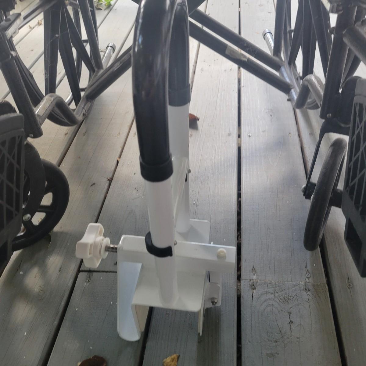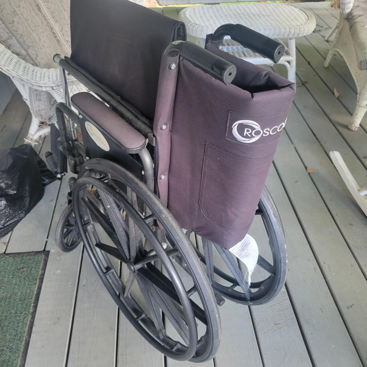 An assortment of ambulatory equipment in good condition. Two automatic blood pressure cuffs, crutches, canes, a walker and a scale. Safety bars for the bathroom and bed, a Homemedic foot spa, two shower chairs and a wheelchair. Local pickup only