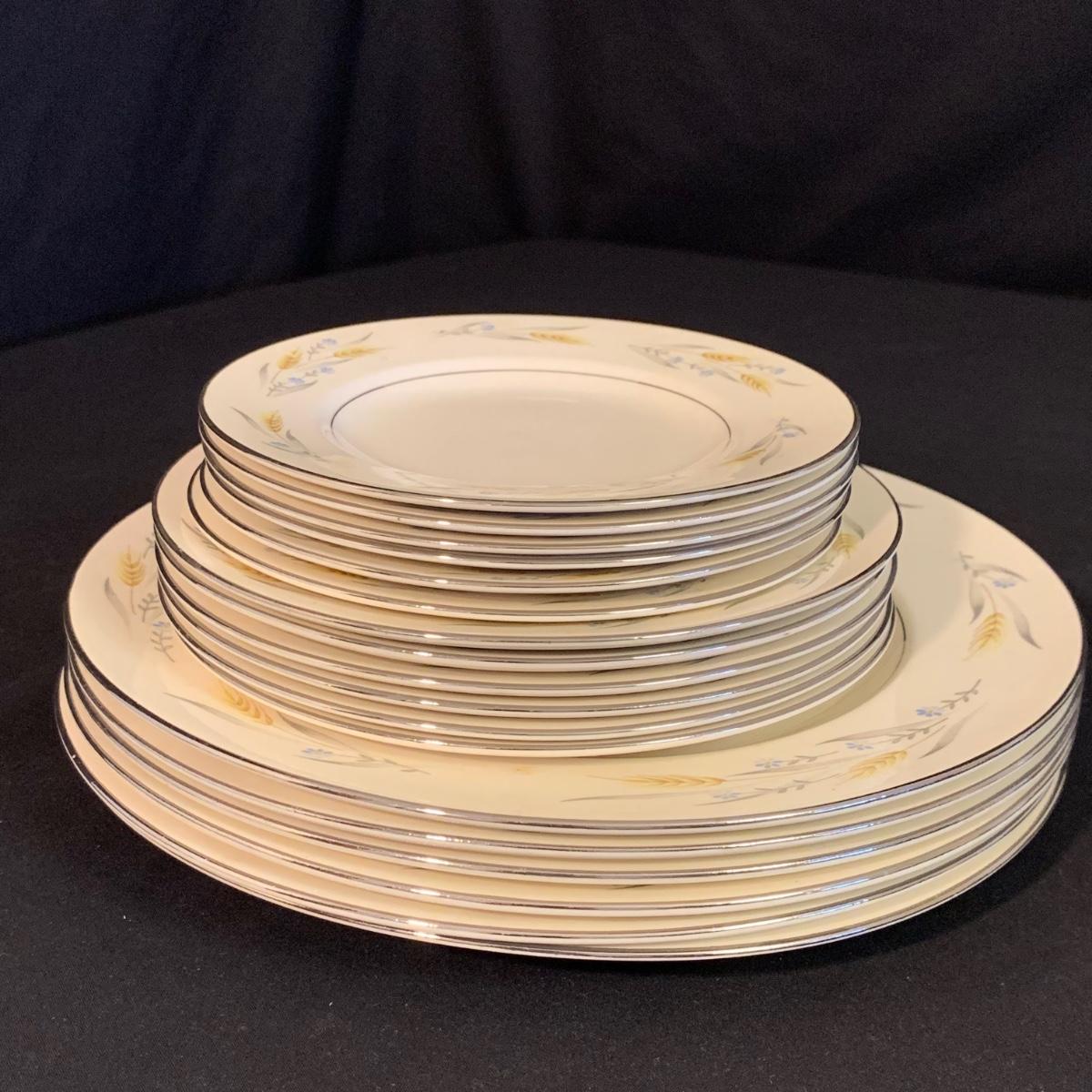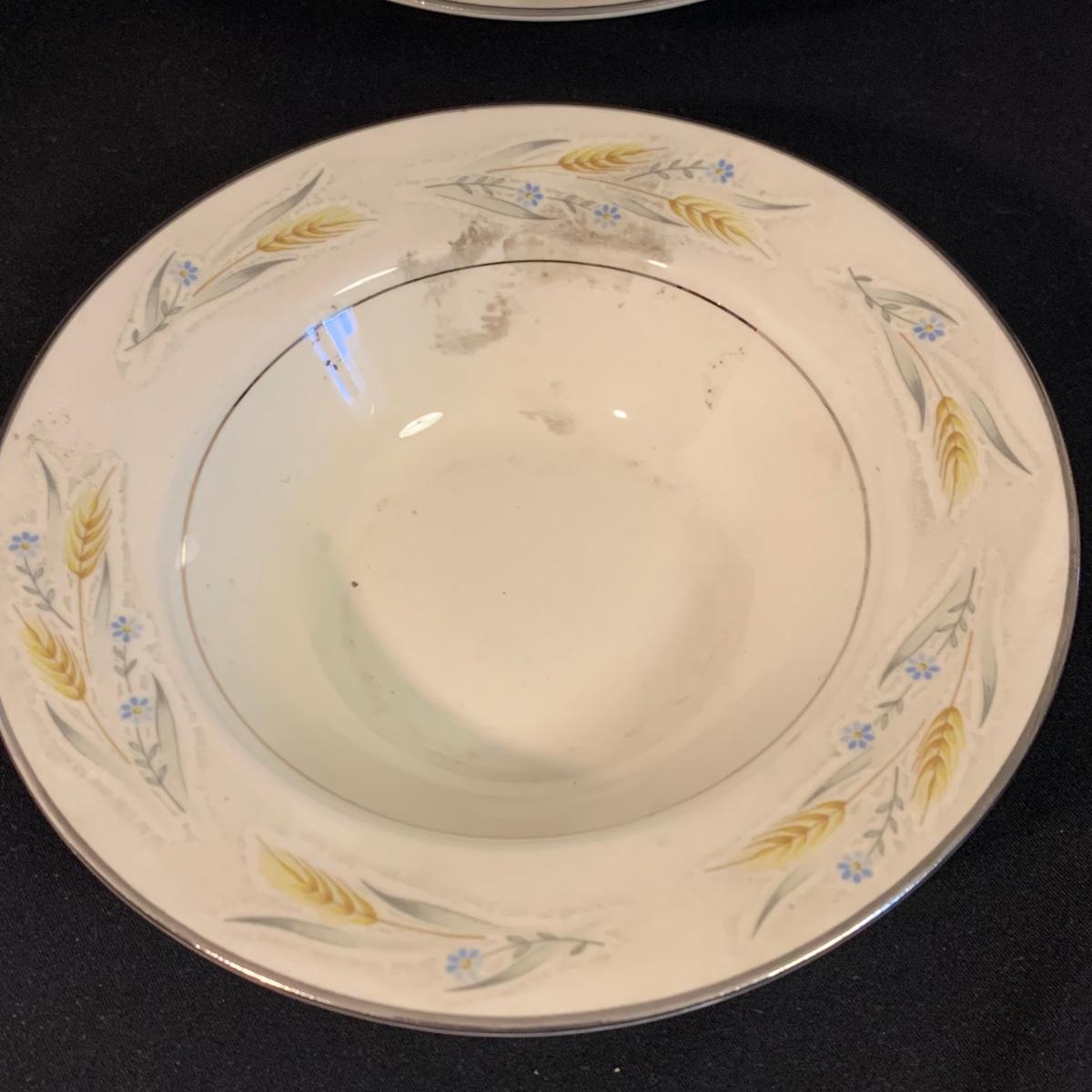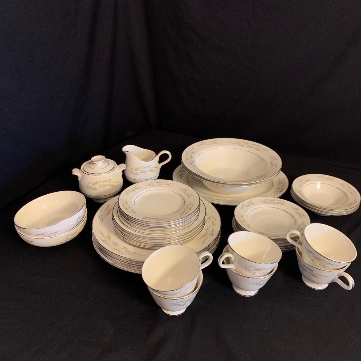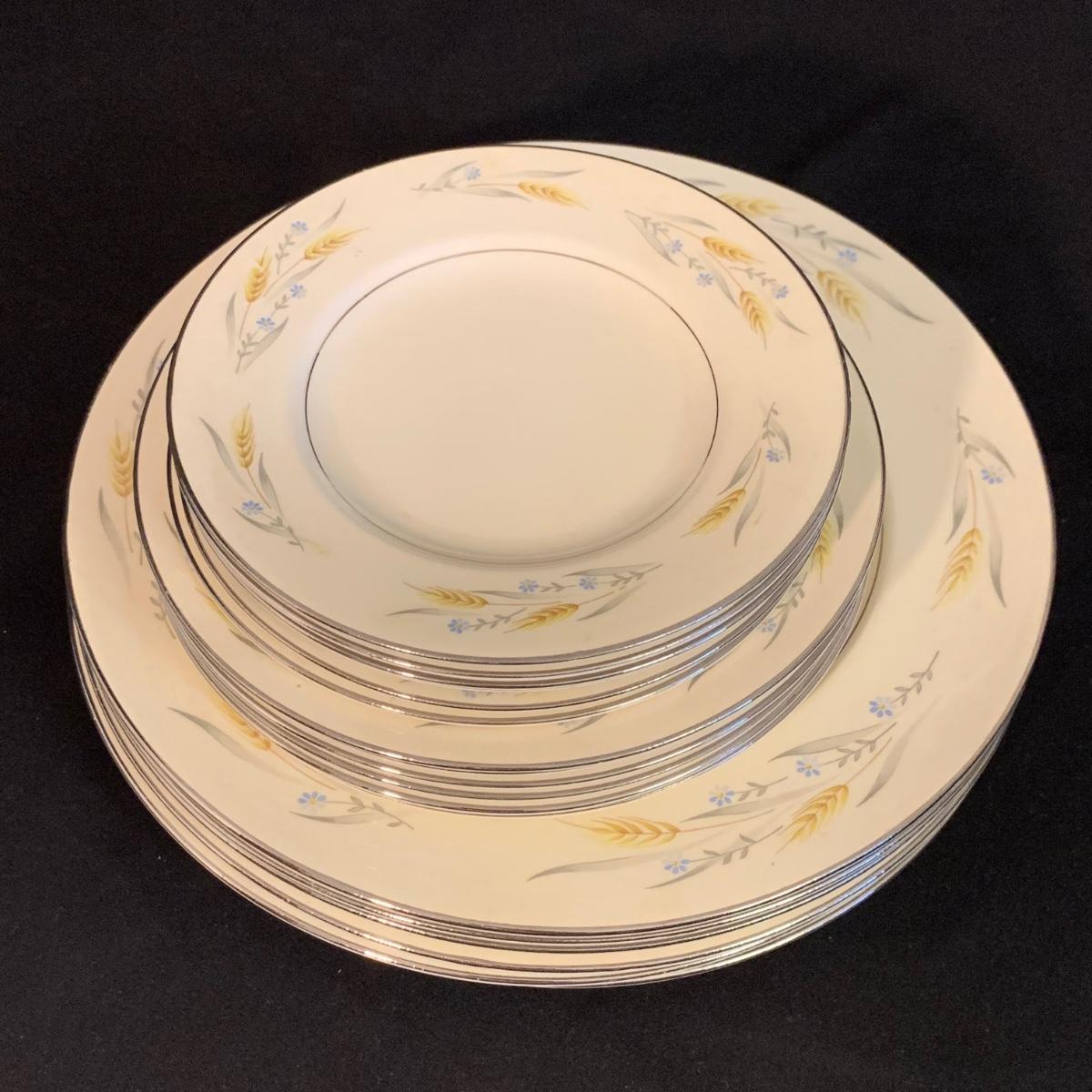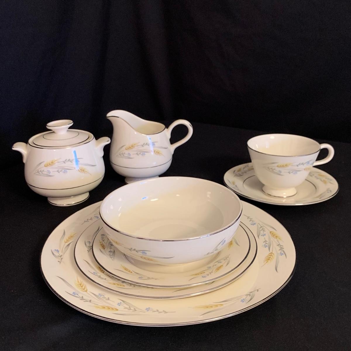 Homer Laughlin Cavalier Eggshell China set featuring silver rims and a wheat design. A 40-piece set with six each of: 10.25”D plates, 7.25”D plates, 6.25”D plates, cups, and saucers. Two large bowls, three smaller bowls, one oval serving plate, as well as a cream and sugar set are also included. The set is slightly dusty, but otherwise in good condition. No chips or cracks were noted. Please note that the blue marks seen in some of the photos are just reflections and do not appear on the actual dishes.