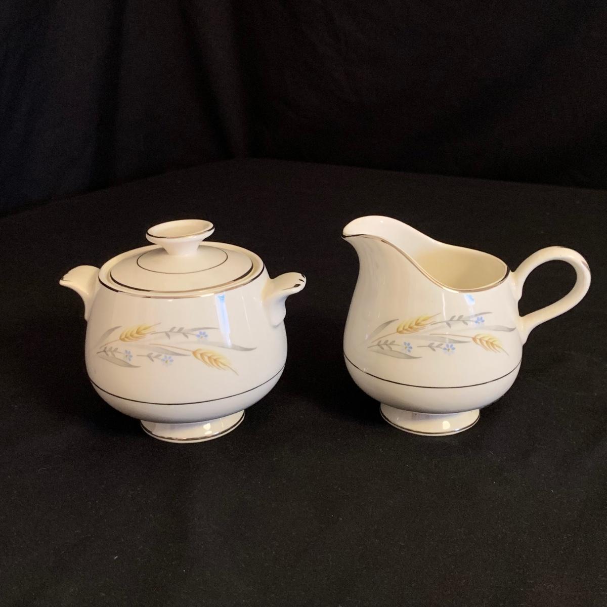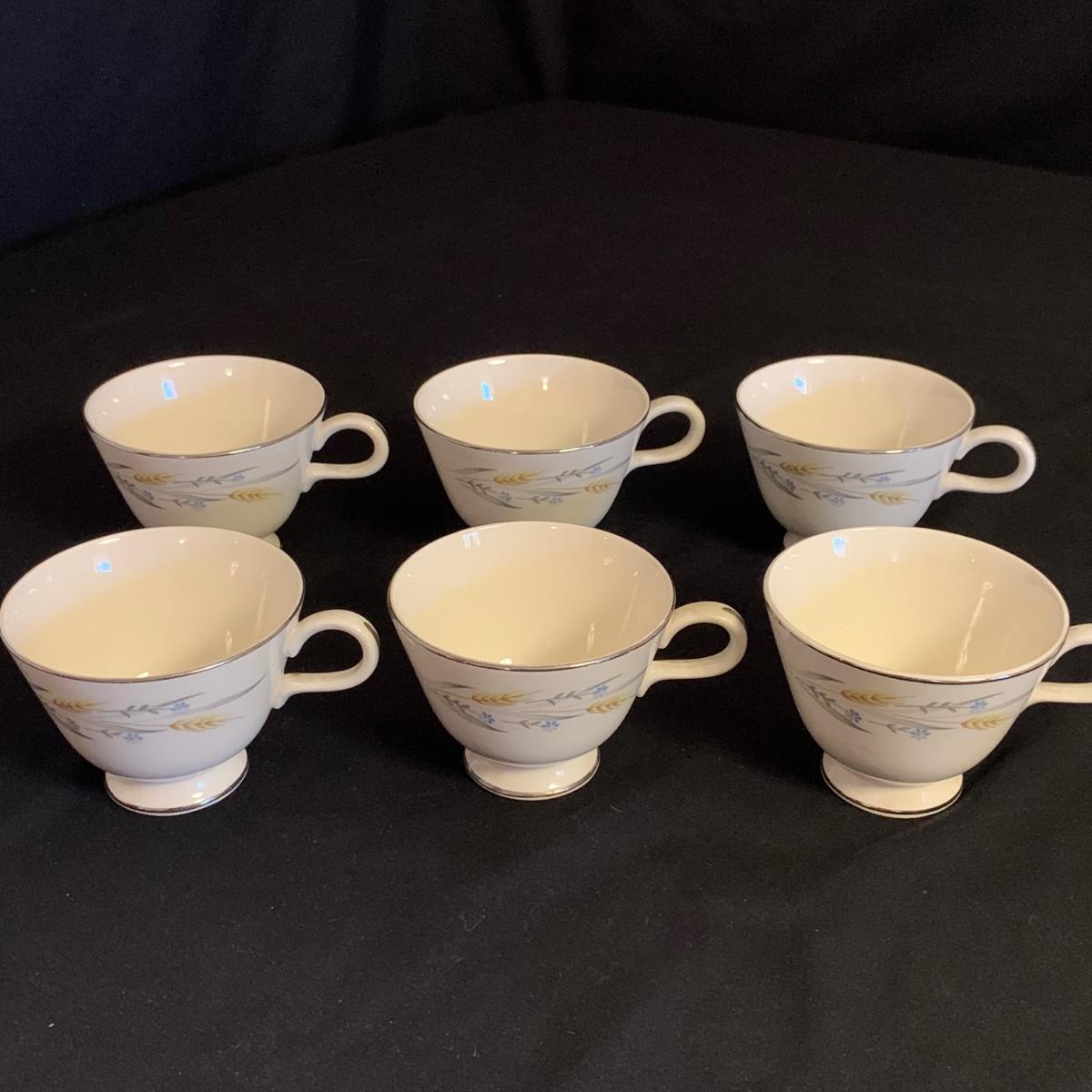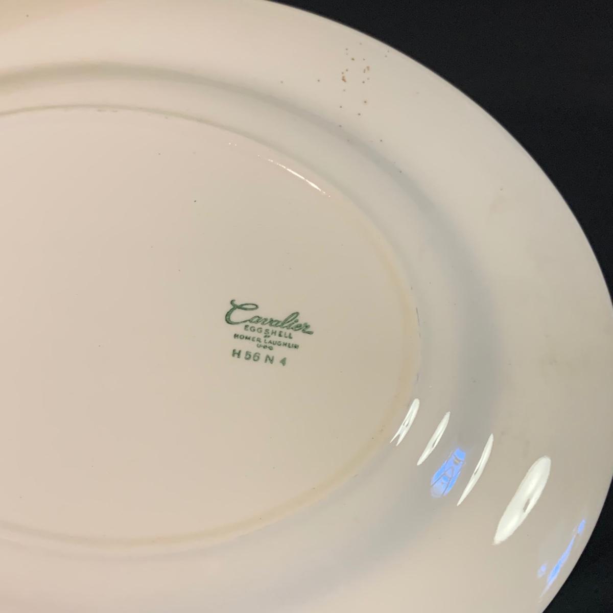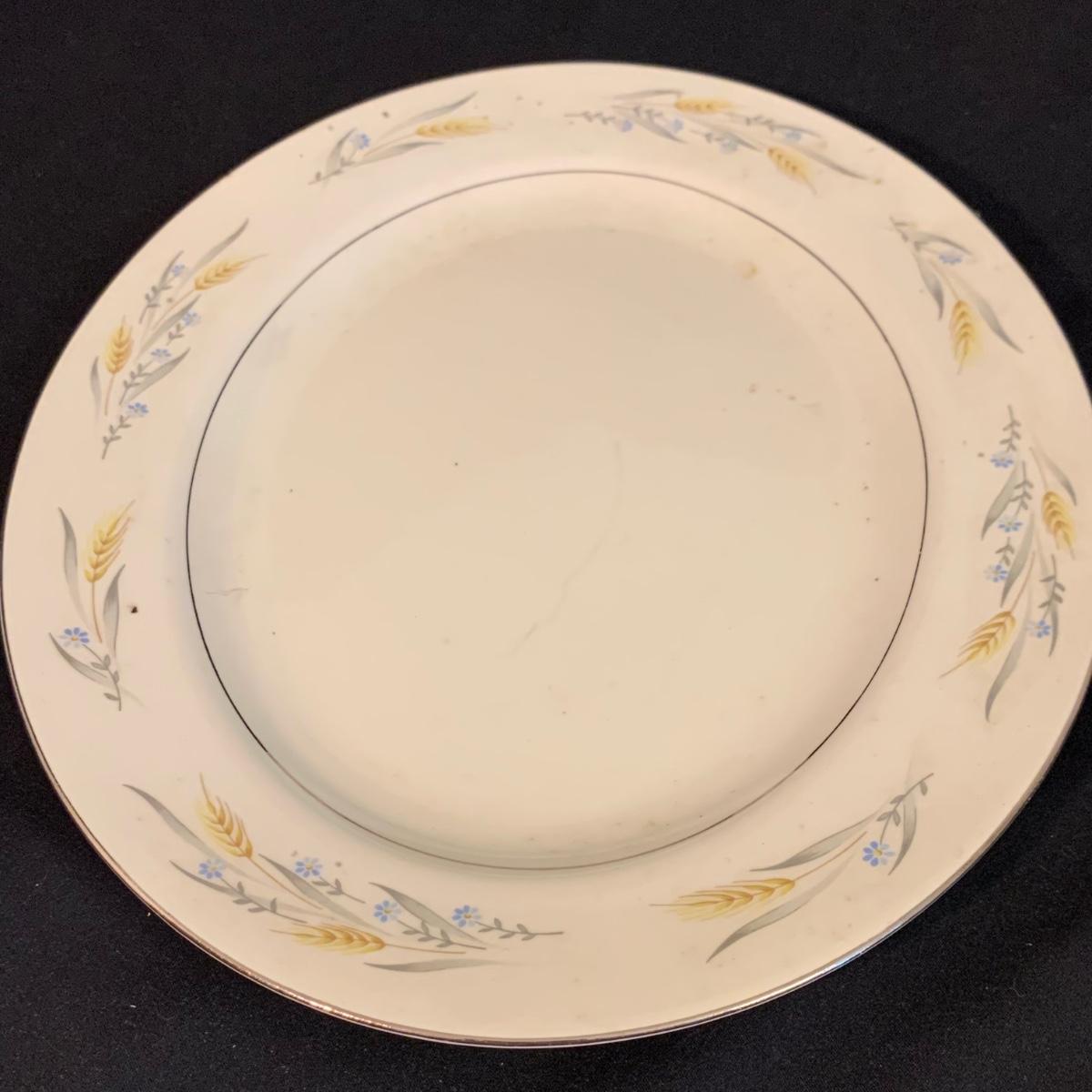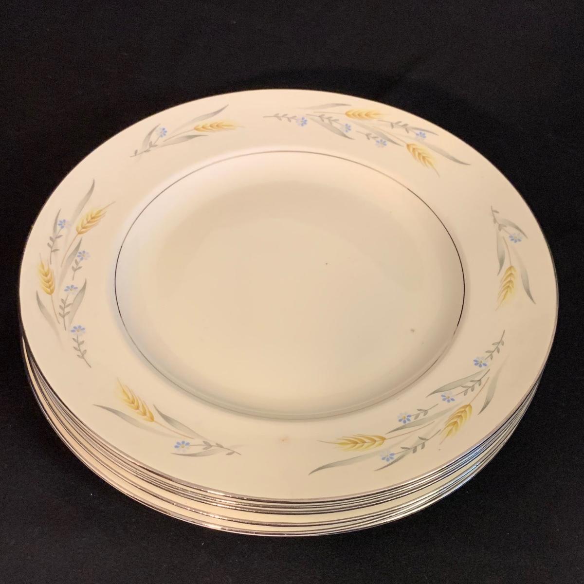 Homer Laughlin Cavalier Eggshell China set featuring silver rims and a wheat design. A 40-piece set with six each of: 10.25”D plates, 7.25”D plates, 6.25”D plates, cups, and saucers. Two large bowls, three smaller bowls, one oval serving plate, as well as a cream and sugar set are also included. The set is slightly dusty, but otherwise in good condition. No chips or cracks were noted. Please note that the blue marks seen in some of the photos are just reflections and do not appear on the actual dishes.