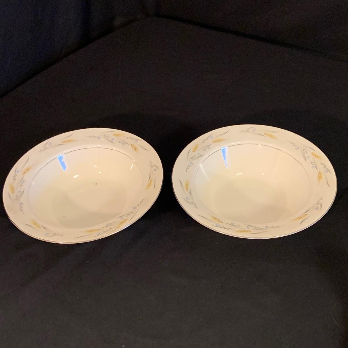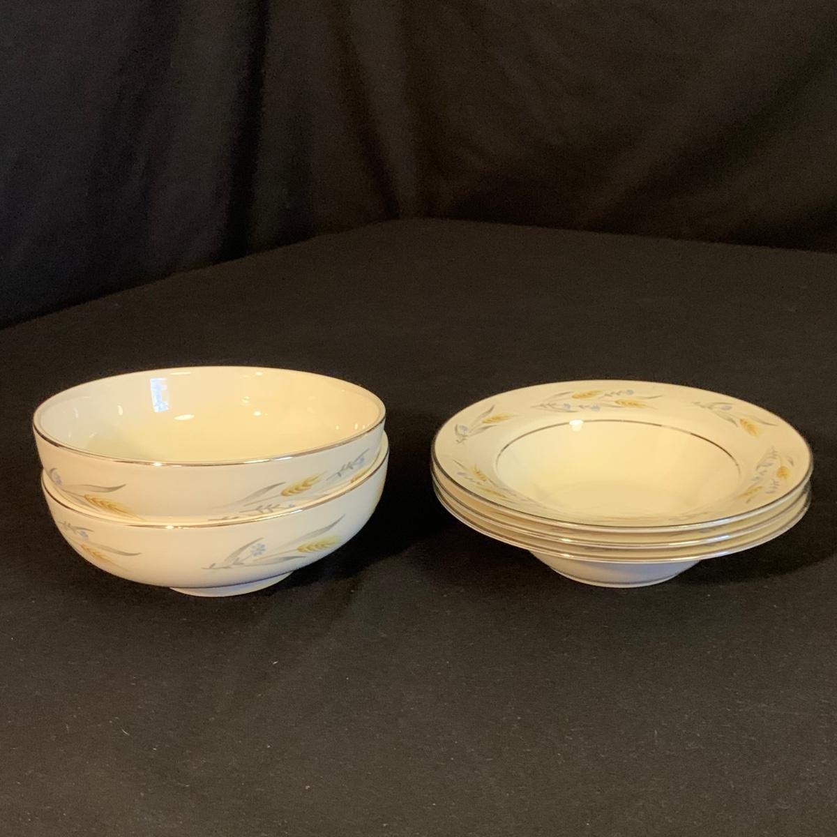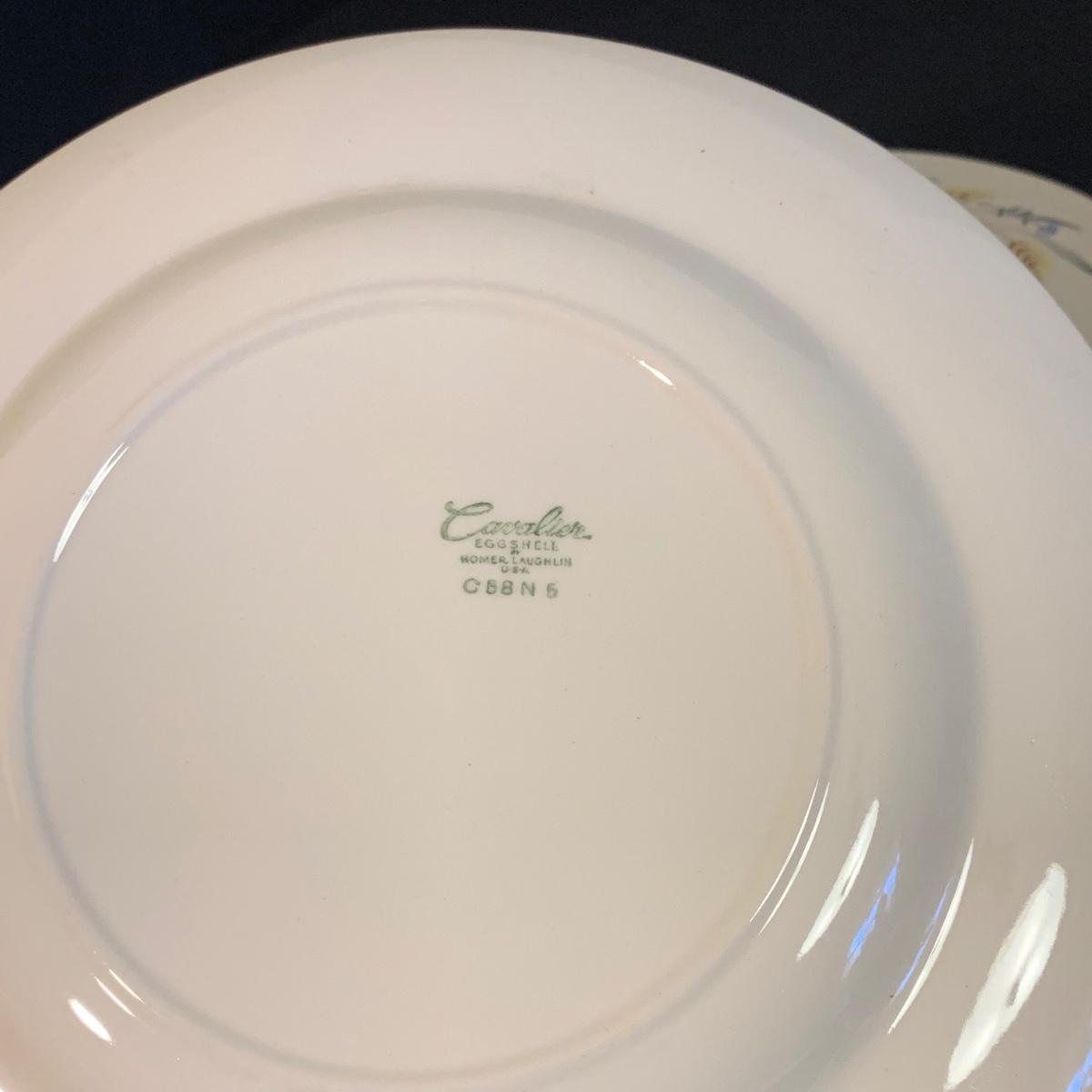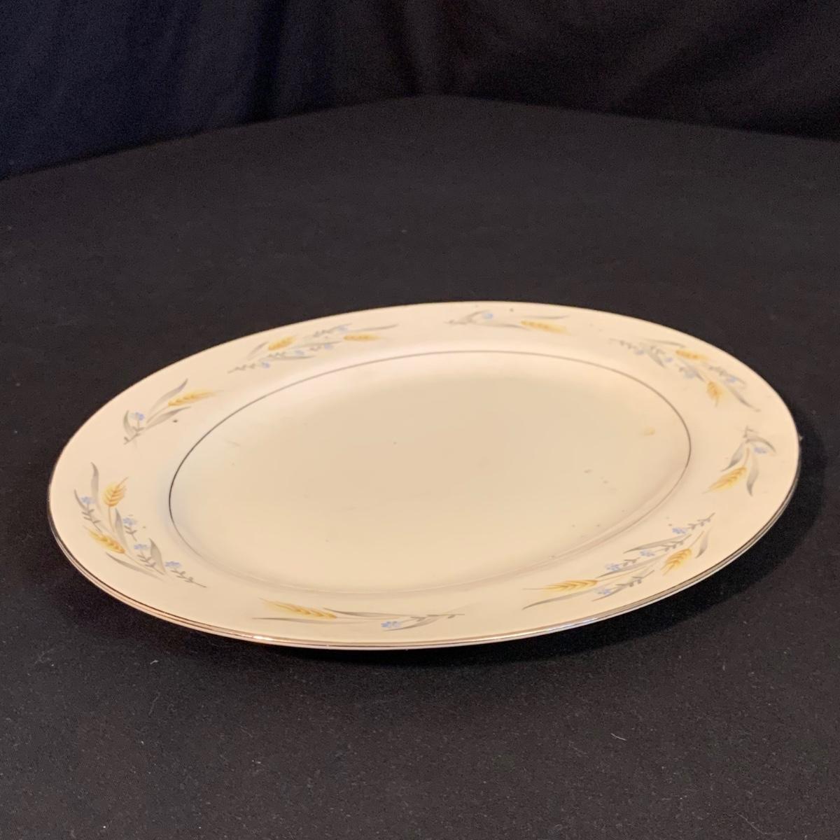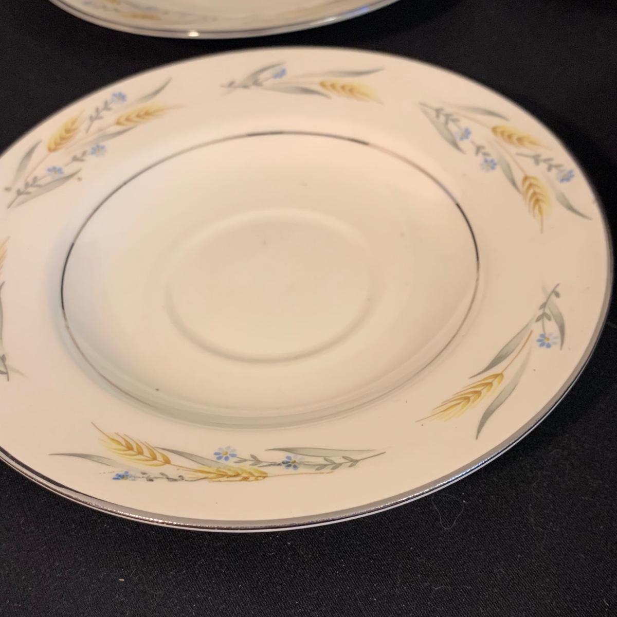 Homer Laughlin Cavalier Eggshell China set featuring silver rims and a wheat design. A 40-piece set with six each of: 10.25”D plates, 7.25”D plates, 6.25”D plates, cups, and saucers. Two large bowls, three smaller bowls, one oval serving plate, as well as a cream and sugar set are also included. The set is slightly dusty, but otherwise in good condition. No chips or cracks were noted. Please note that the blue marks seen in some of the photos are just reflections and do not appear on the actual dishes.