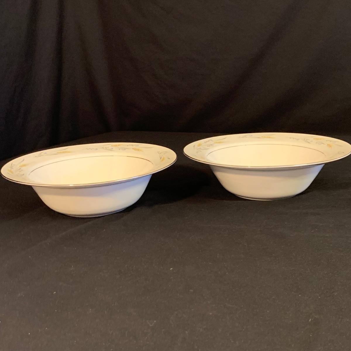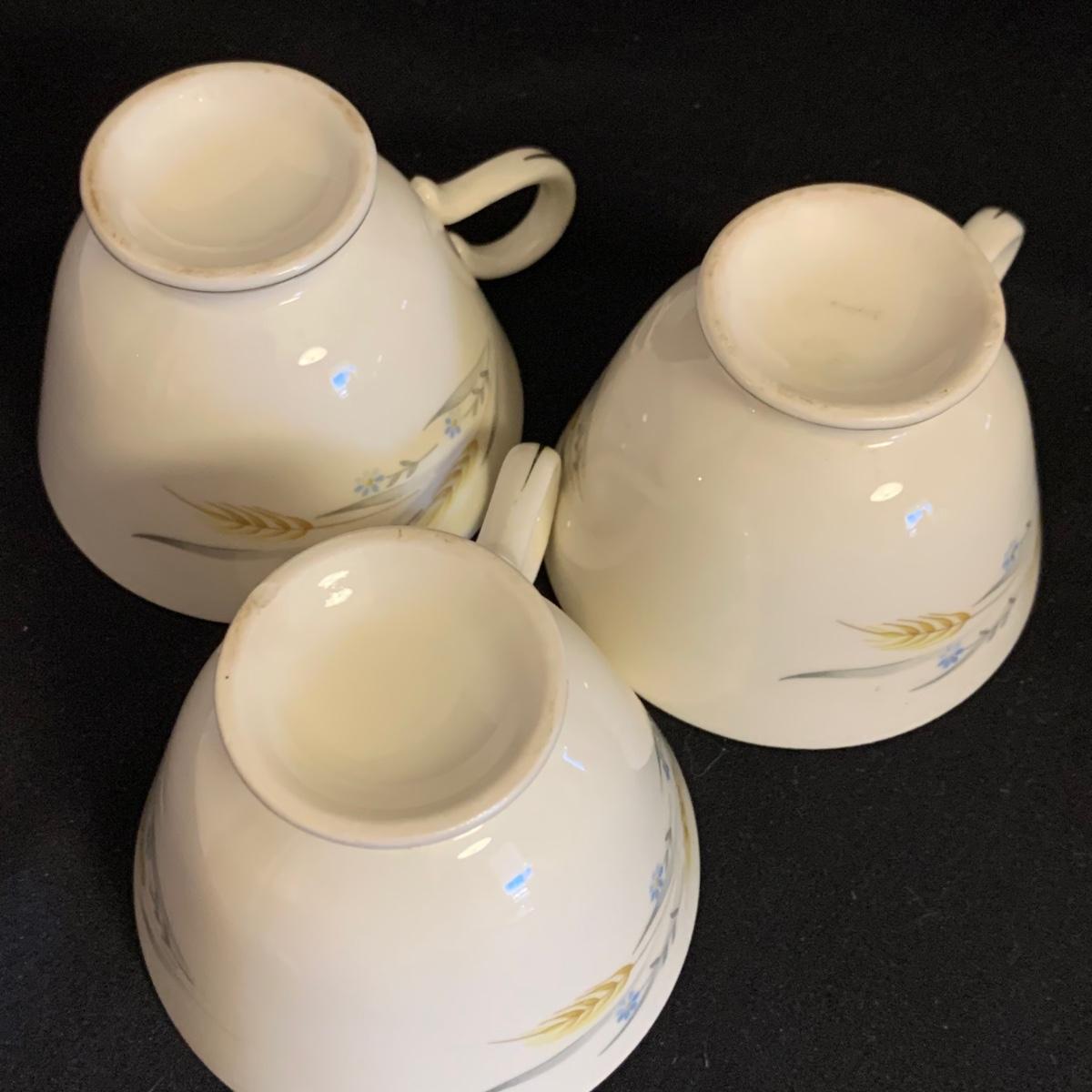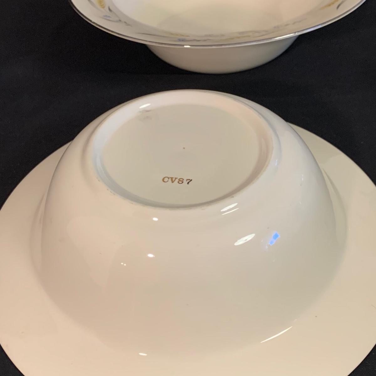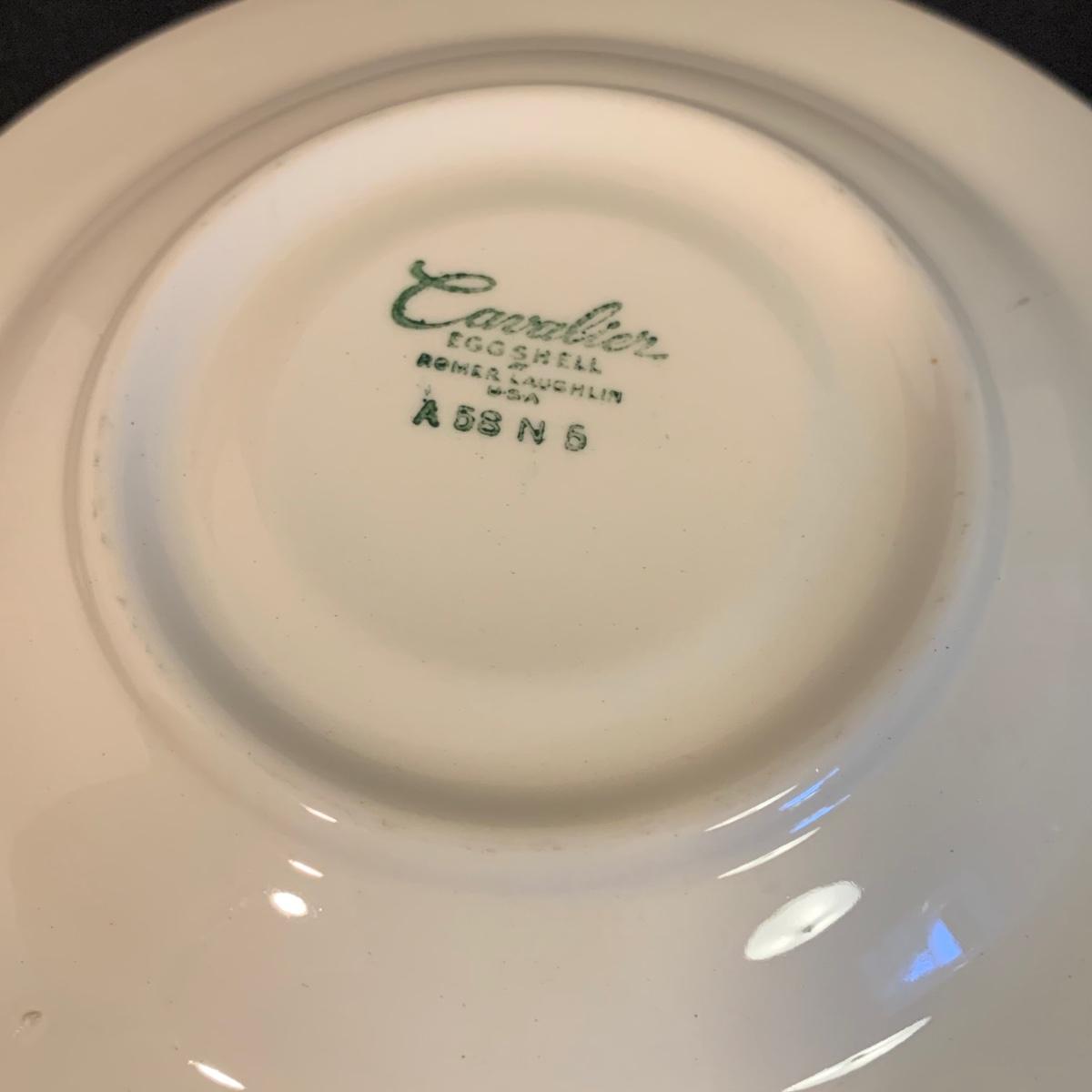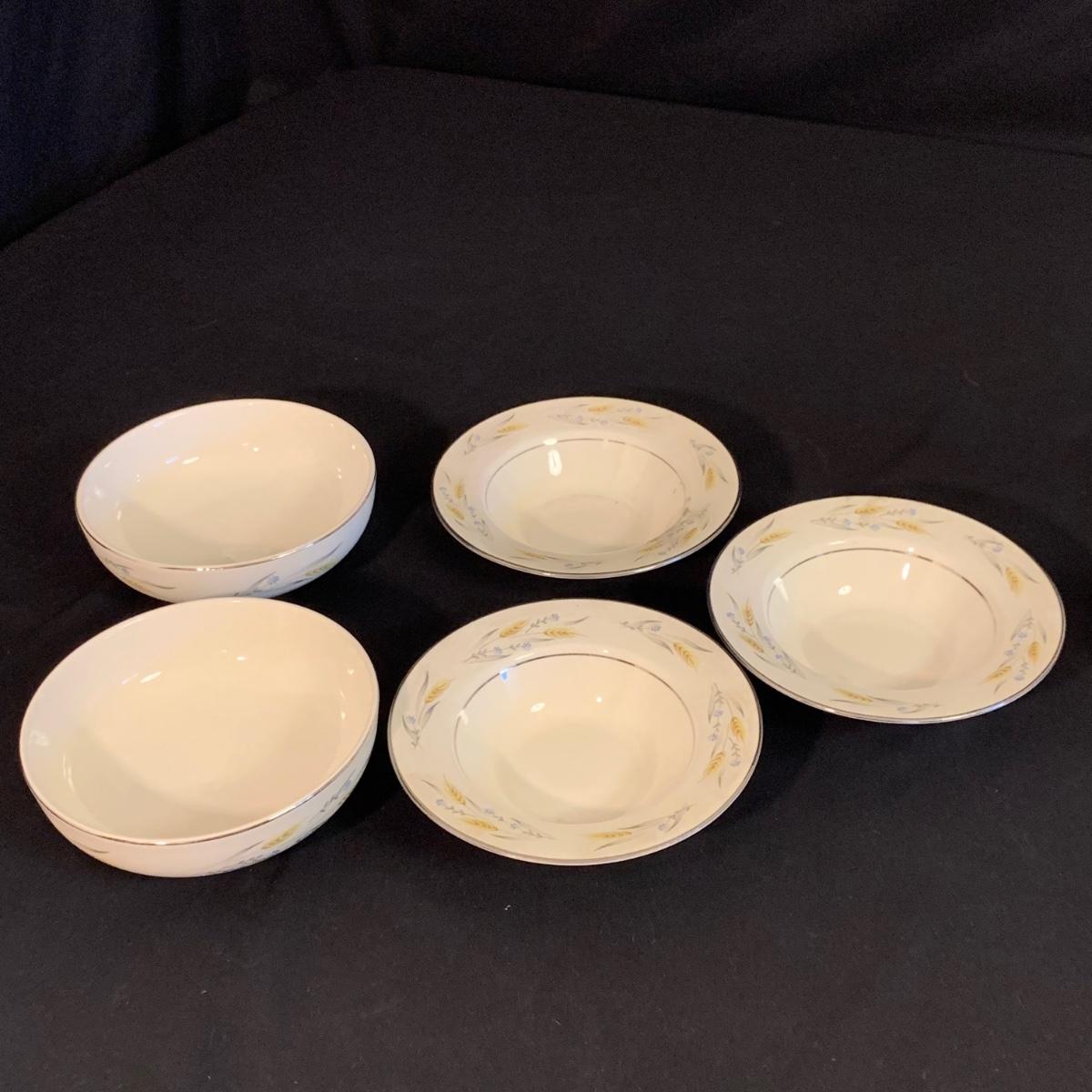 Homer Laughlin Cavalier Eggshell China set featuring silver rims and a wheat design. A 40-piece set with six each of: 10.25”D plates, 7.25”D plates, 6.25”D plates, cups, and saucers. Two large bowls, three smaller bowls, one oval serving plate, as well as a cream and sugar set are also included. The set is slightly dusty, but otherwise in good condition. No chips or cracks were noted. Please note that the blue marks seen in some of the photos are just reflections and do not appear on the actual dishes.