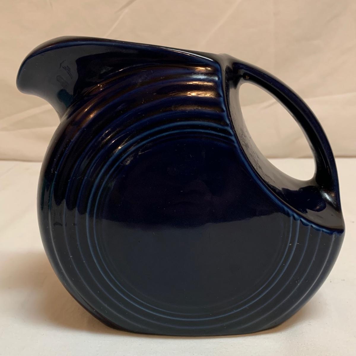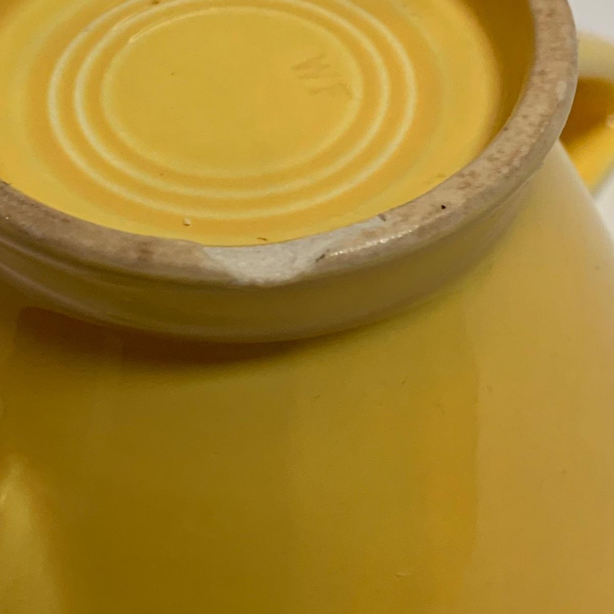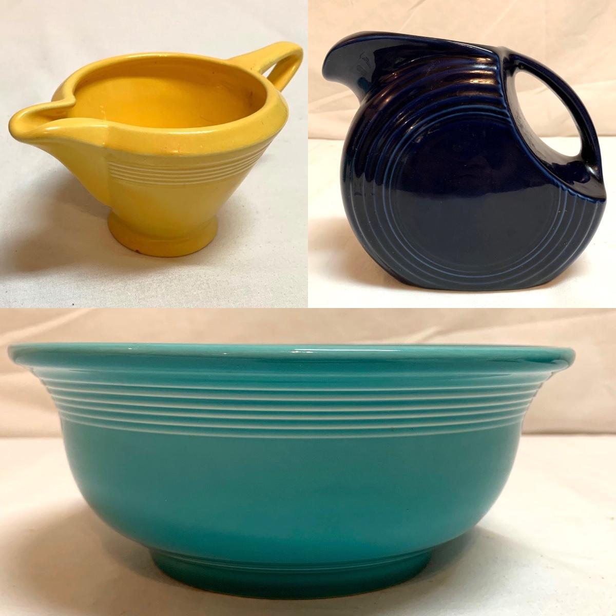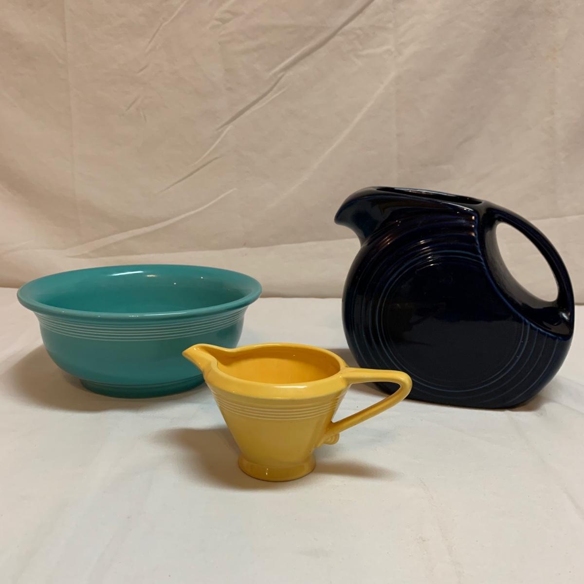 Three items in this lot: a Homer Laughlin Fiesta Ware 9” turquoise bowl, a dark blue Fiesta Ware pitcher, and a small yellow pitcher in a similar style. The yellow pitcher has a ‘WF’ mark on the bottom, and also a small chip on the rim of the base. The blue pitcher has the ‘Fiesta’ mark on its base, but it’s dark and difficult to see. There is one spot on its spout that looks like the glaze has been scratched, see photo.