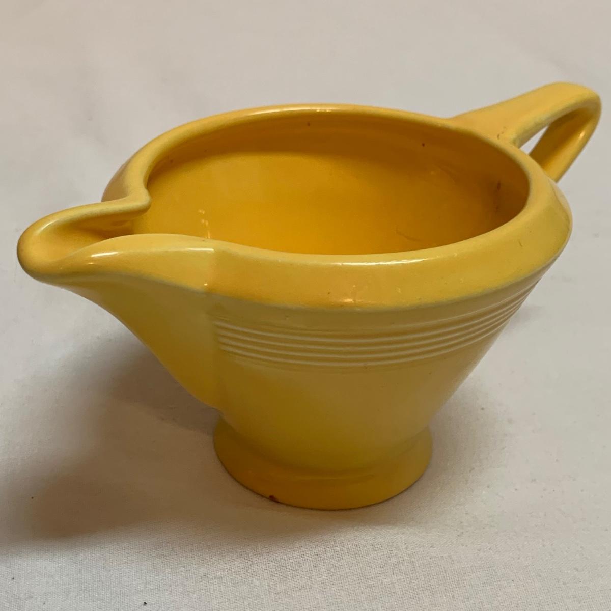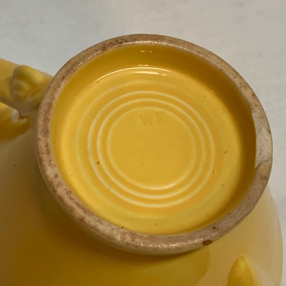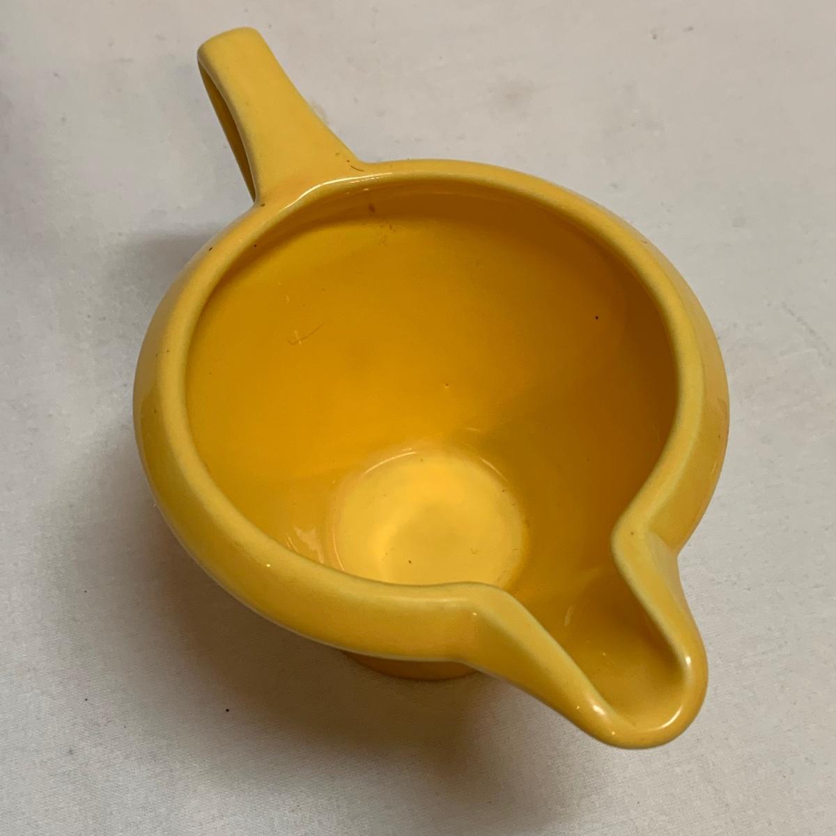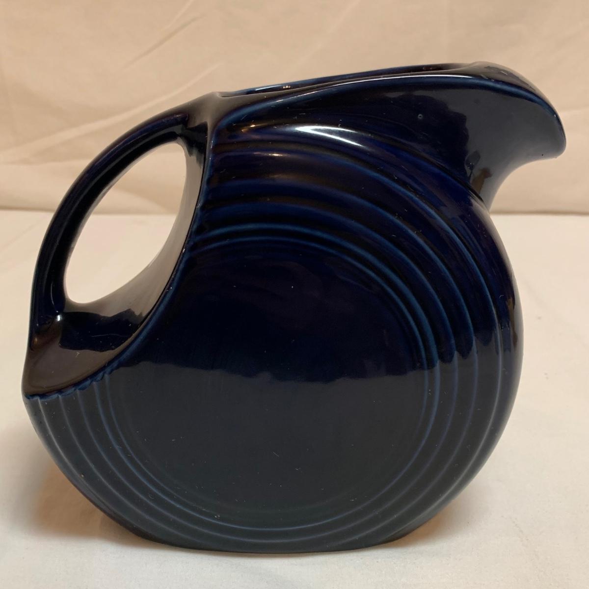 Three items in this lot: a Homer Laughlin Fiesta Ware 9” turquoise bowl, a dark blue Fiesta Ware pitcher, and a small yellow pitcher in a similar style. The yellow pitcher has a ‘WF’ mark on the bottom, and also a small chip on the rim of the base. The blue pitcher has the ‘Fiesta’ mark on its base, but it’s dark and difficult to see. There is one spot on its spout that looks like the glaze has been scratched, see photo.