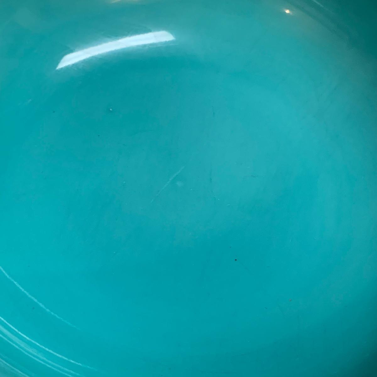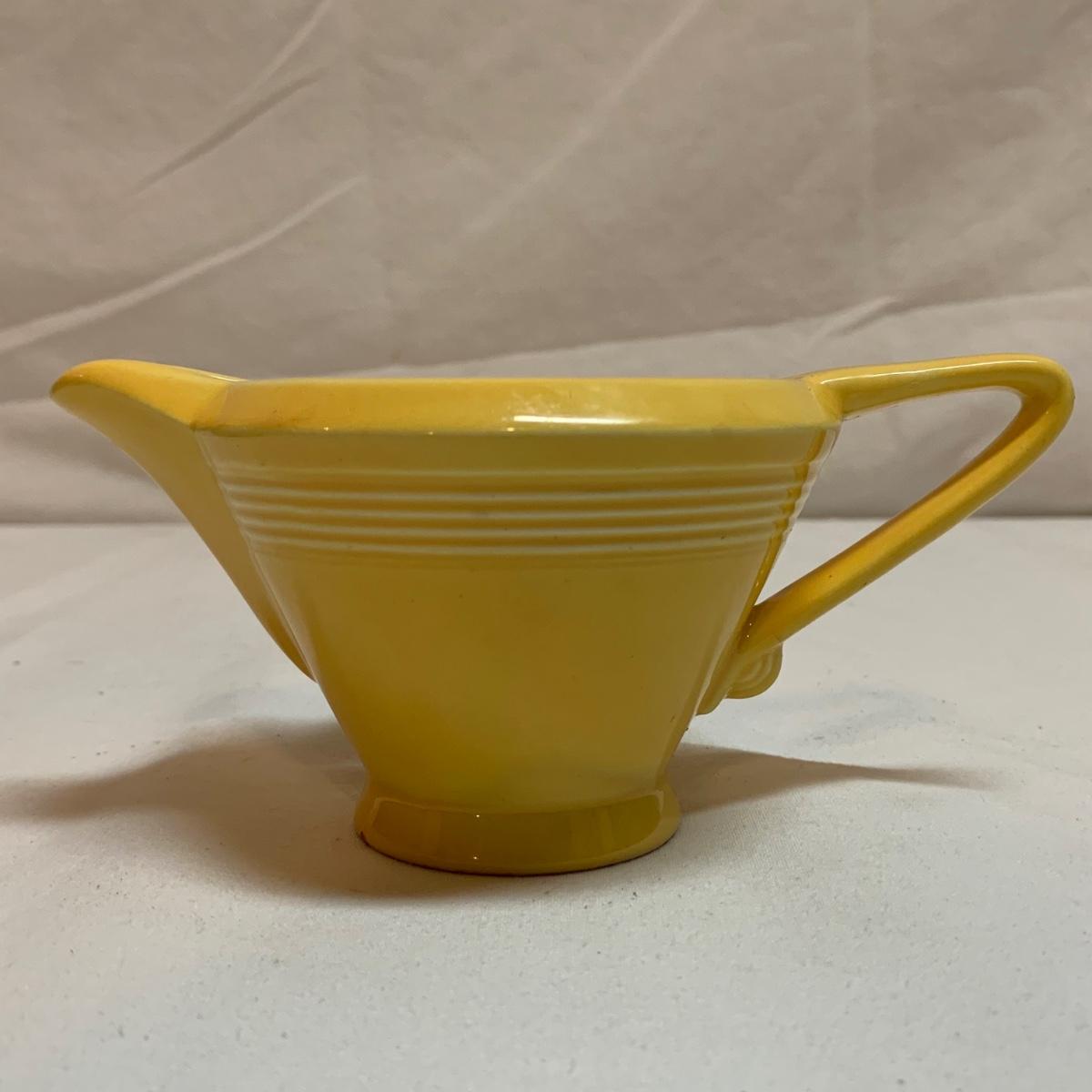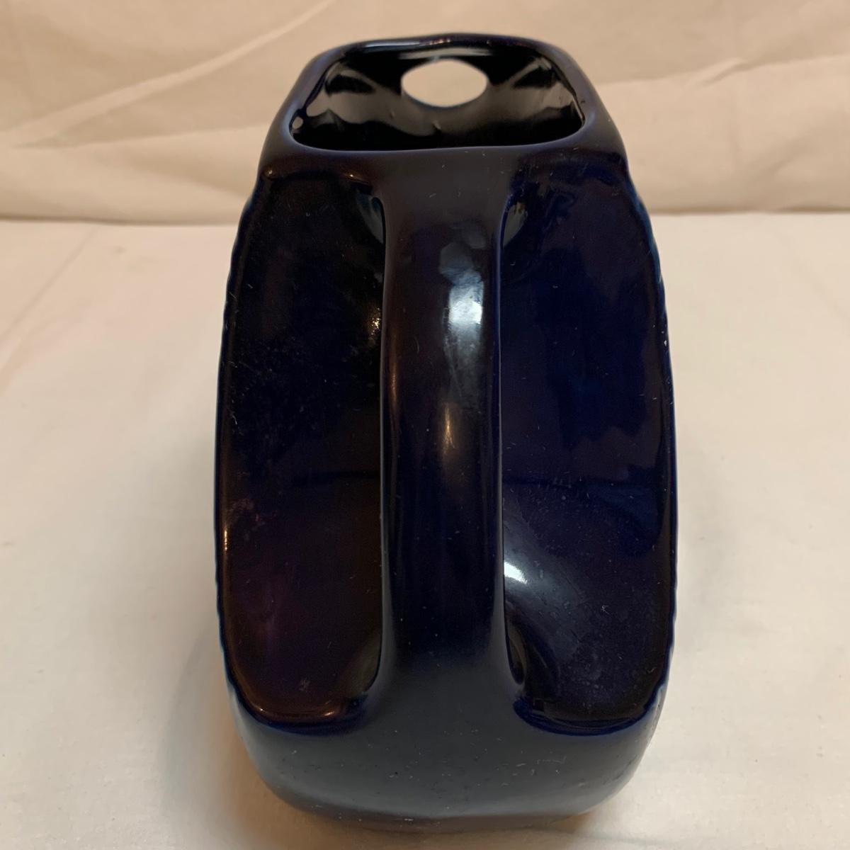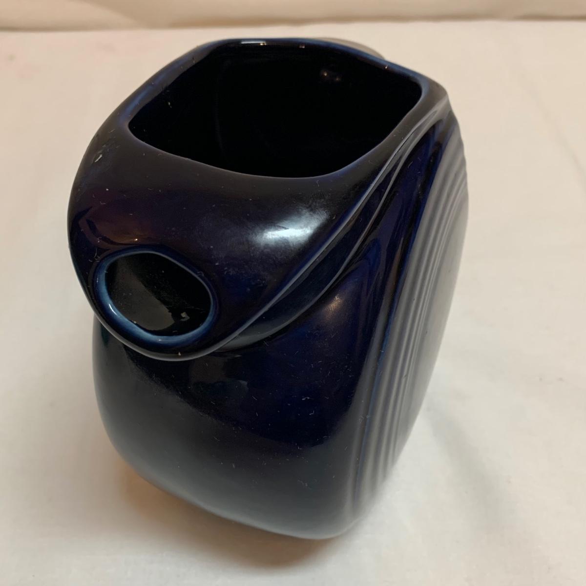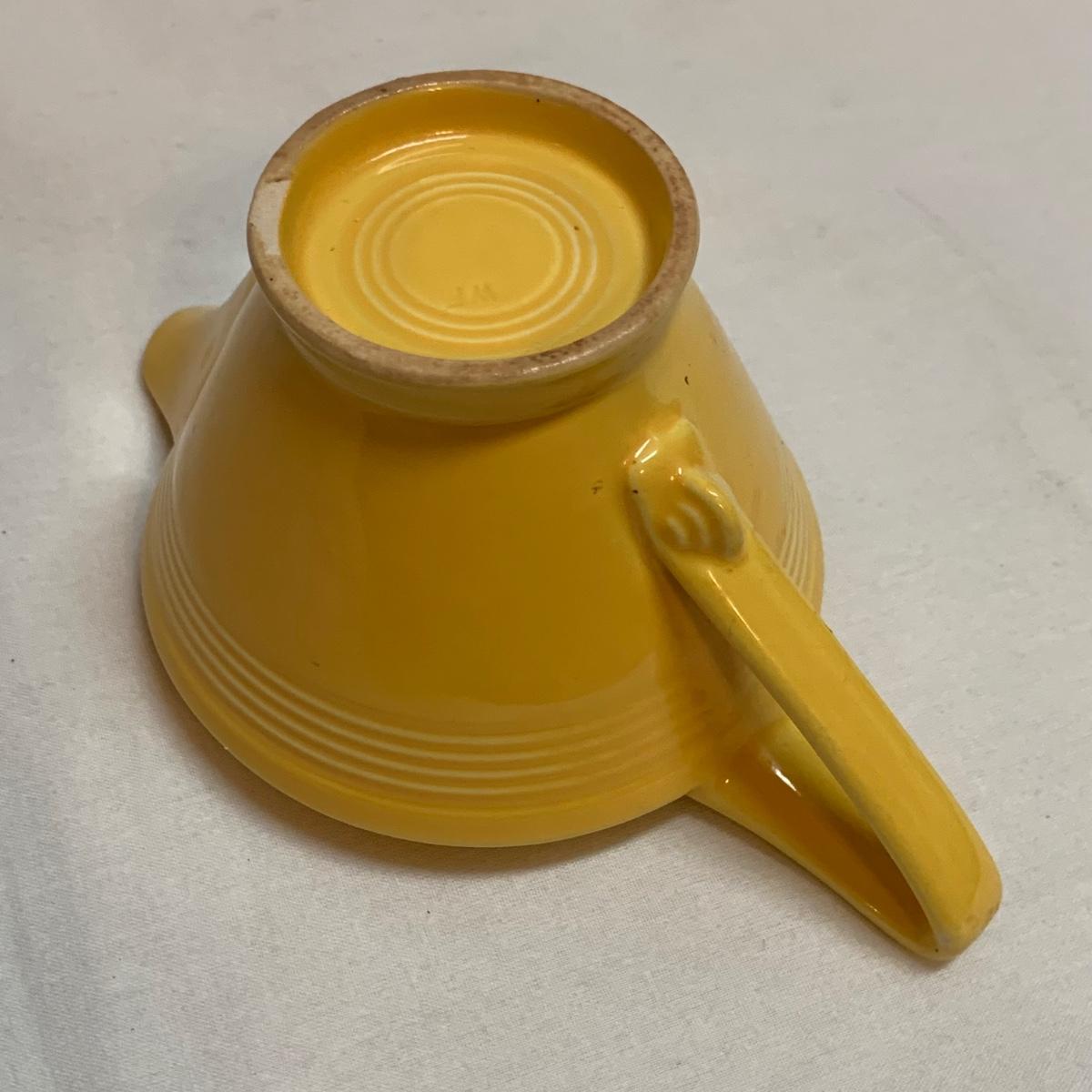 Three items in this lot: a Homer Laughlin Fiesta Ware 9” turquoise bowl, a dark blue Fiesta Ware pitcher, and a small yellow pitcher in a similar style. The yellow pitcher has a ‘WF’ mark on the bottom, and also a small chip on the rim of the base. The blue pitcher has the ‘Fiesta’ mark on its base, but it’s dark and difficult to see. There is one spot on its spout that looks like the glaze has been scratched, see photo.