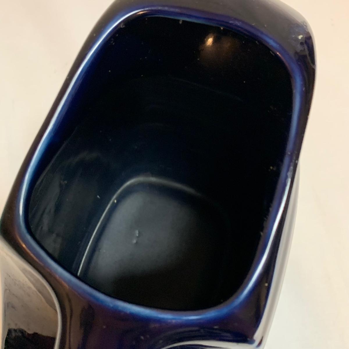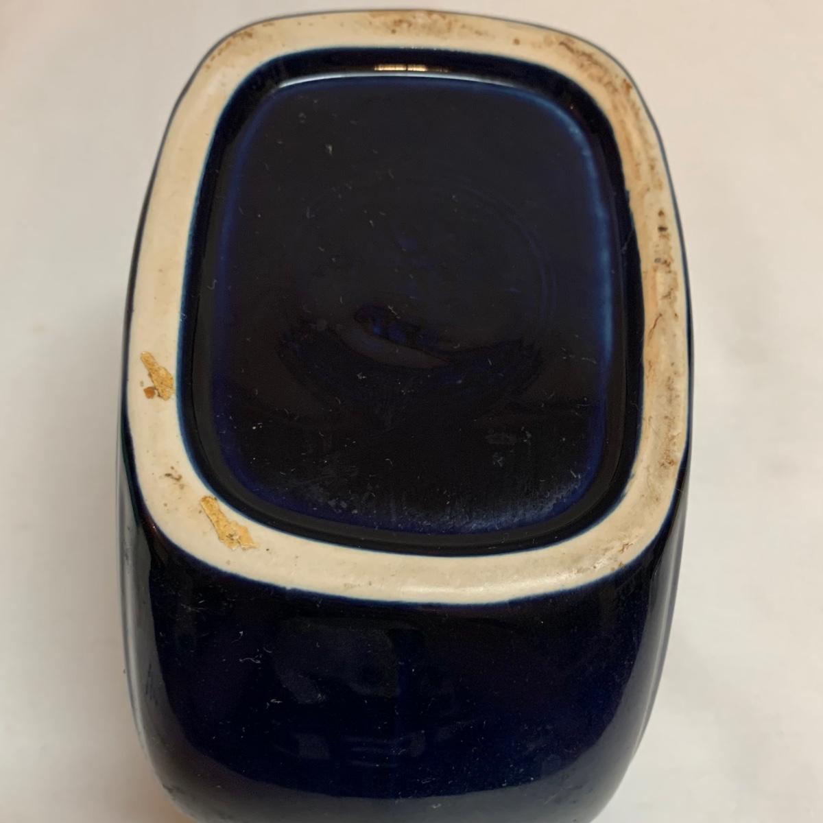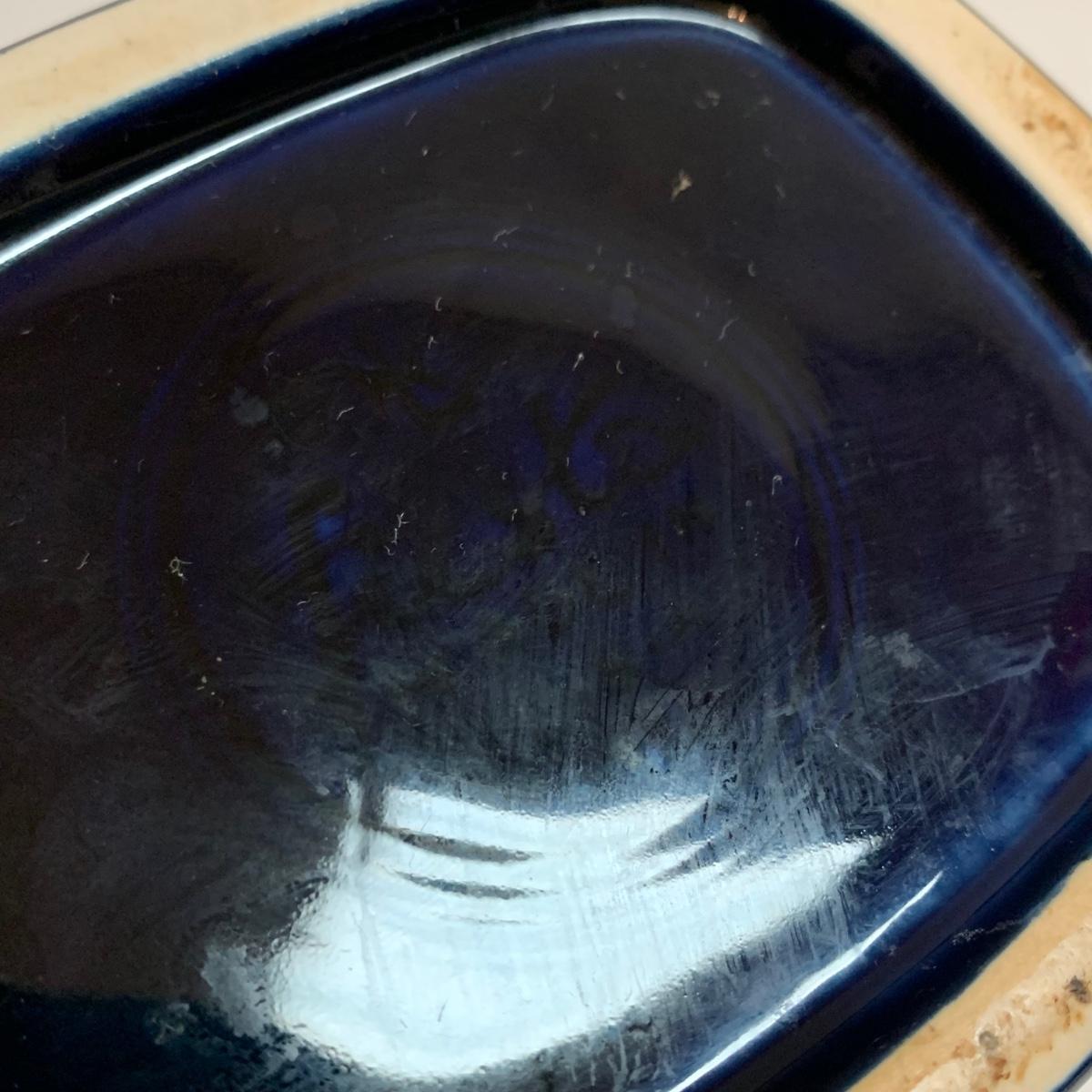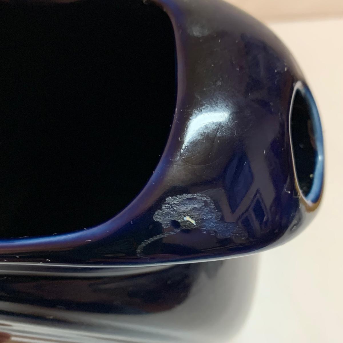 Three items in this lot: a Homer Laughlin Fiesta Ware 9” turquoise bowl, a dark blue Fiesta Ware pitcher, and a small yellow pitcher in a similar style. The yellow pitcher has a ‘WF’ mark on the bottom, and also a small chip on the rim of the base. The blue pitcher has the ‘Fiesta’ mark on its base, but it’s dark and difficult to see. There is one spot on its spout that looks like the glaze has been scratched, see photo.
