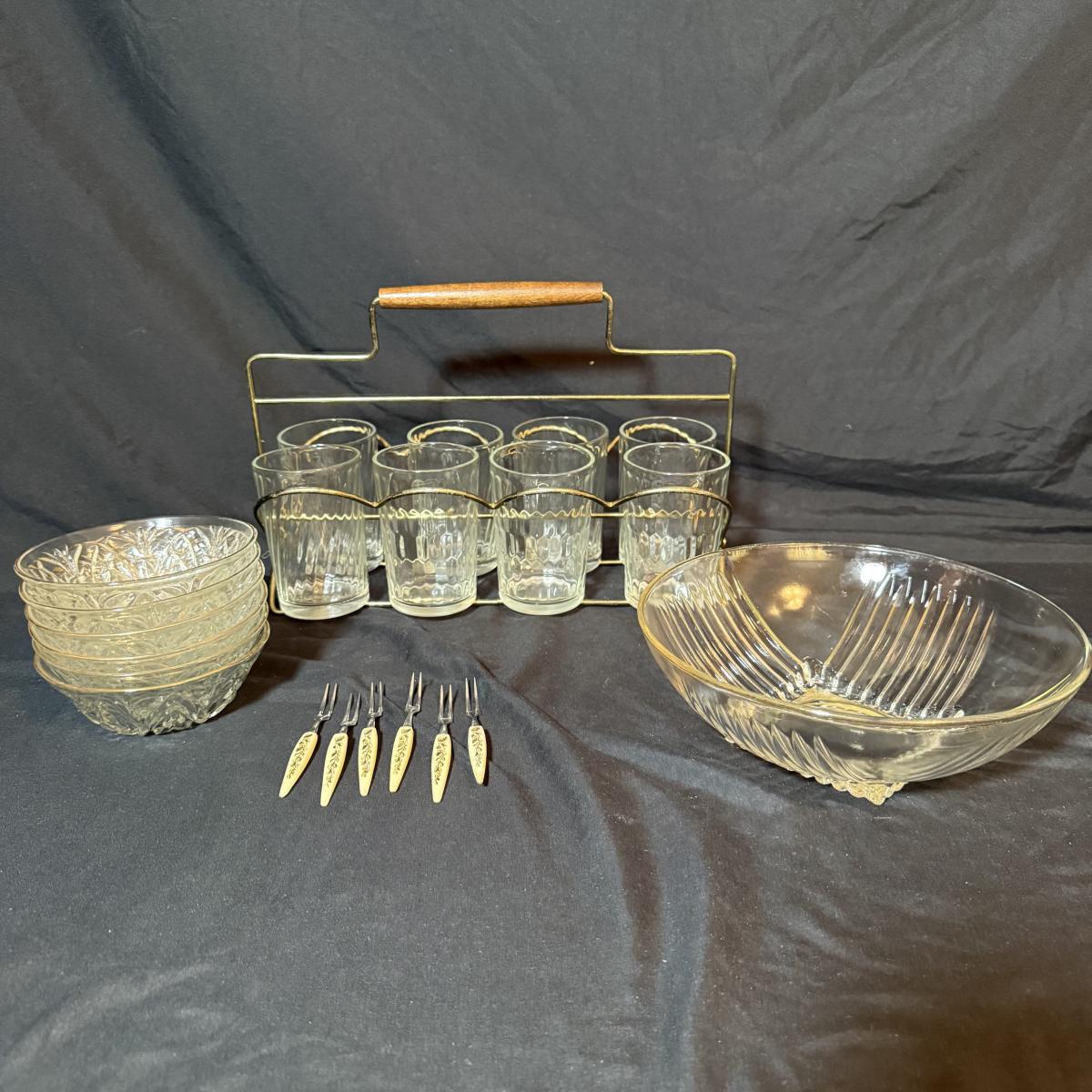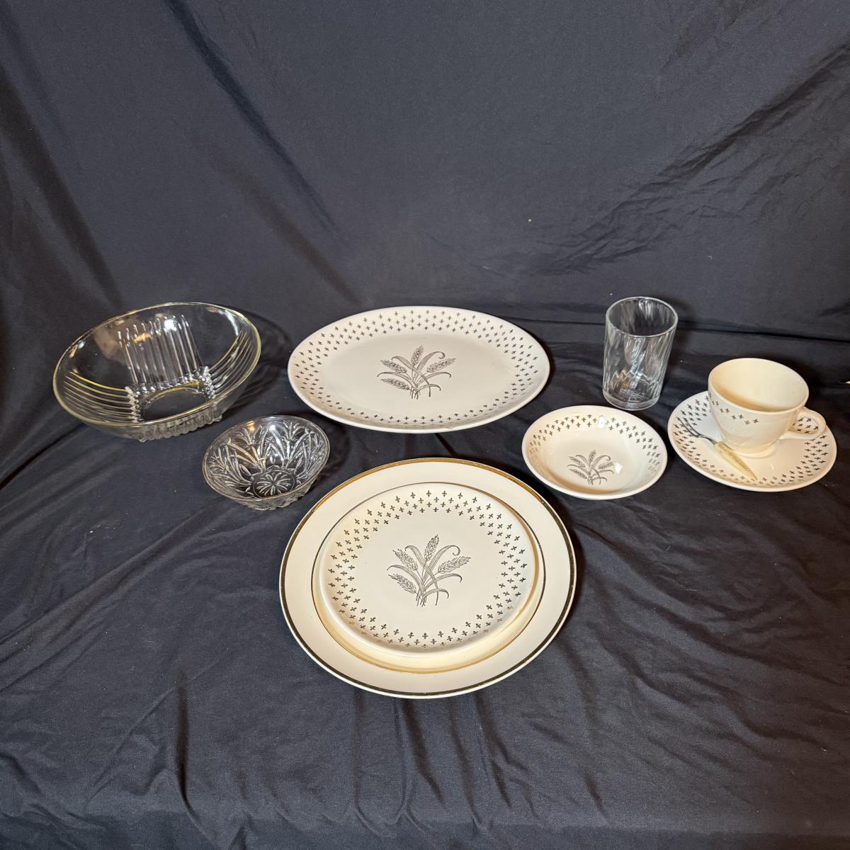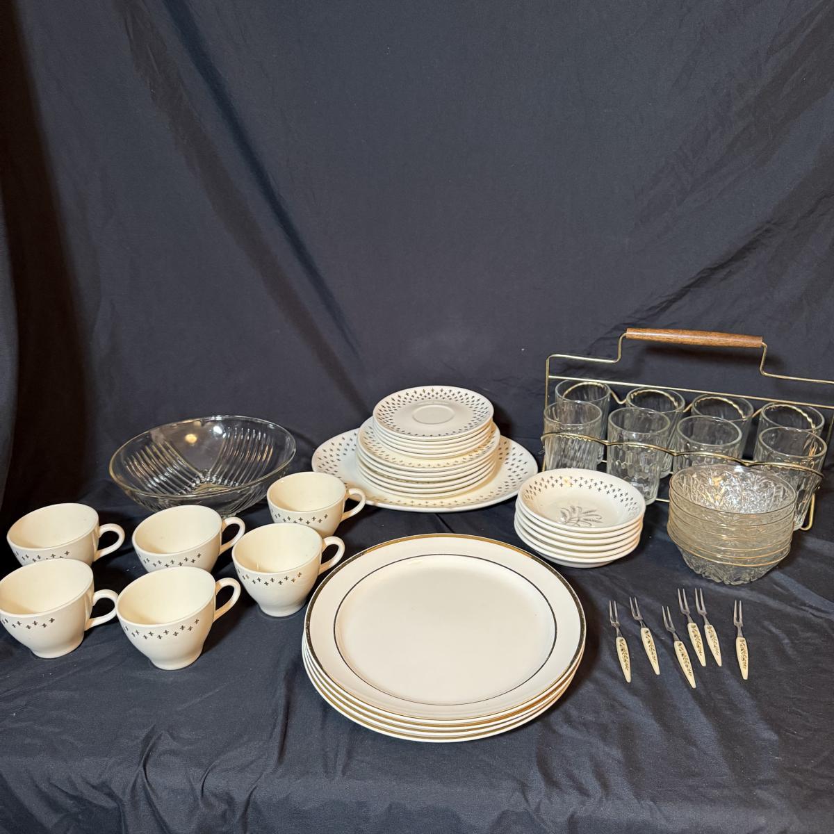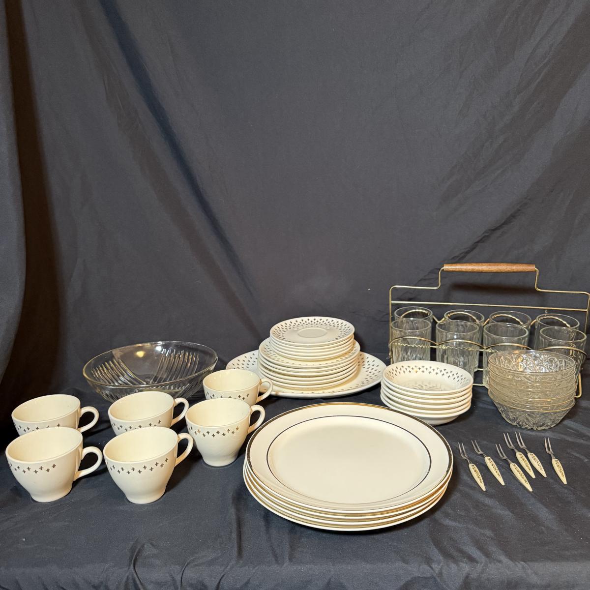 This lot contains a set of what appears to be Homer Laughlin Golden Wheat Fleur de lis 24 pc China set. This set comes with a serving plate, six bread plates, five saucers, six tea cups, and six fruit or dessert bowls. There is a chip in the rim of the serving plate. Also included is four gold rimmed dinner plates by Fotoware that match perfectly, these measure 10”D. Also included is a clear glass gold rimmed serving bowl as well as six gold rimmed clear glass fruit bowls, and six relish forks with gold details. Last is eight clear glass juice cups that come with their own metal caddy with a wooden handle. The caddy as a whole measures 12.75” x 5.5” x 9”H. Shipping available. Shipping can be costly. We suggest contacting our preferred local shipping provider, Postage Express, with dimensions and getting an estimate before bidding: (828) 255-9250 or shipping@postageexpressnc.com.