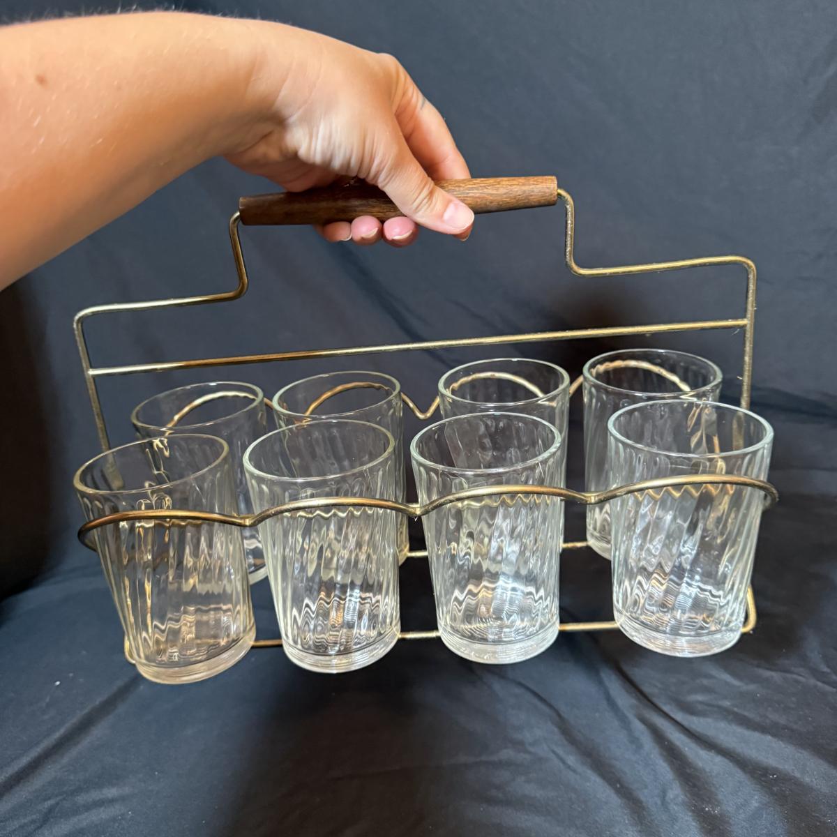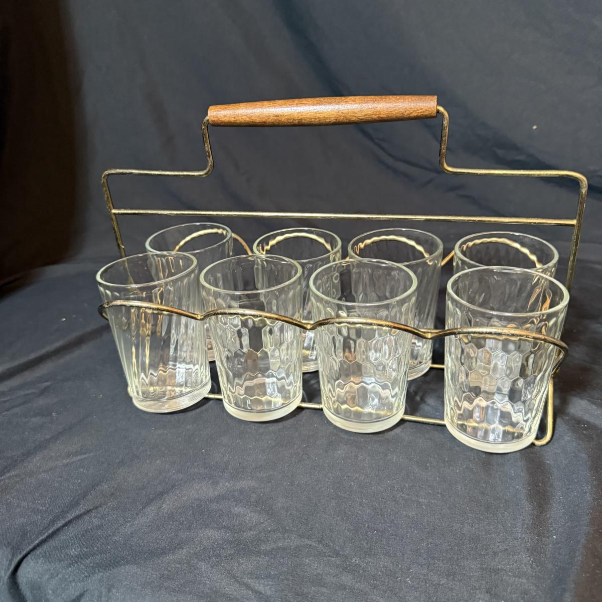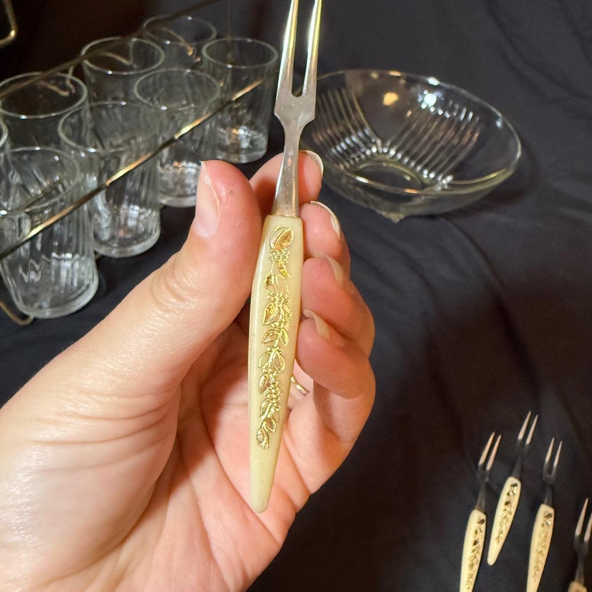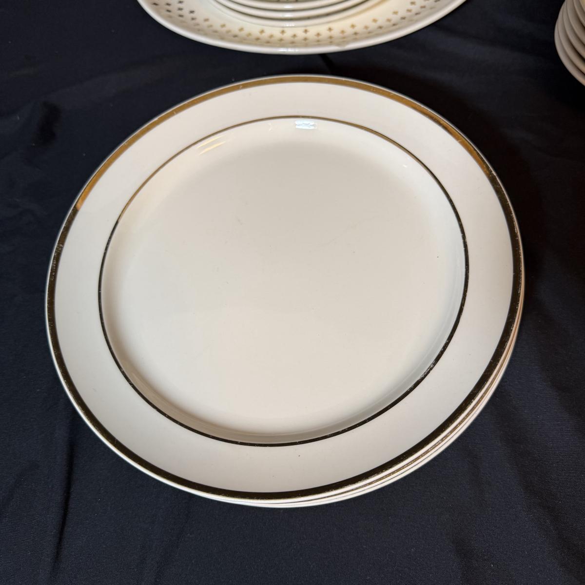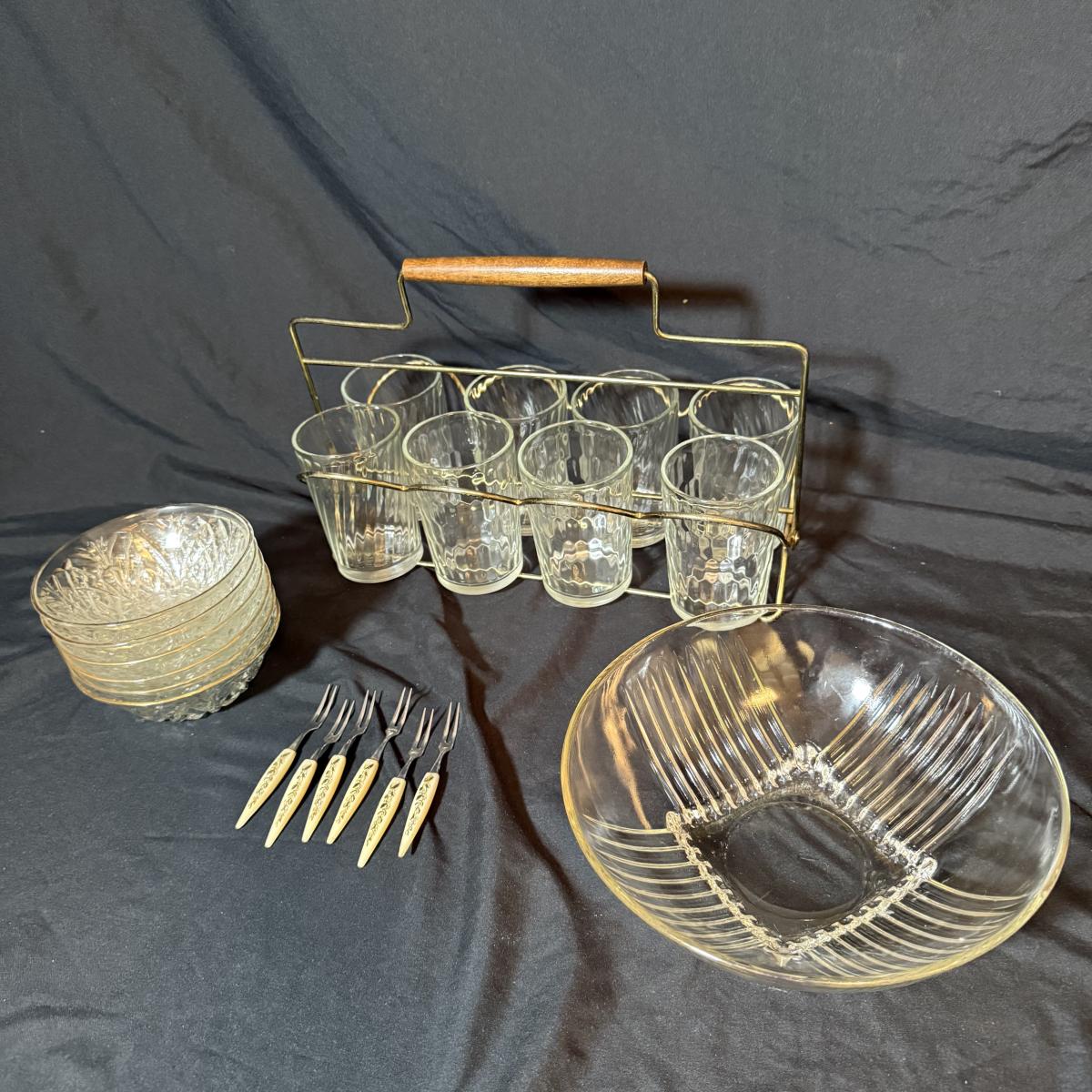 This lot contains a set of what appears to be Homer Laughlin Golden Wheat Fleur de lis 24 pc China set. This set comes with a serving plate, six bread plates, five saucers, six tea cups, and six fruit or dessert bowls. There is a chip in the rim of the serving plate. Also included is four gold rimmed dinner plates by Fotoware that match perfectly, these measure 10”D. Also included is a clear glass gold rimmed serving bowl as well as six gold rimmed clear glass fruit bowls, and six relish forks with gold details. Last is eight clear glass juice cups that come with their own metal caddy with a wooden handle. The caddy as a whole measures 12.75” x 5.5” x 9”H. Shipping available. Shipping can be costly. We suggest contacting our preferred local shipping provider, Postage Express, with dimensions and getting an estimate before bidding: (828) 255-9250 or shipping@postageexpressnc.com.