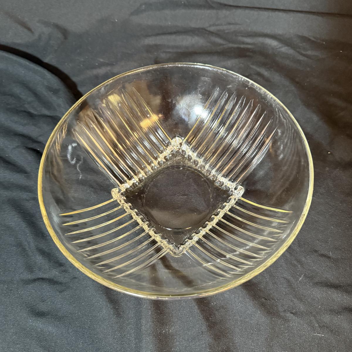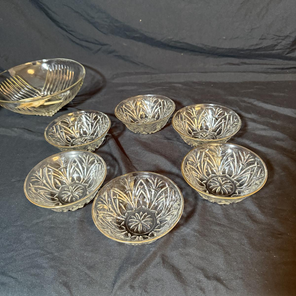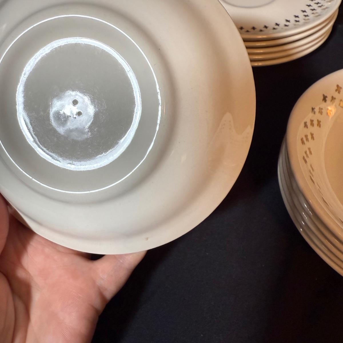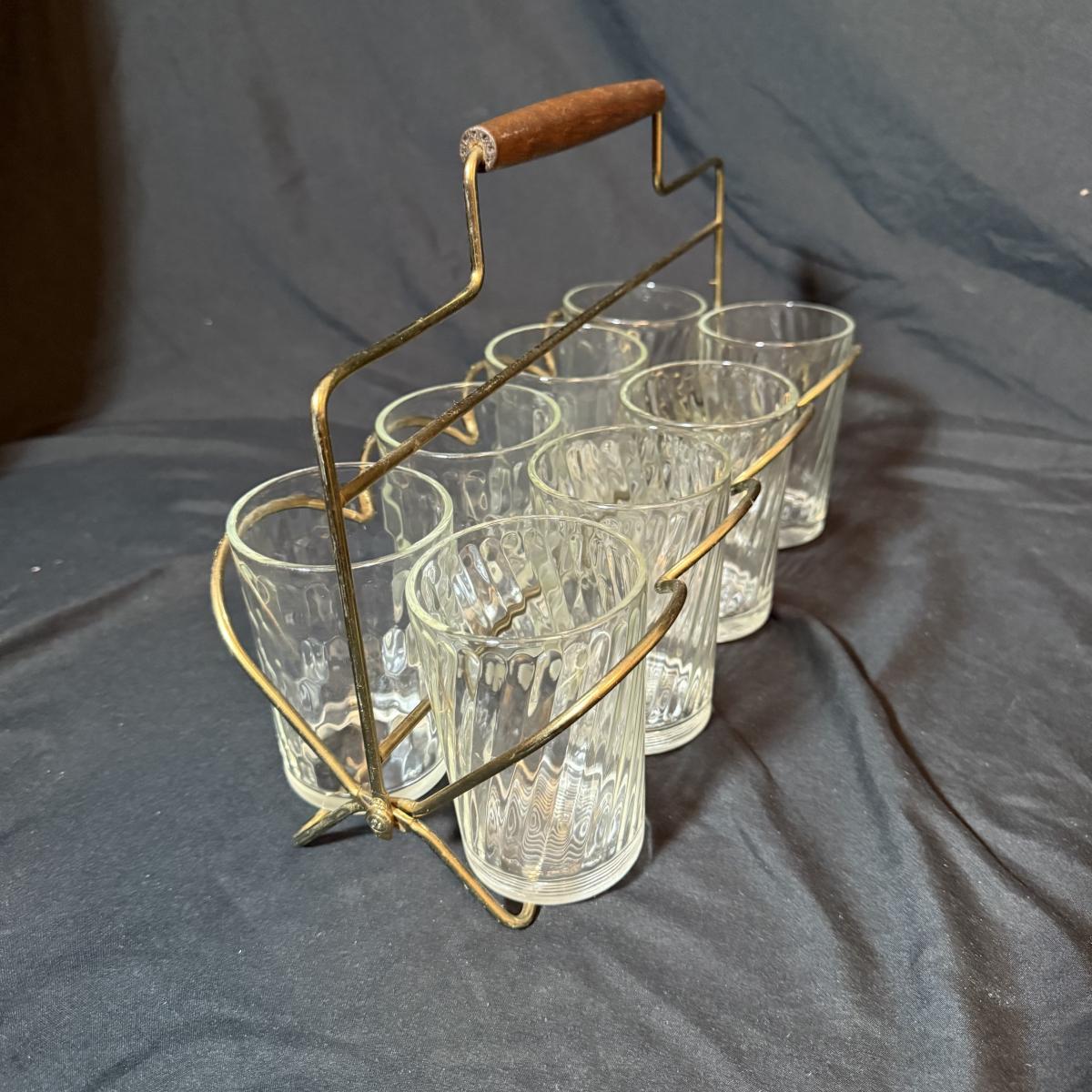 This lot contains a set of what appears to be Homer Laughlin Golden Wheat Fleur de lis 24 pc China set. This set comes with a serving plate, six bread plates, five saucers, six tea cups, and six fruit or dessert bowls. There is a chip in the rim of the serving plate. Also included is four gold rimmed dinner plates by Fotoware that match perfectly, these measure 10”D. Also included is a clear glass gold rimmed serving bowl as well as six gold rimmed clear glass fruit bowls, and six relish forks with gold details. Last is eight clear glass juice cups that come with their own metal caddy with a wooden handle. The caddy as a whole measures 12.75” x 5.5” x 9”H. Shipping available. Shipping can be costly. We suggest contacting our preferred local shipping provider, Postage Express, with dimensions and getting an estimate before bidding: (828) 255-9250 or shipping@postageexpressnc.com.