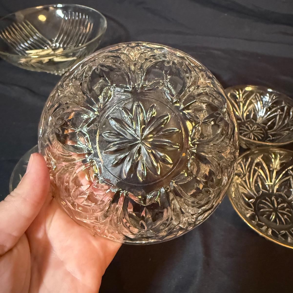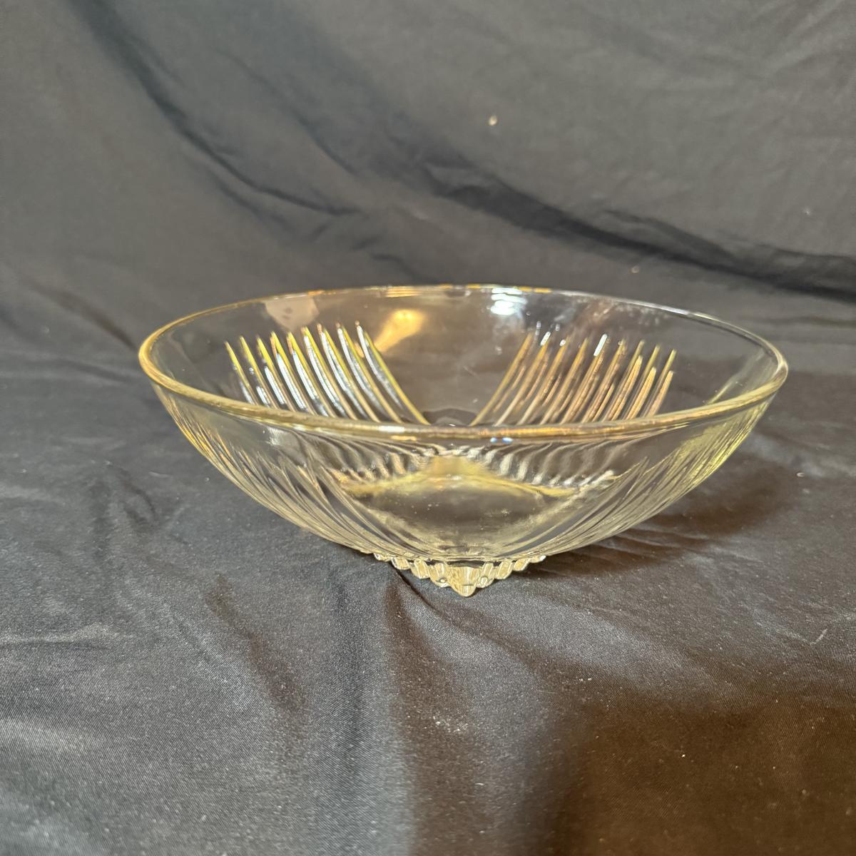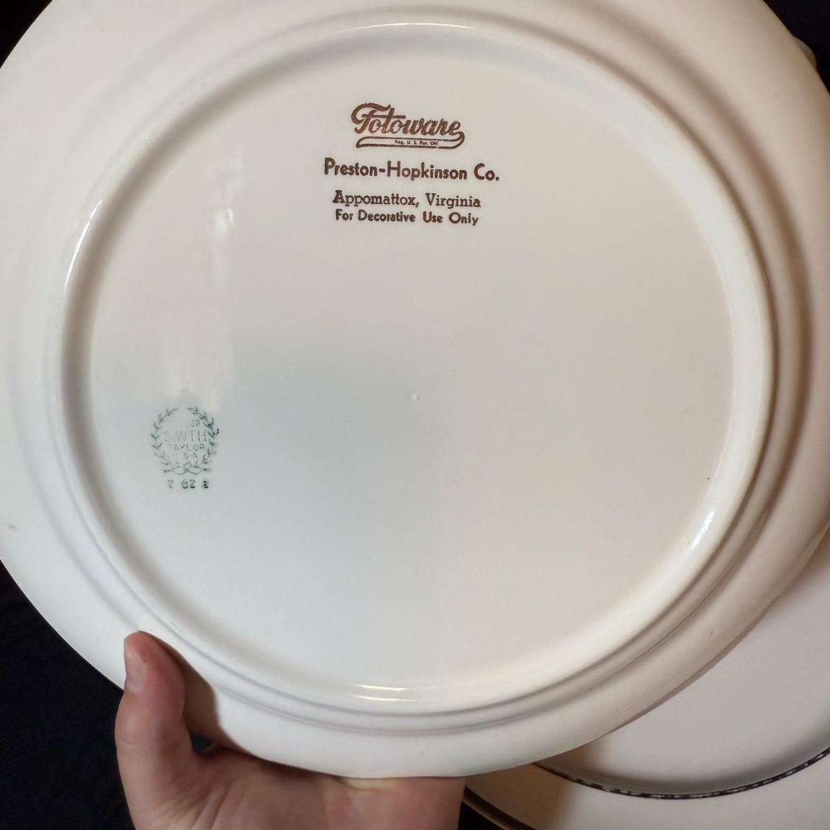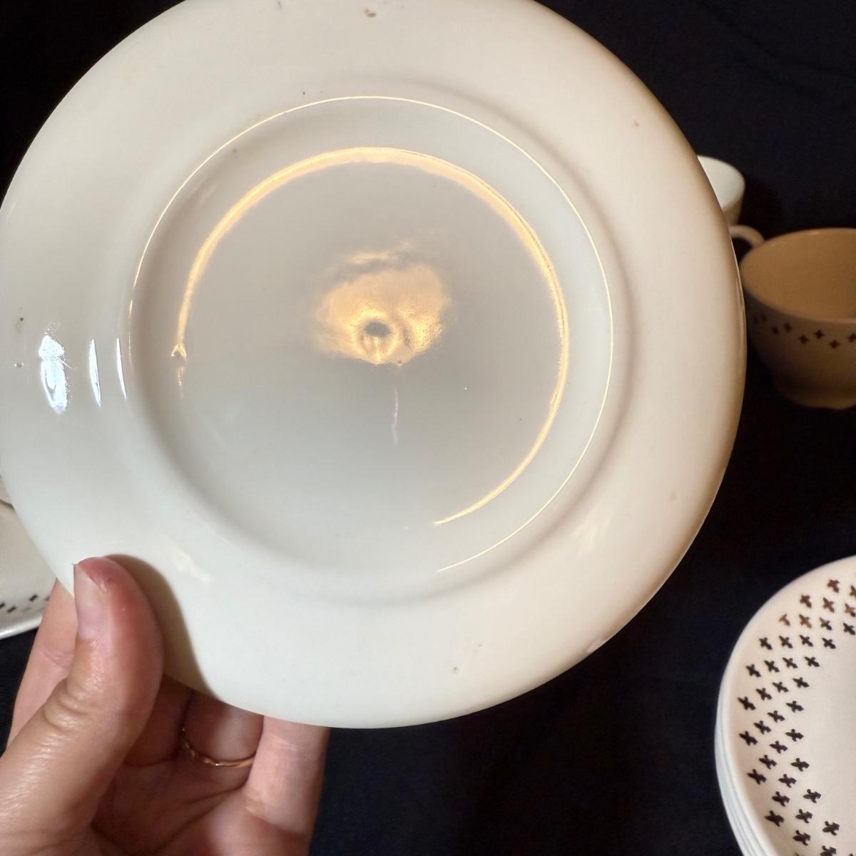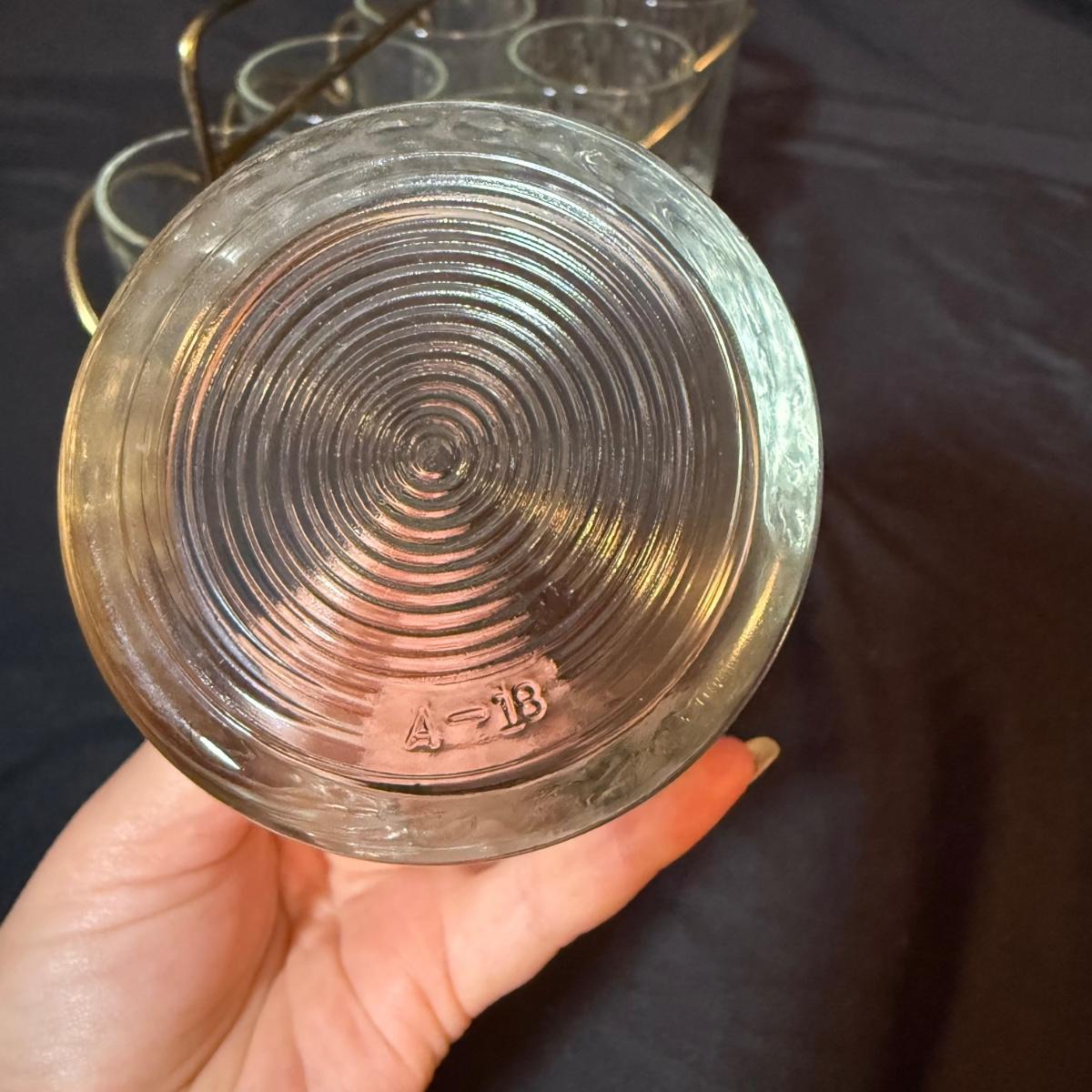 This lot contains a set of what appears to be Homer Laughlin Golden Wheat Fleur de lis 24 pc China set. This set comes with a serving plate, six bread plates, five saucers, six tea cups, and six fruit or dessert bowls. There is a chip in the rim of the serving plate. Also included is four gold rimmed dinner plates by Fotoware that match perfectly, these measure 10”D. Also included is a clear glass gold rimmed serving bowl as well as six gold rimmed clear glass fruit bowls, and six relish forks with gold details. Last is eight clear glass juice cups that come with their own metal caddy with a wooden handle. The caddy as a whole measures 12.75” x 5.5” x 9”H. Shipping available. Shipping can be costly. We suggest contacting our preferred local shipping provider, Postage Express, with dimensions and getting an estimate before bidding: (828) 255-9250 or shipping@postageexpressnc.com.