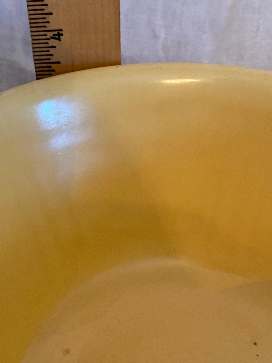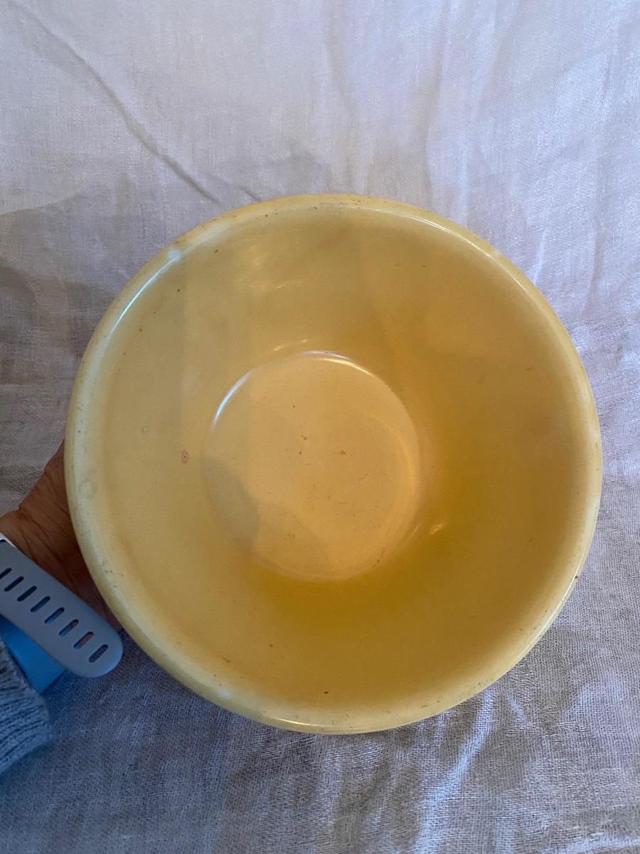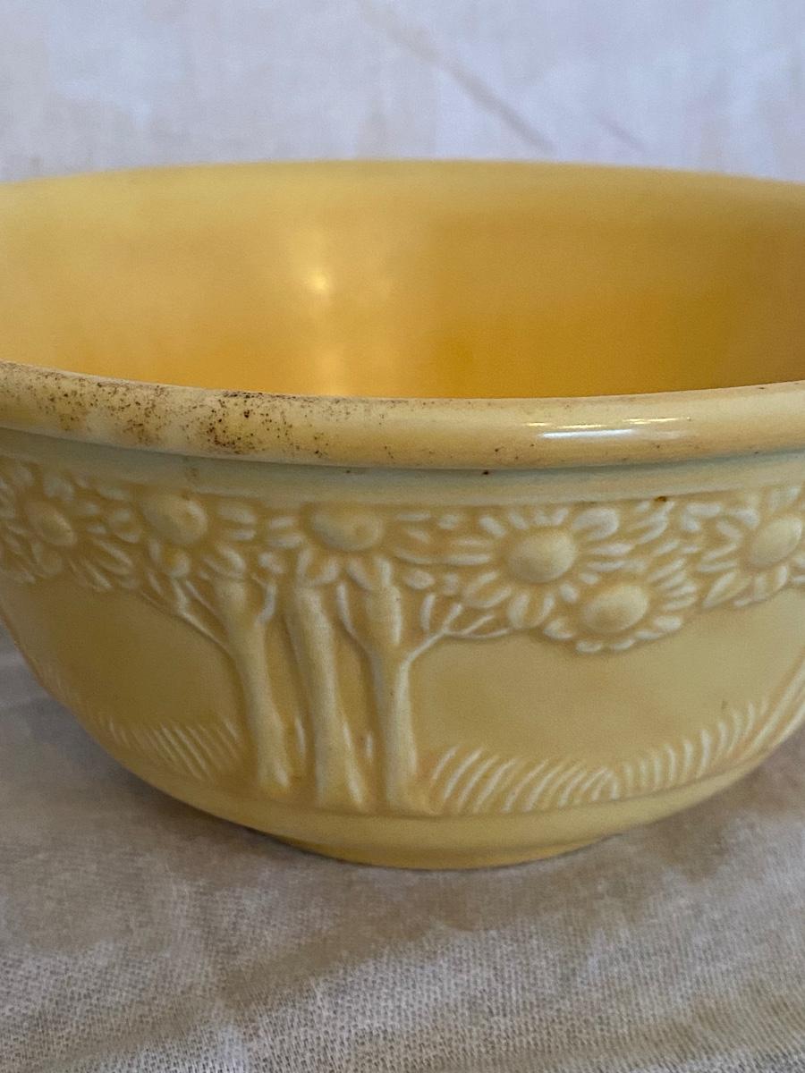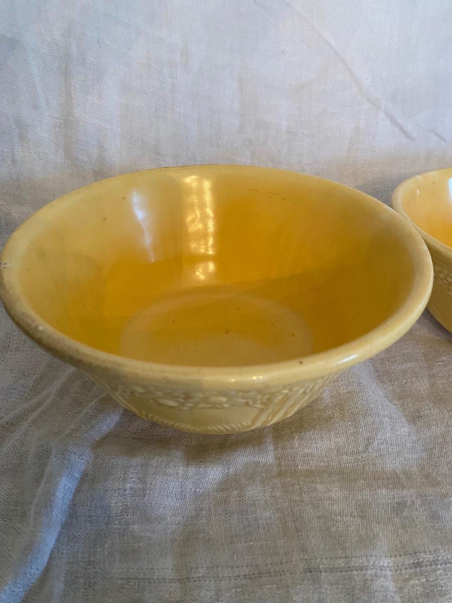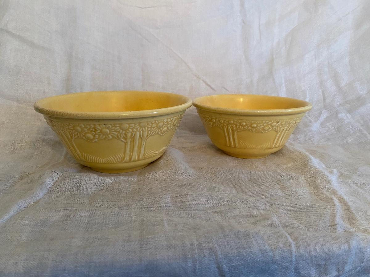 HOMER LAUGHLIN YELLOW APPLE TREE BOWLS, lovely vintage patttern. One bowl is 8", other just under 7", marked on the bottom. Signs of wear but no cracks or chips.