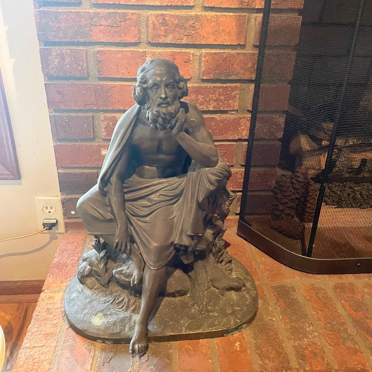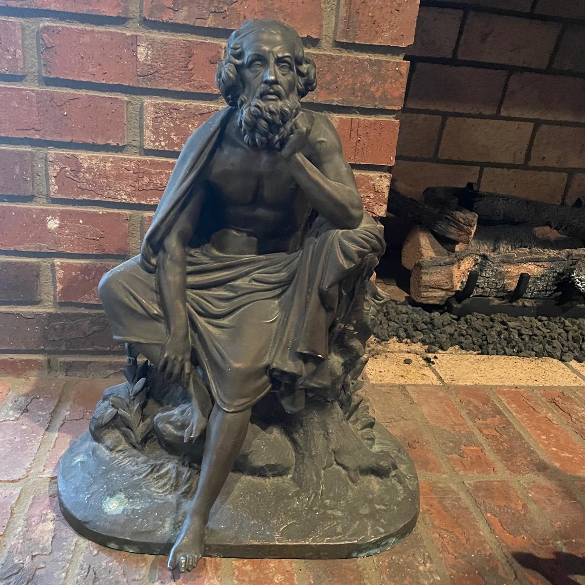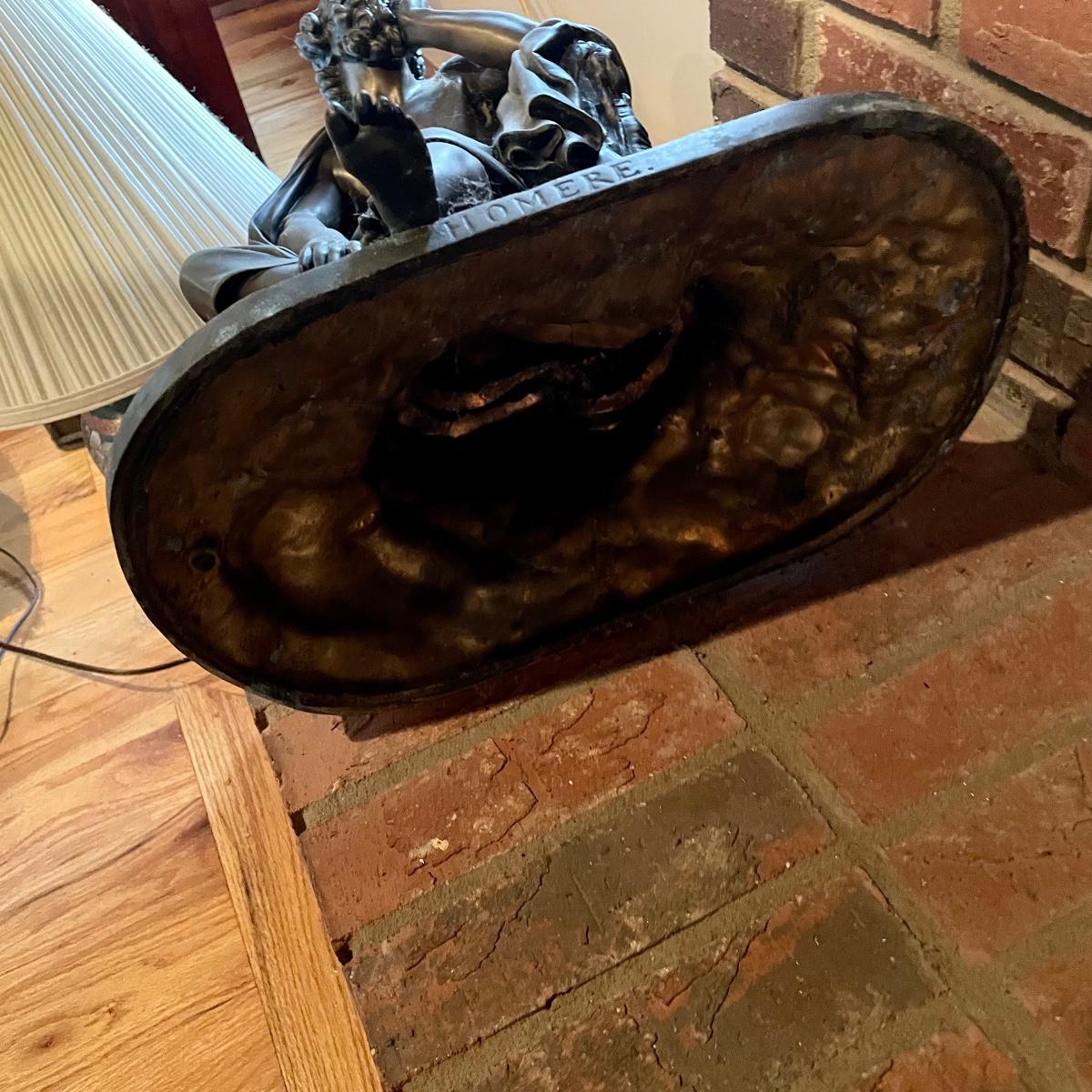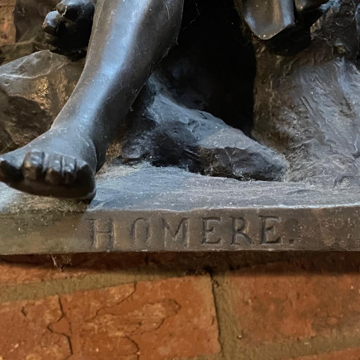 This large metal statue of Homer stands at 18” tall and is 14” wide x 10” deep. He is a heavy guy that appears to be made solely of metal, possibly a cast that was made in two pieces then joined together. Says "Homere" on side. Can not find signature.