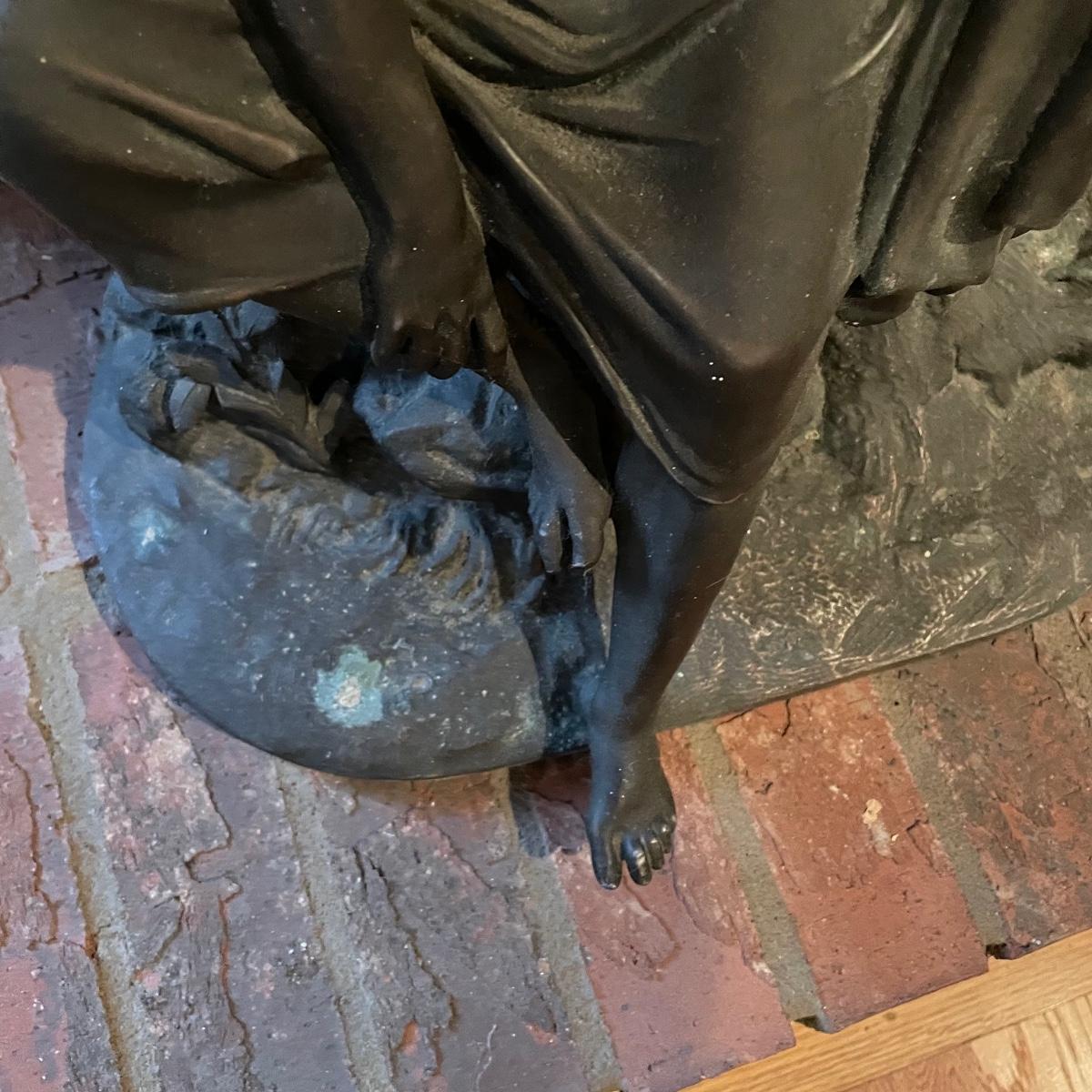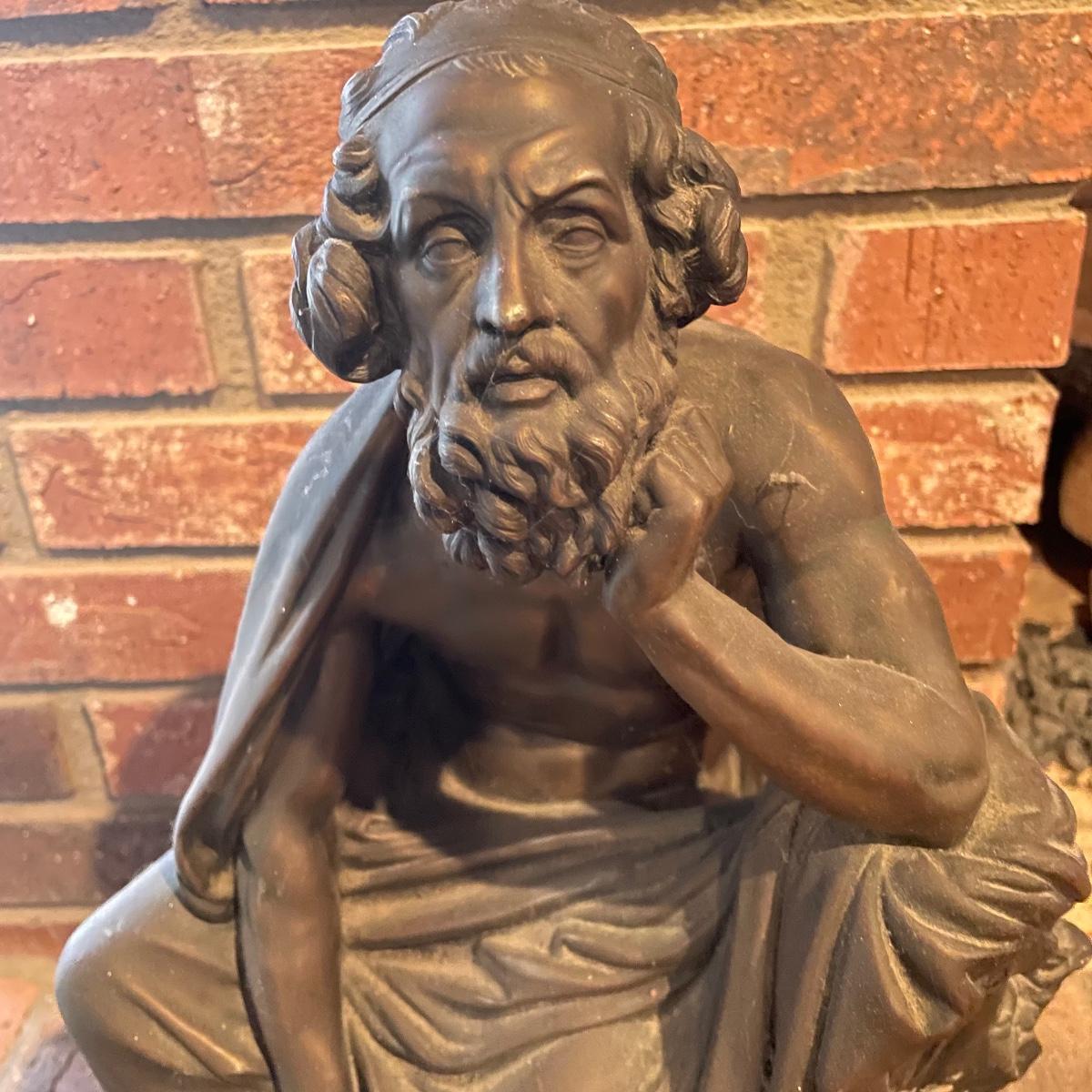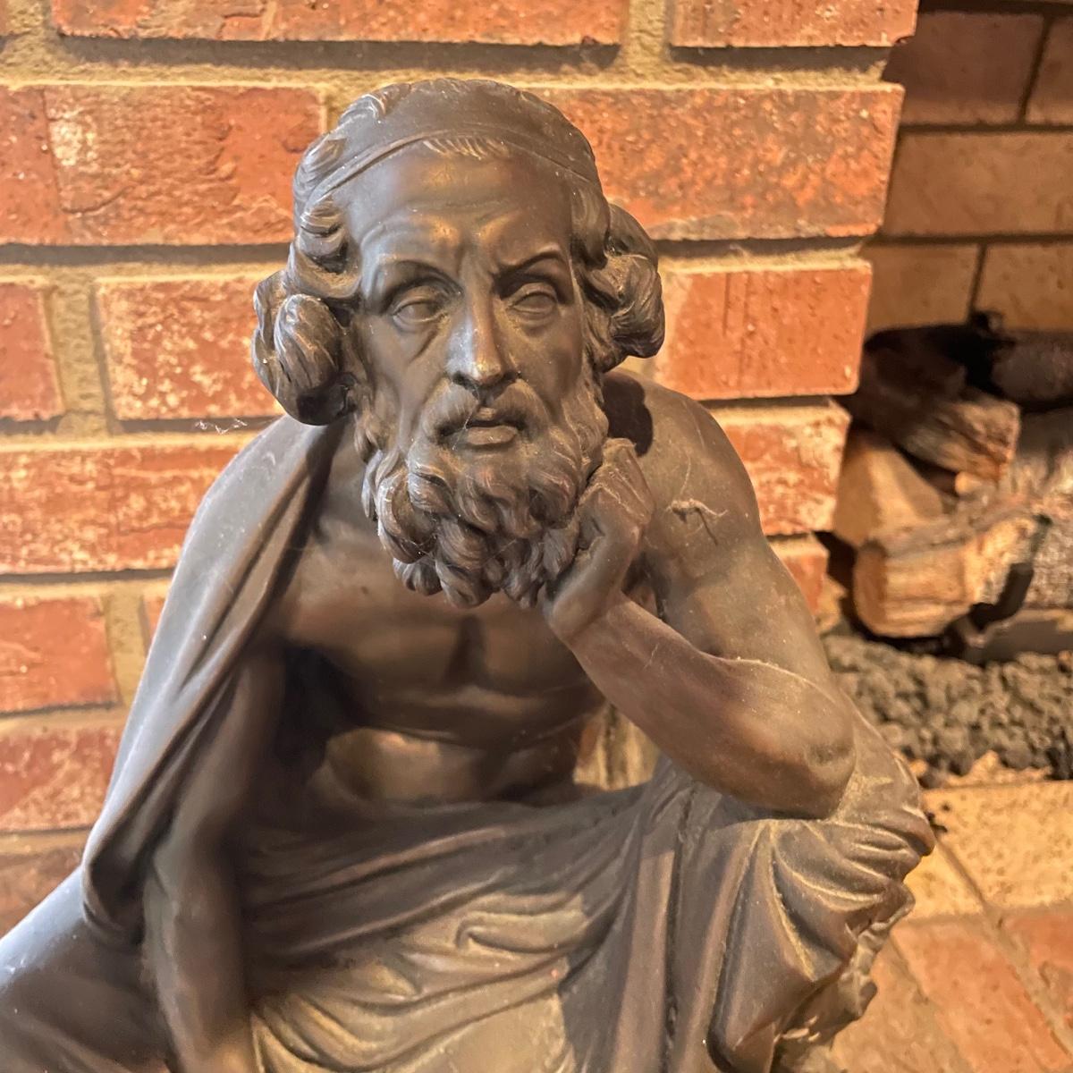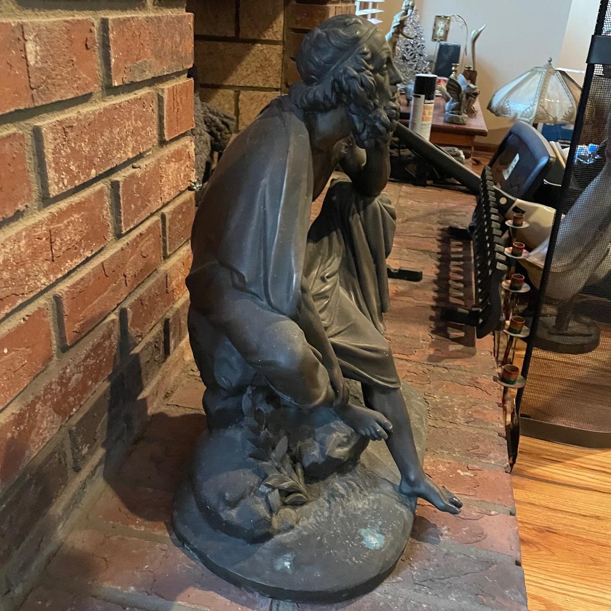 This large metal statue of Homer stands at 18” tall and is 14” wide x 10” deep. He is a heavy guy that appears to be made solely of metal, possibly a cast that was made in two pieces then joined together. Says "Homere" on side. Can not find signature.