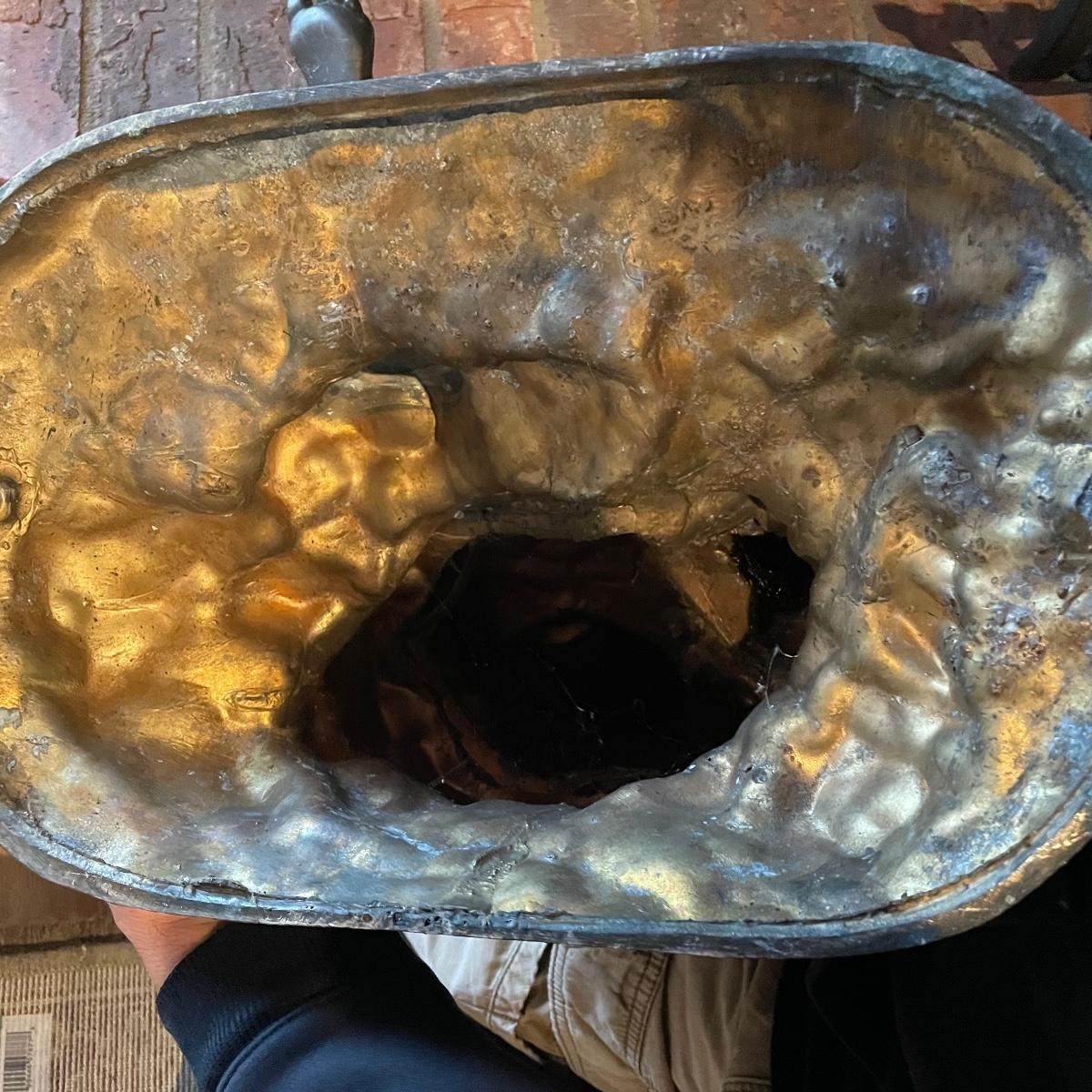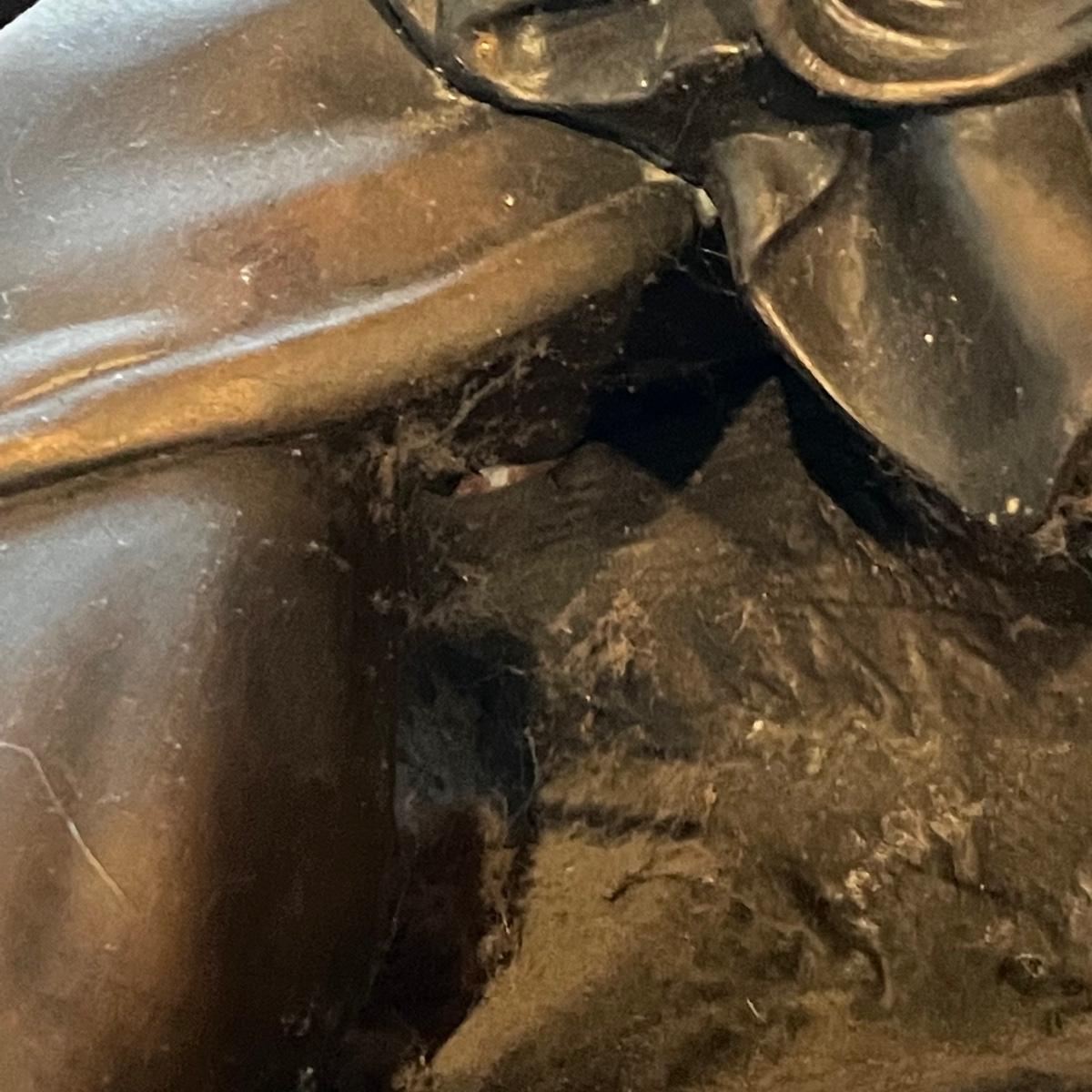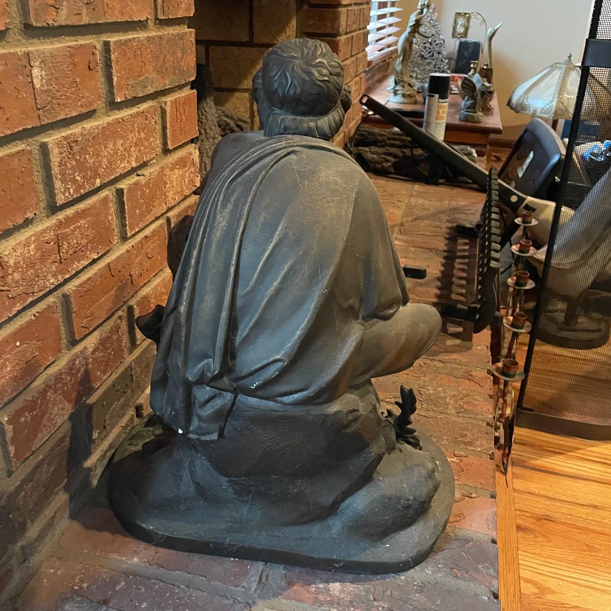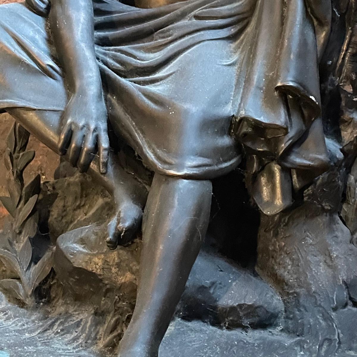 This large metal statue of Homer stands at 18” tall and is 14” wide x 10” deep. He is a heavy guy that appears to be made solely of metal, possibly a cast that was made in two pieces then joined together. Says "Homere" on side. Can not find signature.