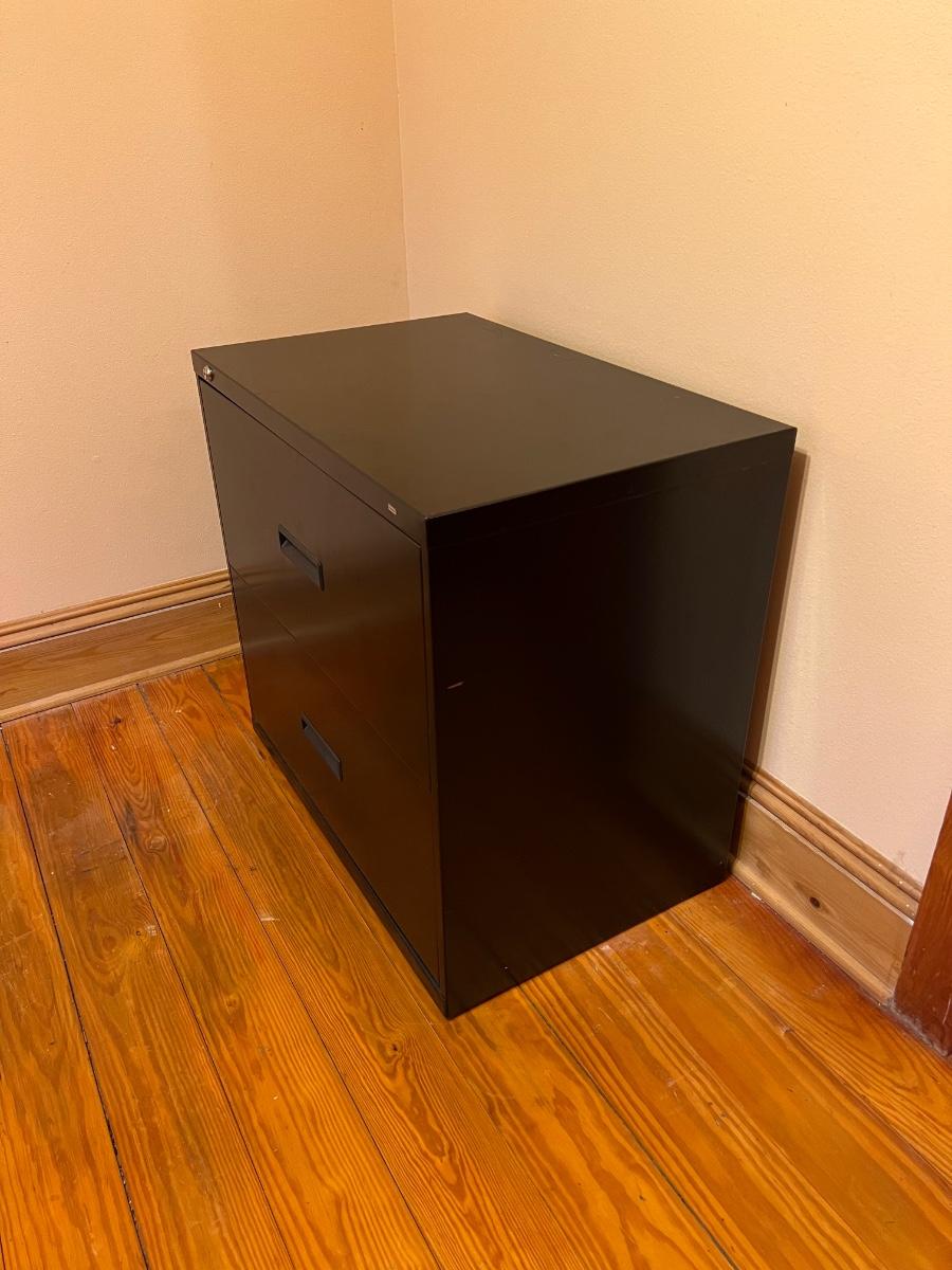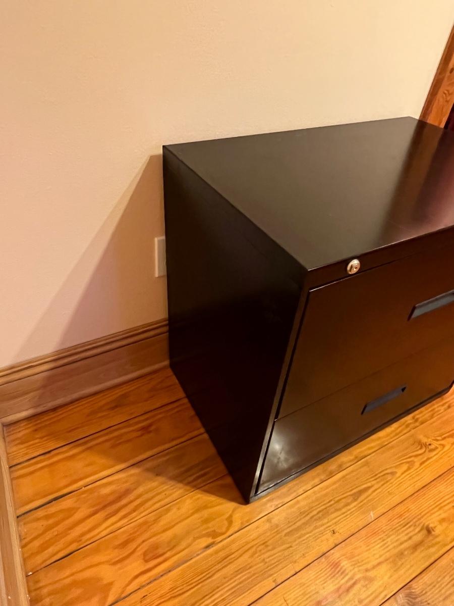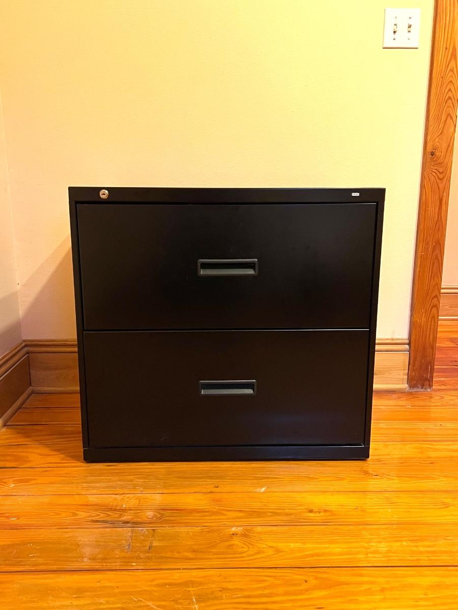 Drawers slide in and out easily. No Key ~ Normal Wear & Tear ~ 28.5” H x 30” W x 19.5” D