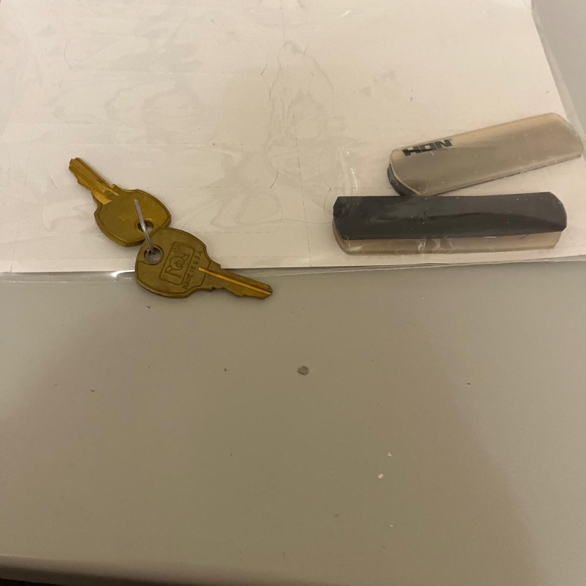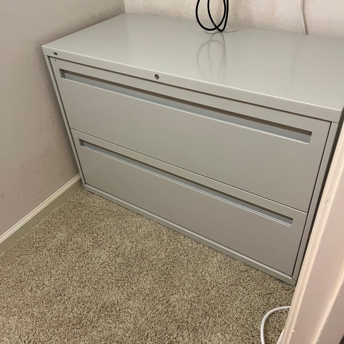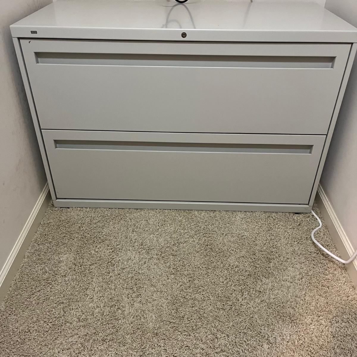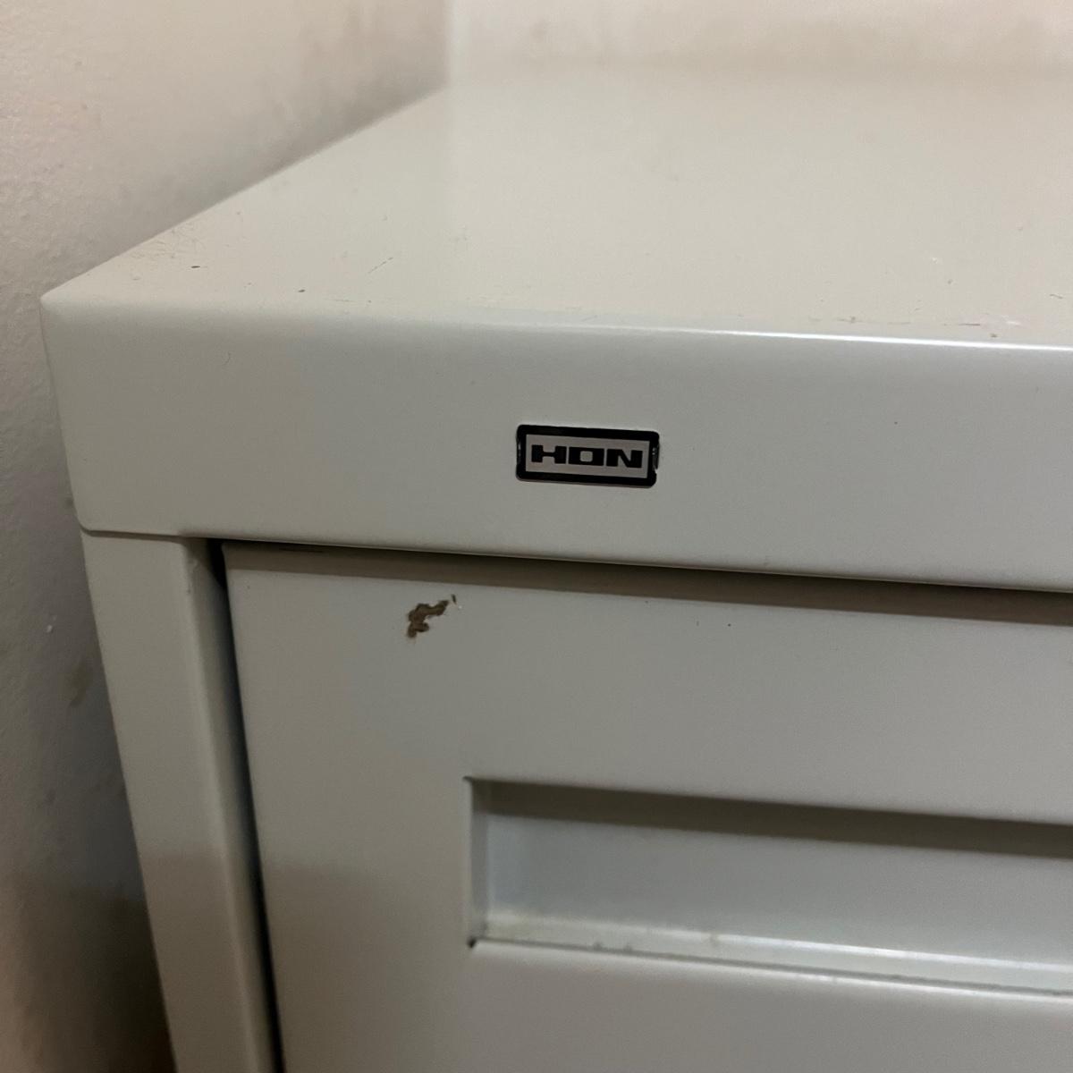 Lot includes a HON brand two drawer metal filing cabinet with keys. Cabinet measures 19” x 48” x 28.5”H.
