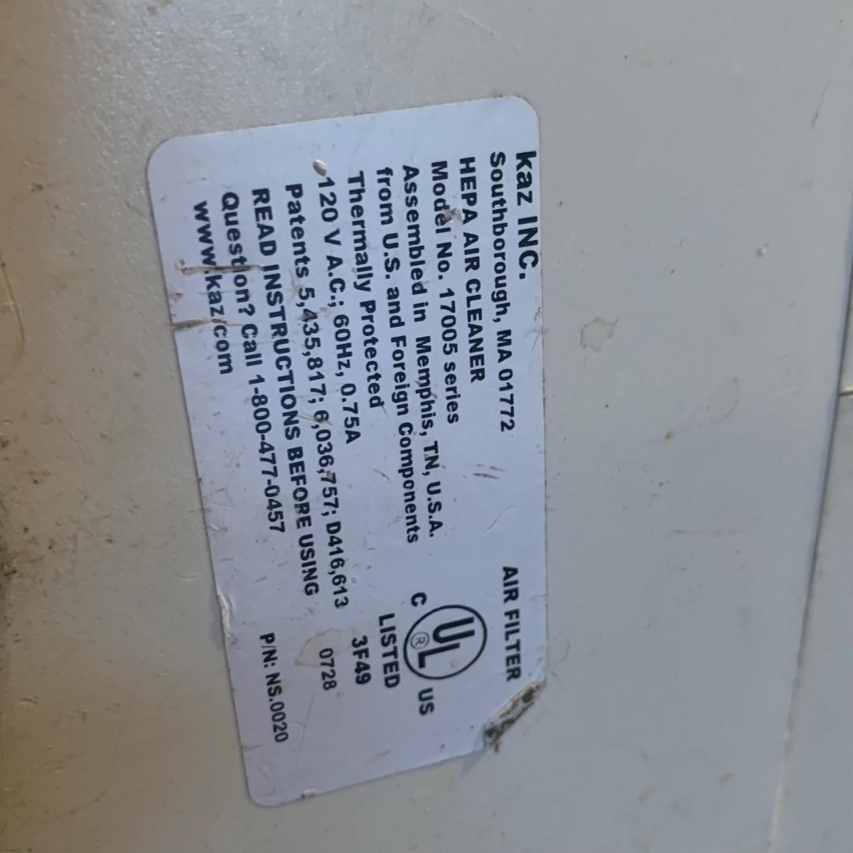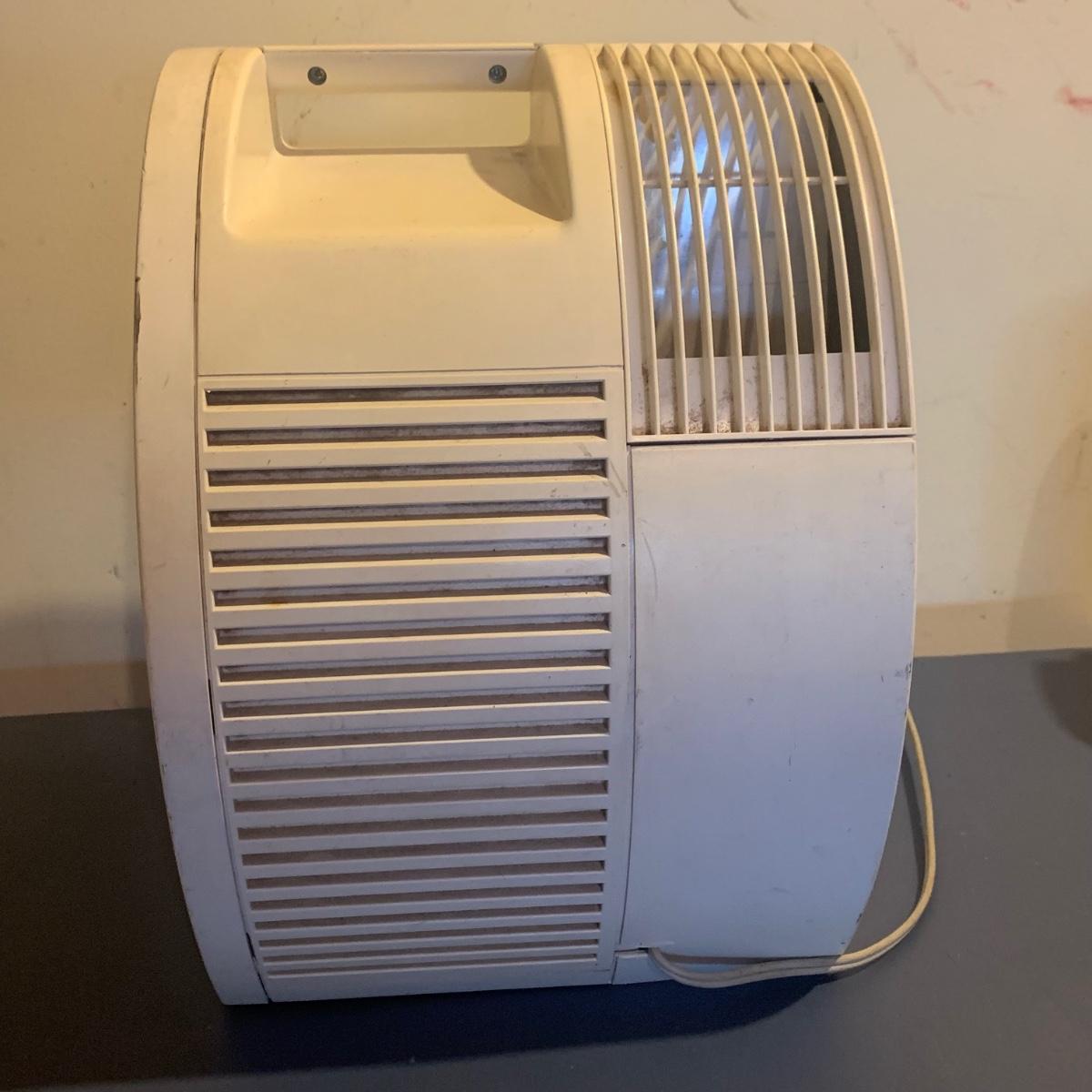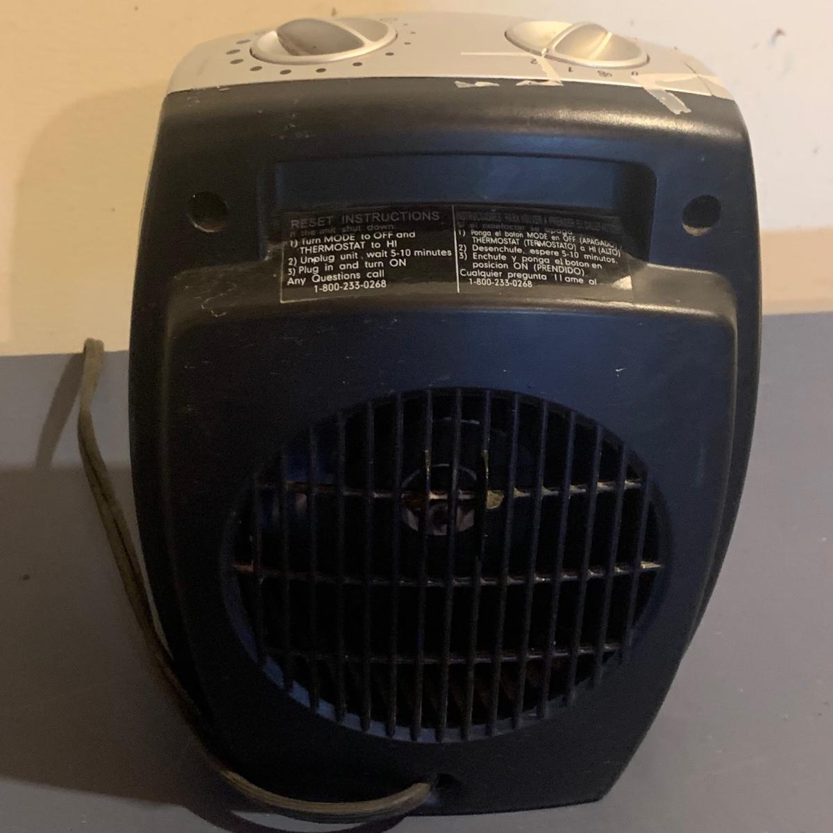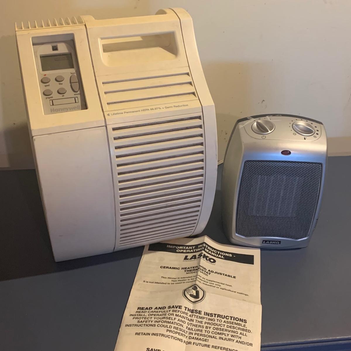 Honeywell HEPA air cleaner is approximately 10.5” x 13.5” x 15”H. It has some surface dust that will wipe off of its plastic shell. Lasko ceramic heater with adjustable thermostat comes with operating manual. It has some tape residue on its surface. Both items powered on when plugged in.