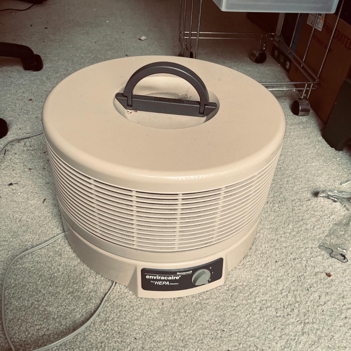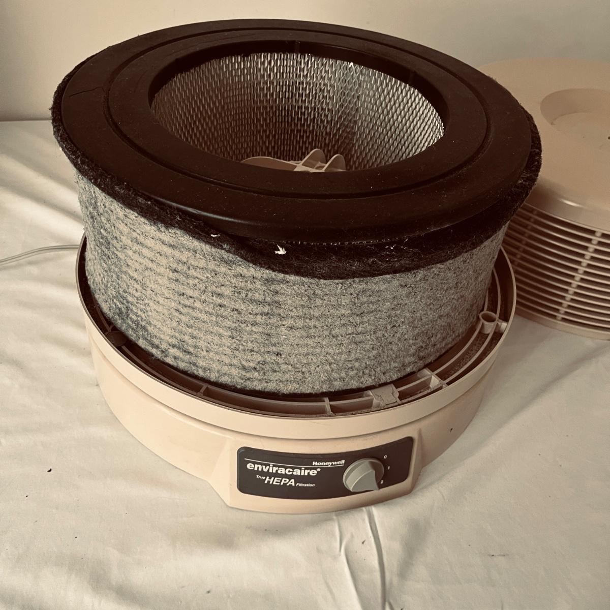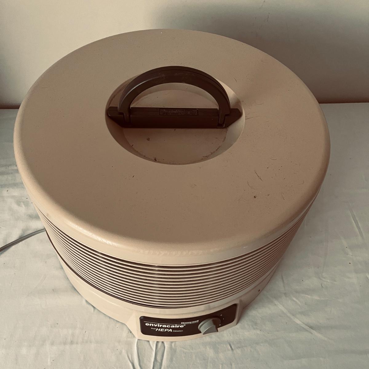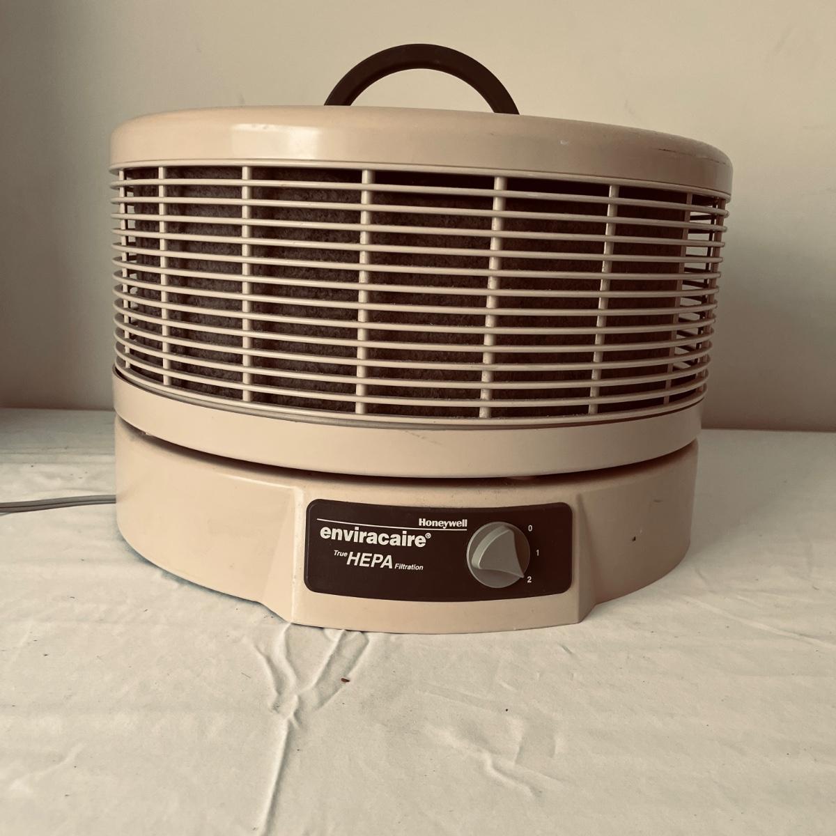 Lot includes a Honeywell Hepa Enviracare air purifier that powered on when plugged in. Machine measures 16”D x 10”H.
