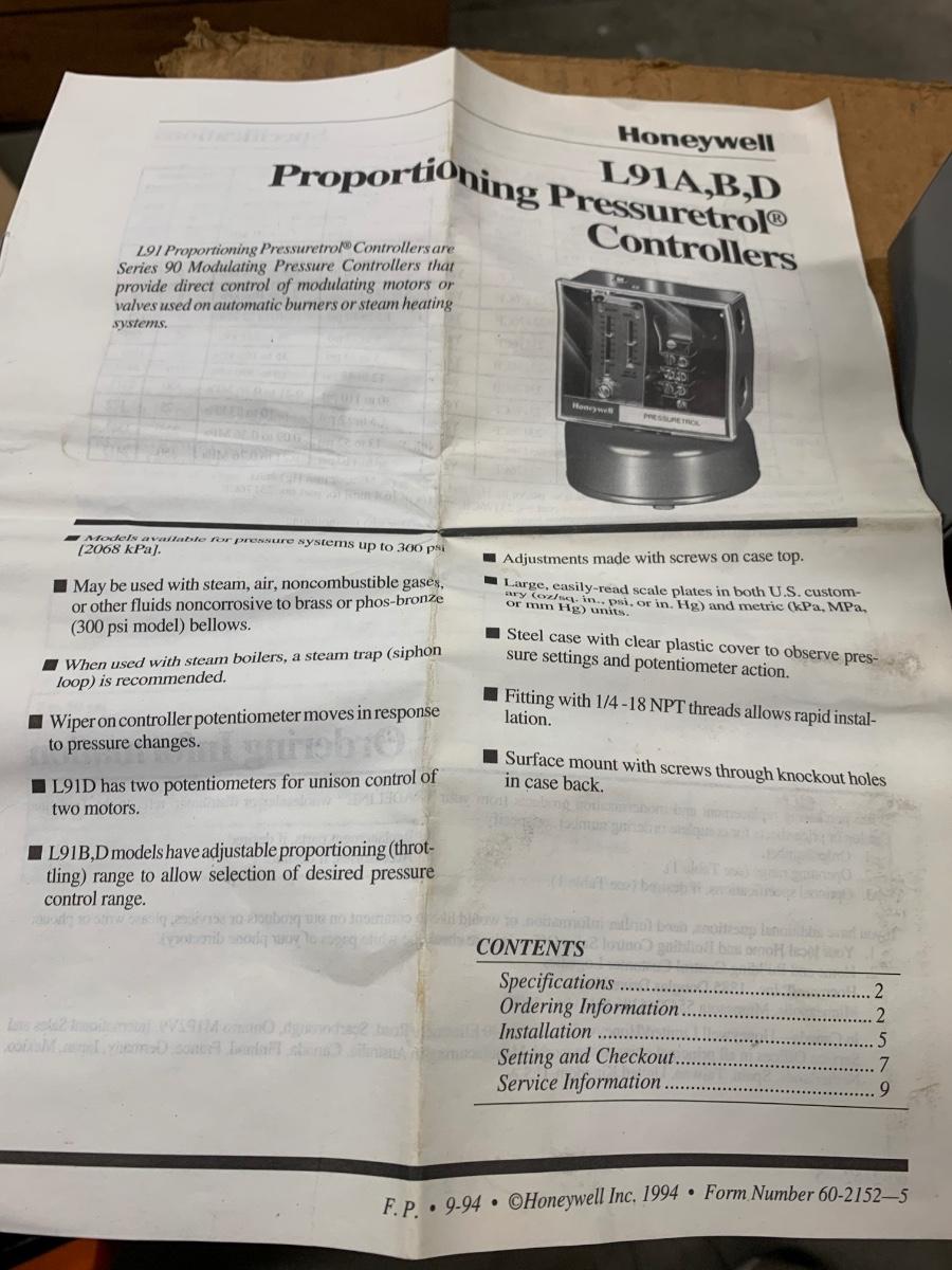 Honeywell Pressuretol L91A 1037 Proportioning Pressuretrol Controllers