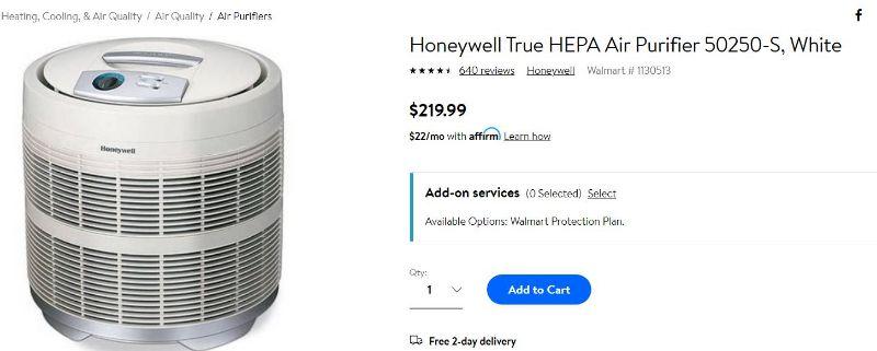 Honeywell True HEPA Air Purifier 50250-S, White - New, $220 @ Walmart