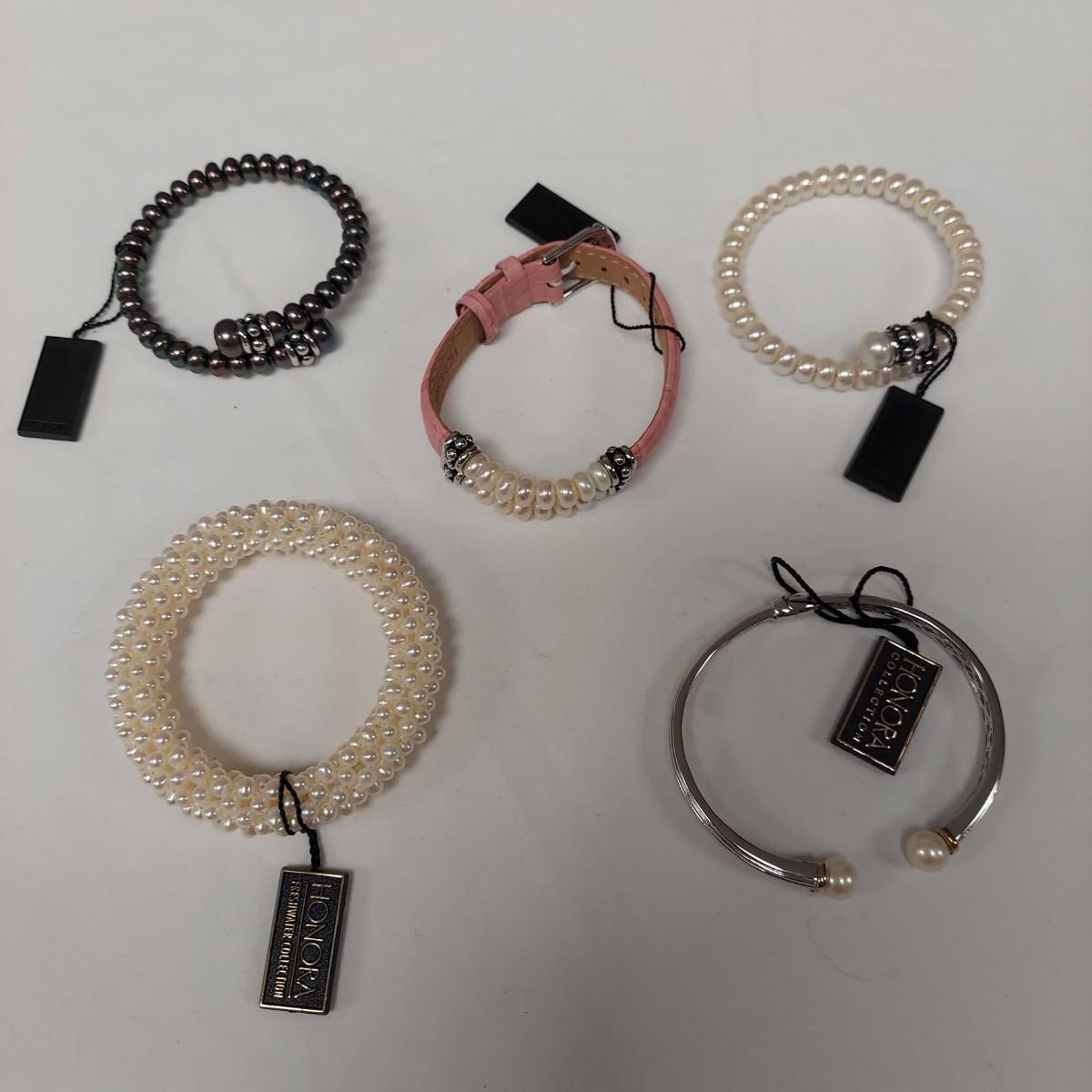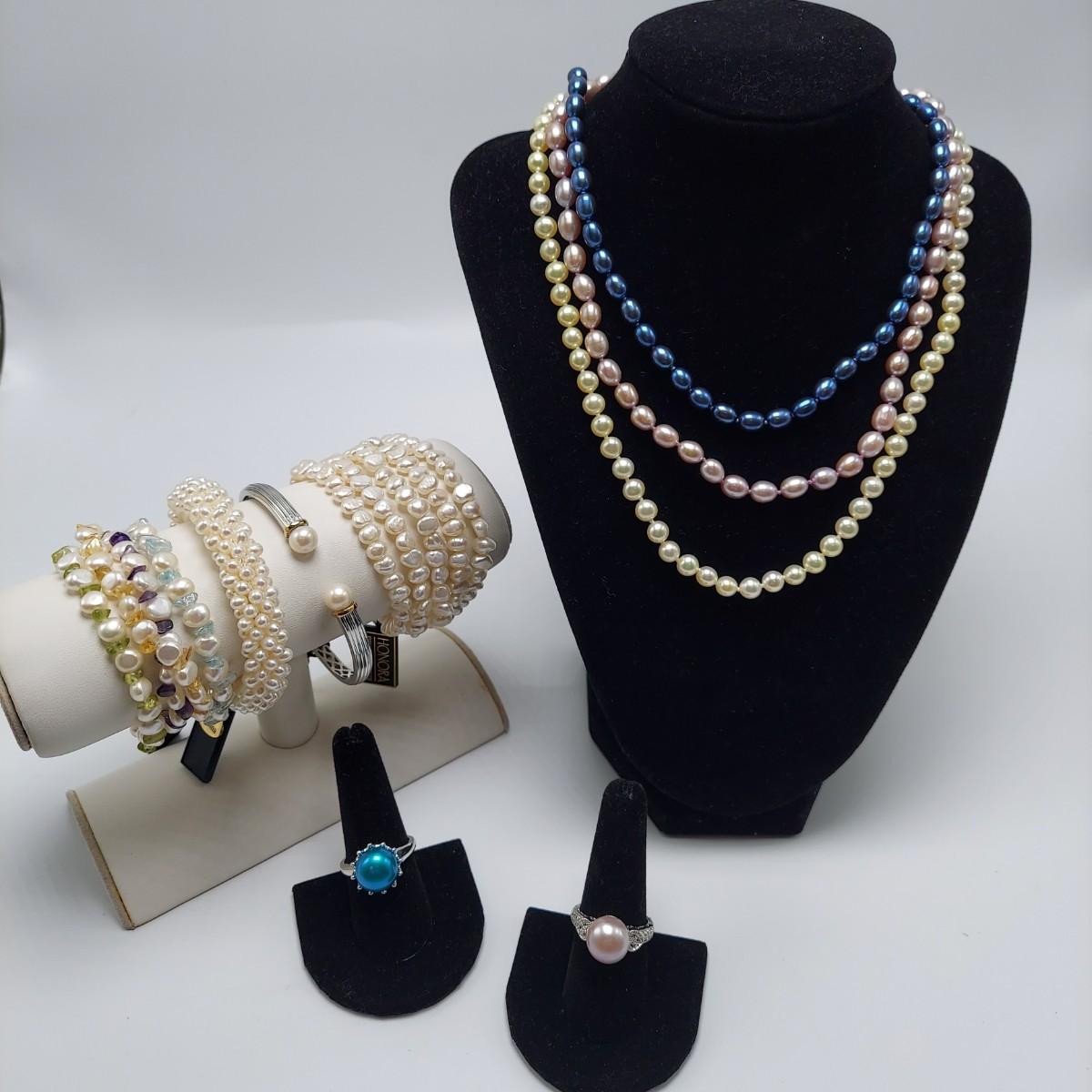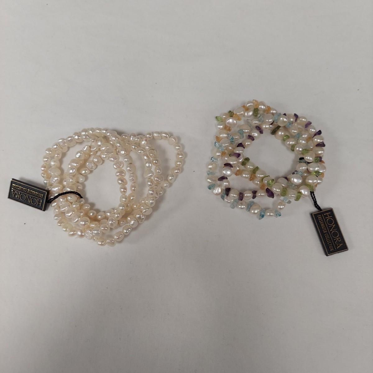 Several pieces of pearl jewelry by Honora Freshwater Collection. Lot includes three necklaces, 14 bracelets, one watch and four rings. Necklaces range from 14-18" long. The rings and metal cuff bracelet are stamped .925. Please see photos for all markings found. We cannot guarantee the authenticity of the gemstones. All sales are final. No returns or refunds. Please bid accordingly.