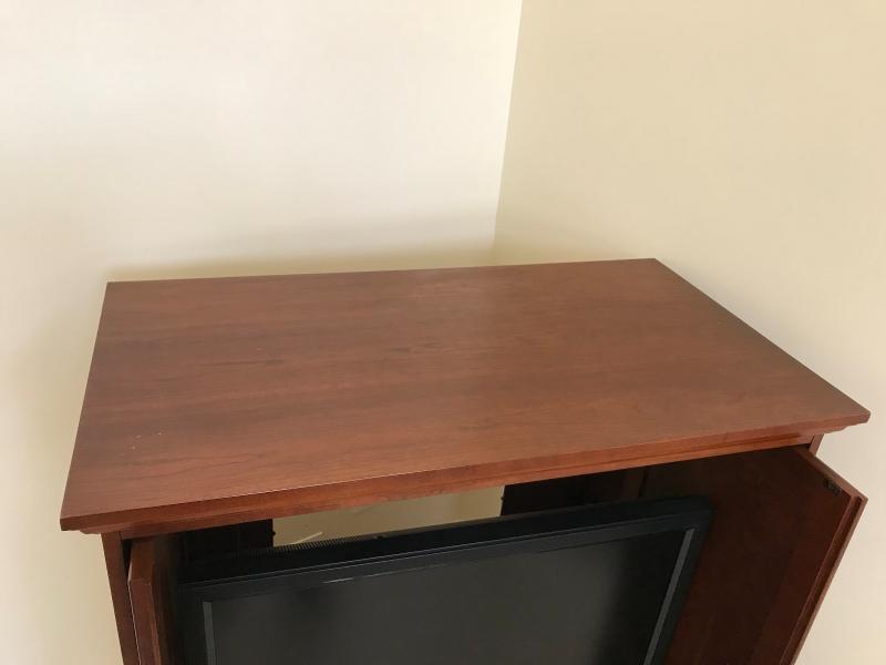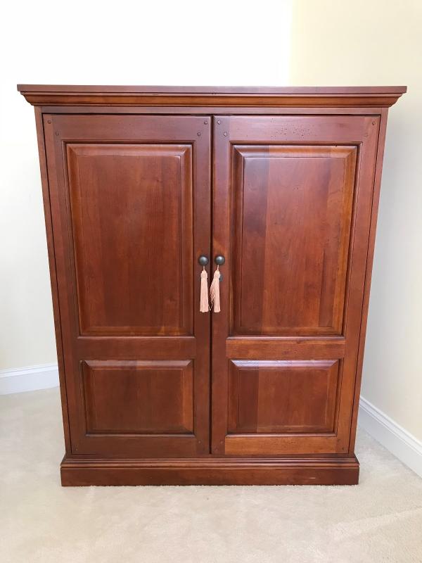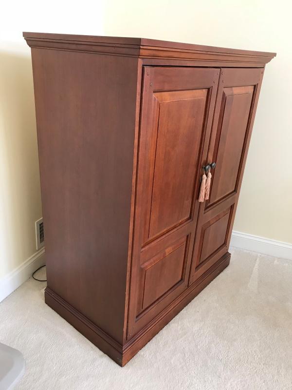 Very nice cherry two door entertainment cabinet by Hooker. Raised panel doors roll back into cabinet for unobstructed view of TV. Lower interior cubbies for entertainment components. Television sold separately. 43 1/2" x 24" x 53 1/2" H