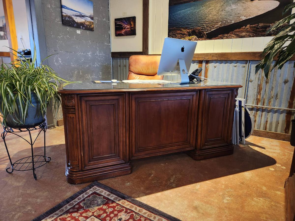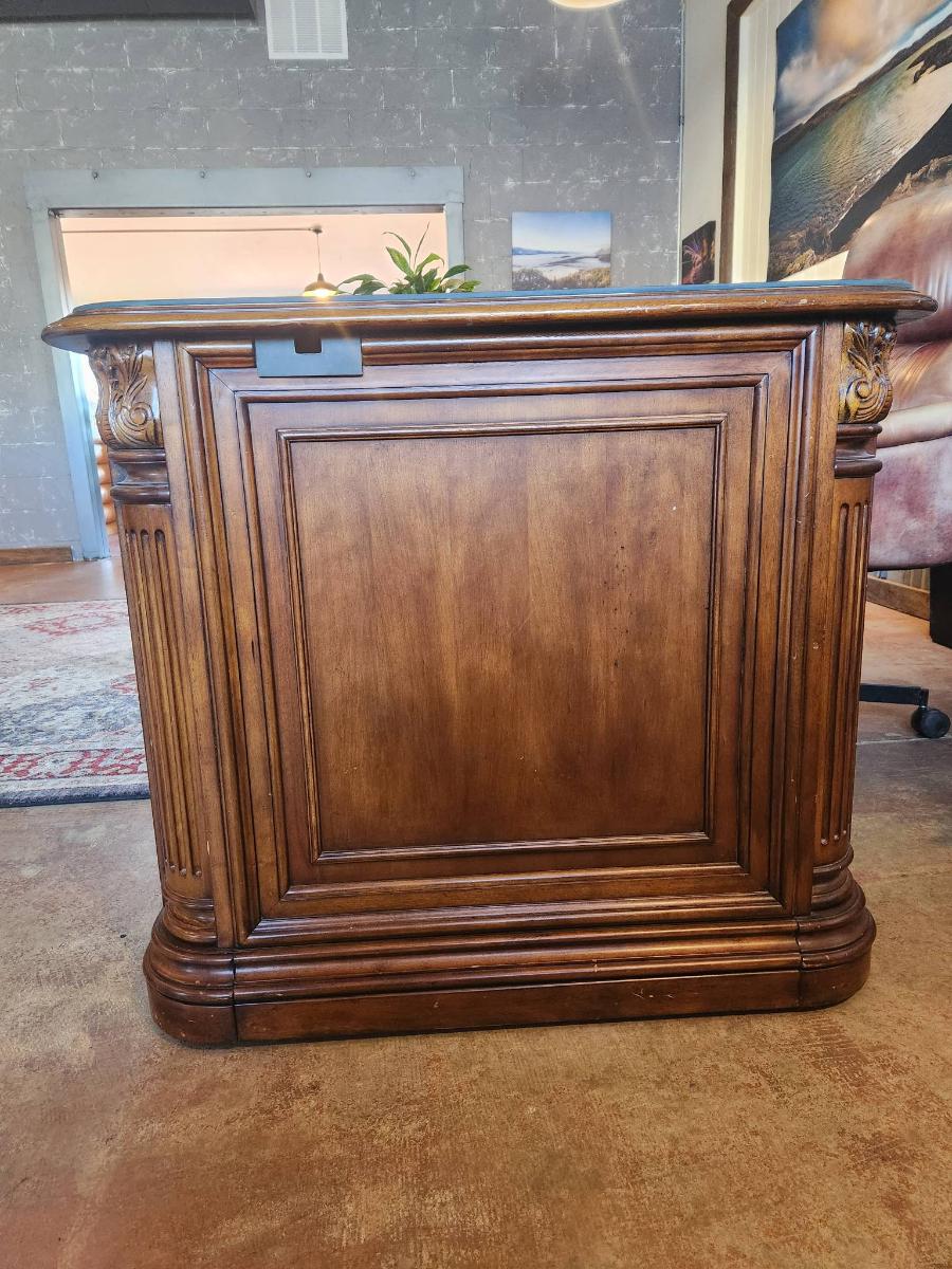 Hooker desk crafted from cherry wood, measuring 6 feet in length, 3 feet in width, and 2.6 feet in height. Features include a glass top for added protection, multiple drawers for storage, and elegant carved details. Labeled with Hooker Furniture branding, emphasizing its high-quality craftsmanship. In excellent condition, ideal for a professional or home office.