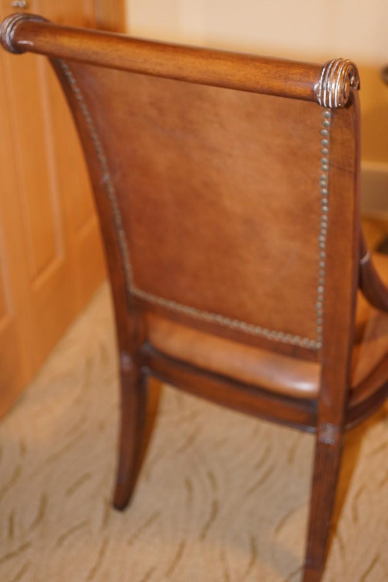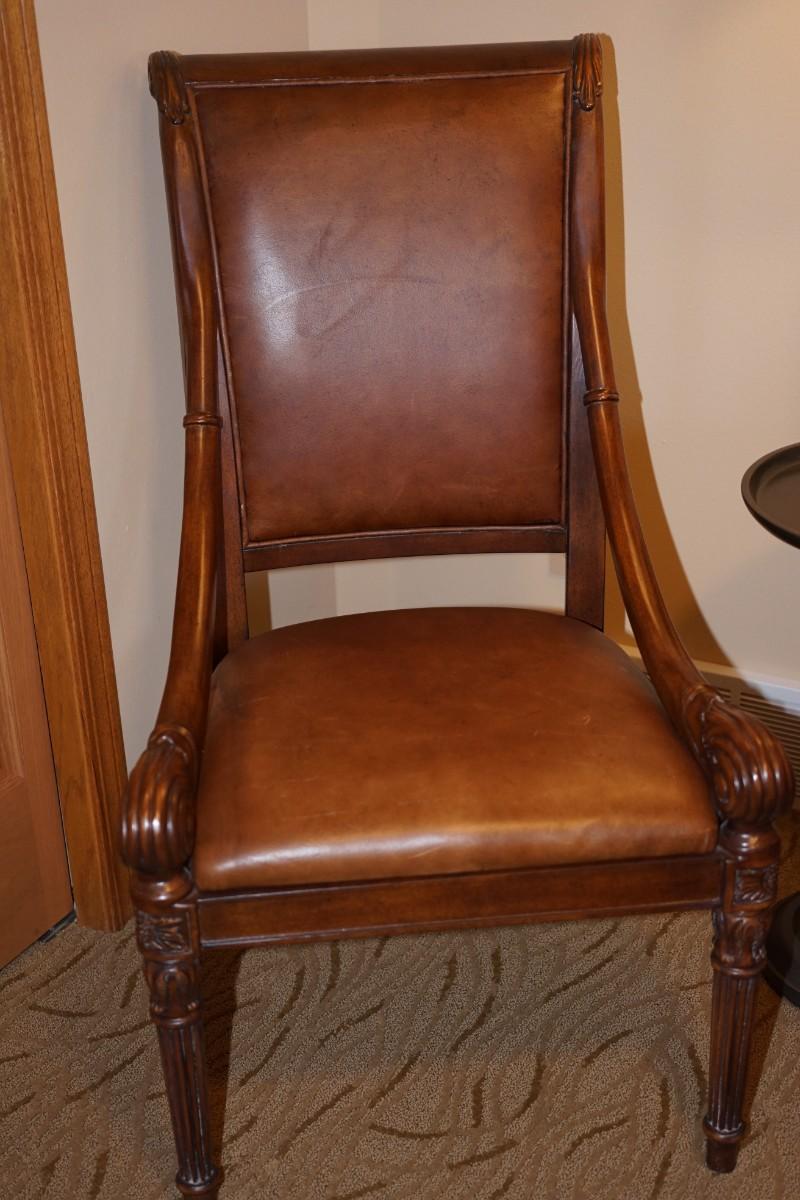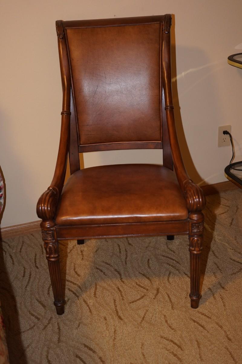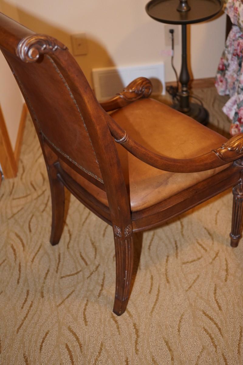 HOOKER DESIGN HIGH BACK SIDE CHAIR W/ BROWN LEATHER UPHOLSTERY /CARVED WOOD FRAME.