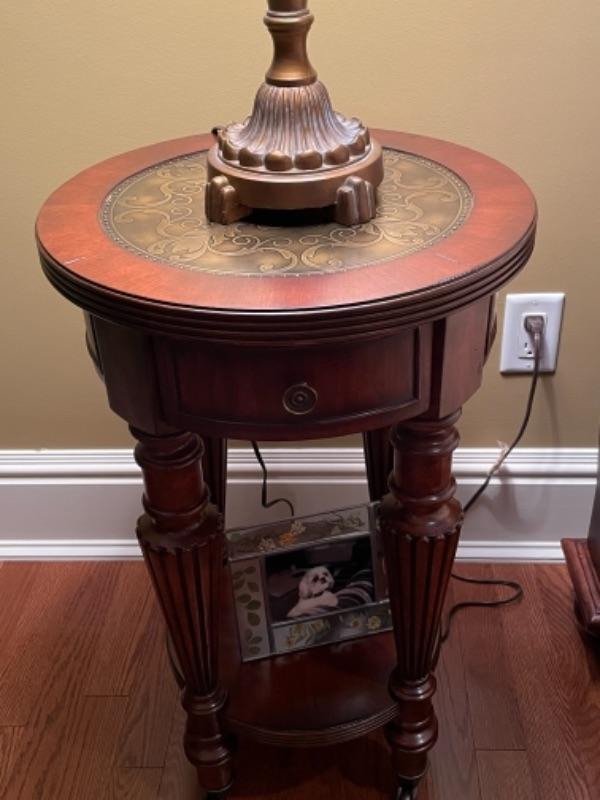 Hooker side table with scrollwork design in center of table. Measures 17’ across by 28H