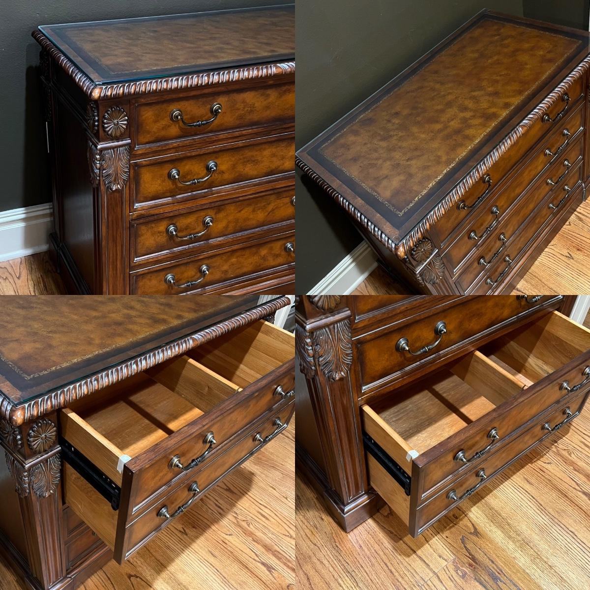 Includes: 2 sided office desk, 2 piece 3-way lighted Credenza, glass top filing cabinet. 2 sided desk = 31” H x 72” W x 36” D ~ Credenza = 85.5” H x 72” W x 23” D ~ 32.5” H x 38” W x 22” D