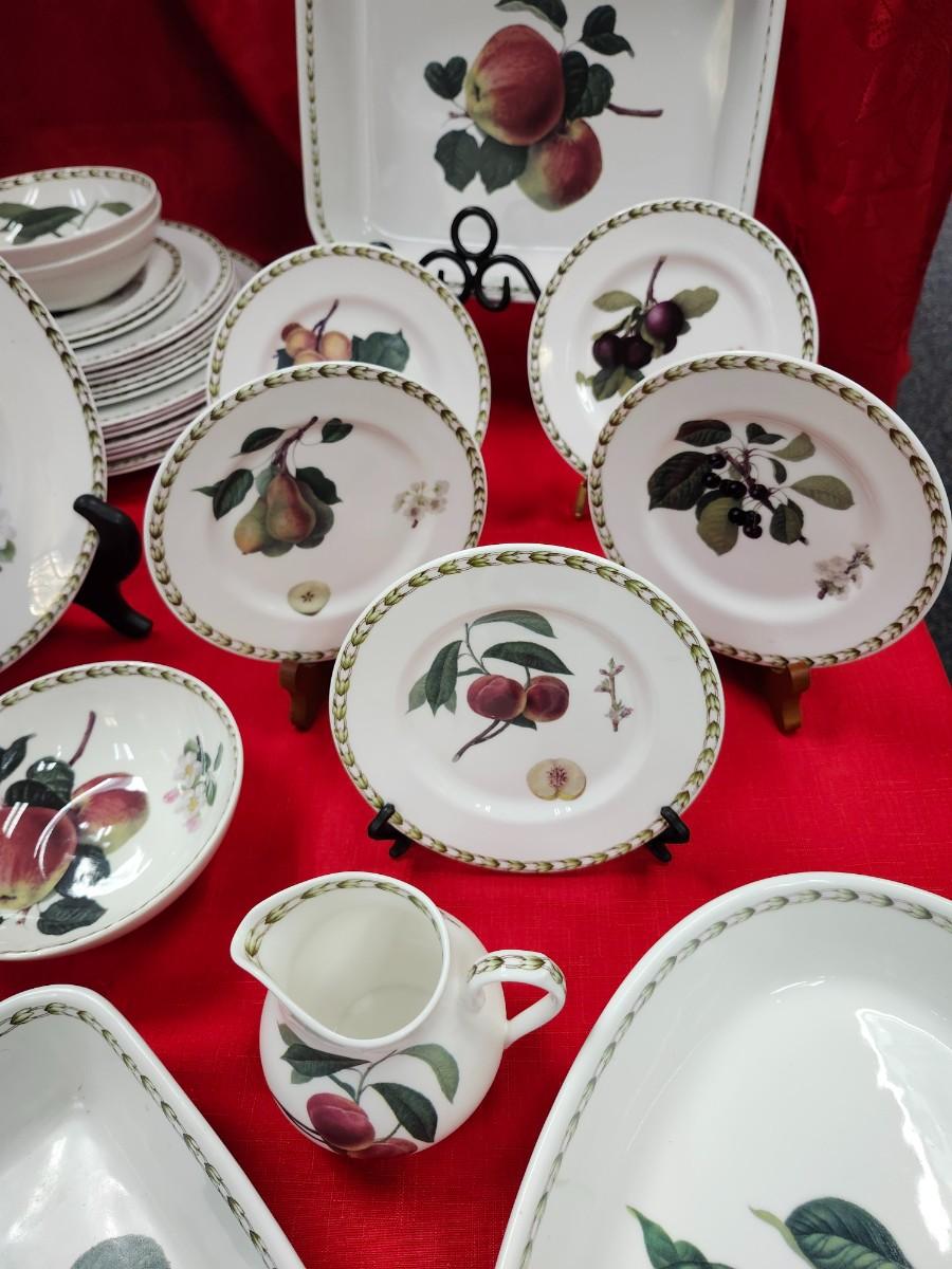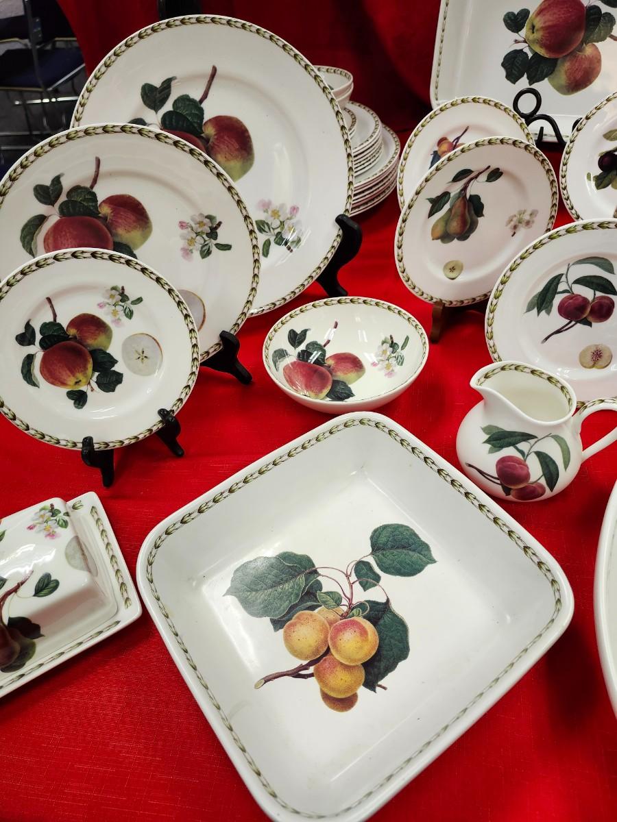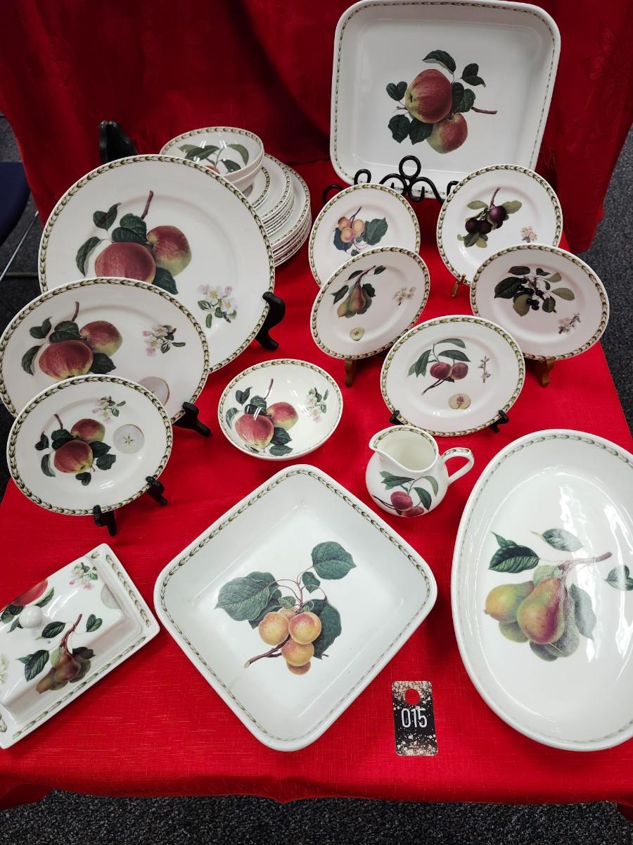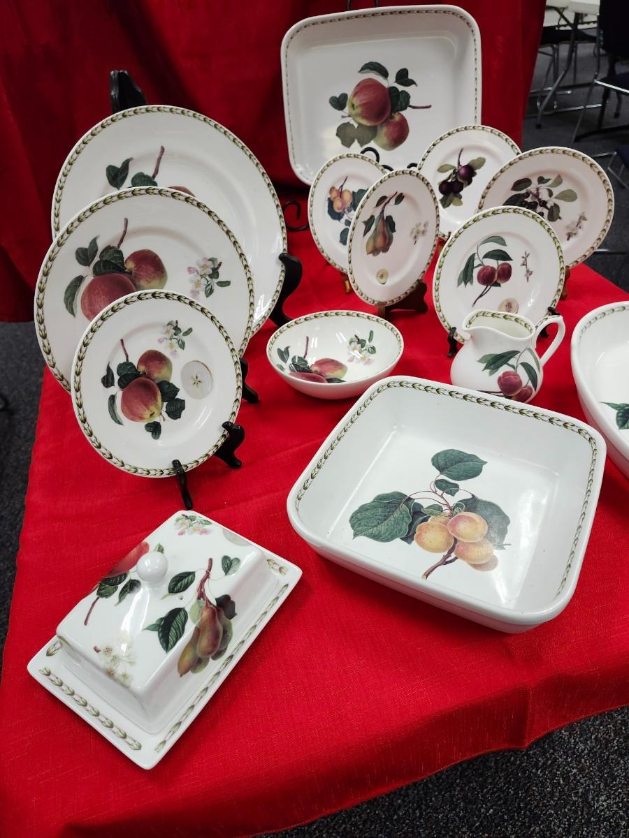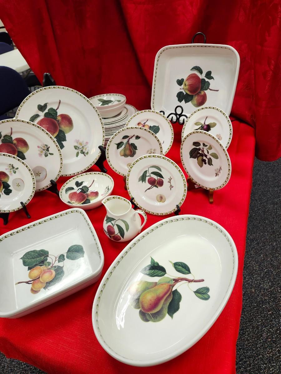 The Royal Horticultural Society Dinner Set. This beautiful dish set features apples, pears, currant, peach, plum, and apricot fruit. There are 9 dinner plates, 8 salad plates, 8 bread and butter plates, 3 bowls, a butter dish, an 8" baking dish, an 11 x 9 baking dish, a 12-inch oval baking dish, and a pitcher. It is in very nice condition. Local pickup.