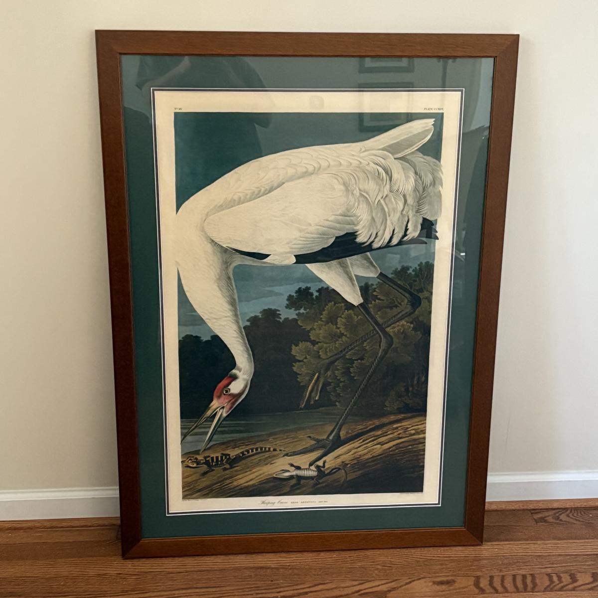 This Hooping Crane Print is in a wooden frame and is covered with glass. It measures at approximately 32" x 44"H. It appears to be a print of a painting by John James Audubon. It comes ready to hang. See photo with Tanya in it for size reference!