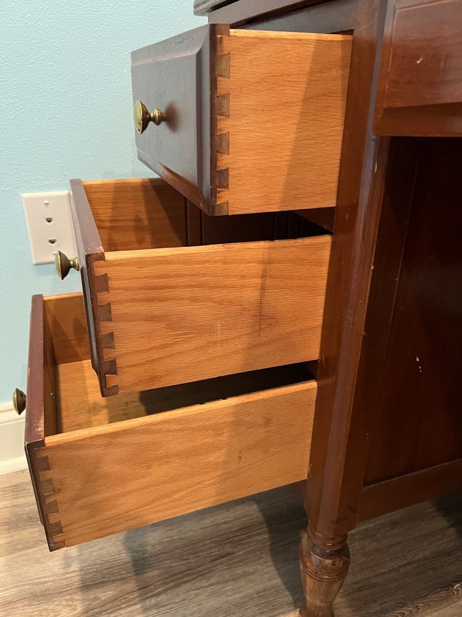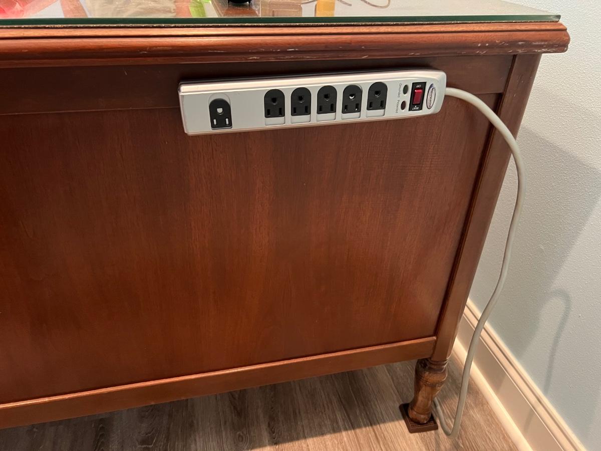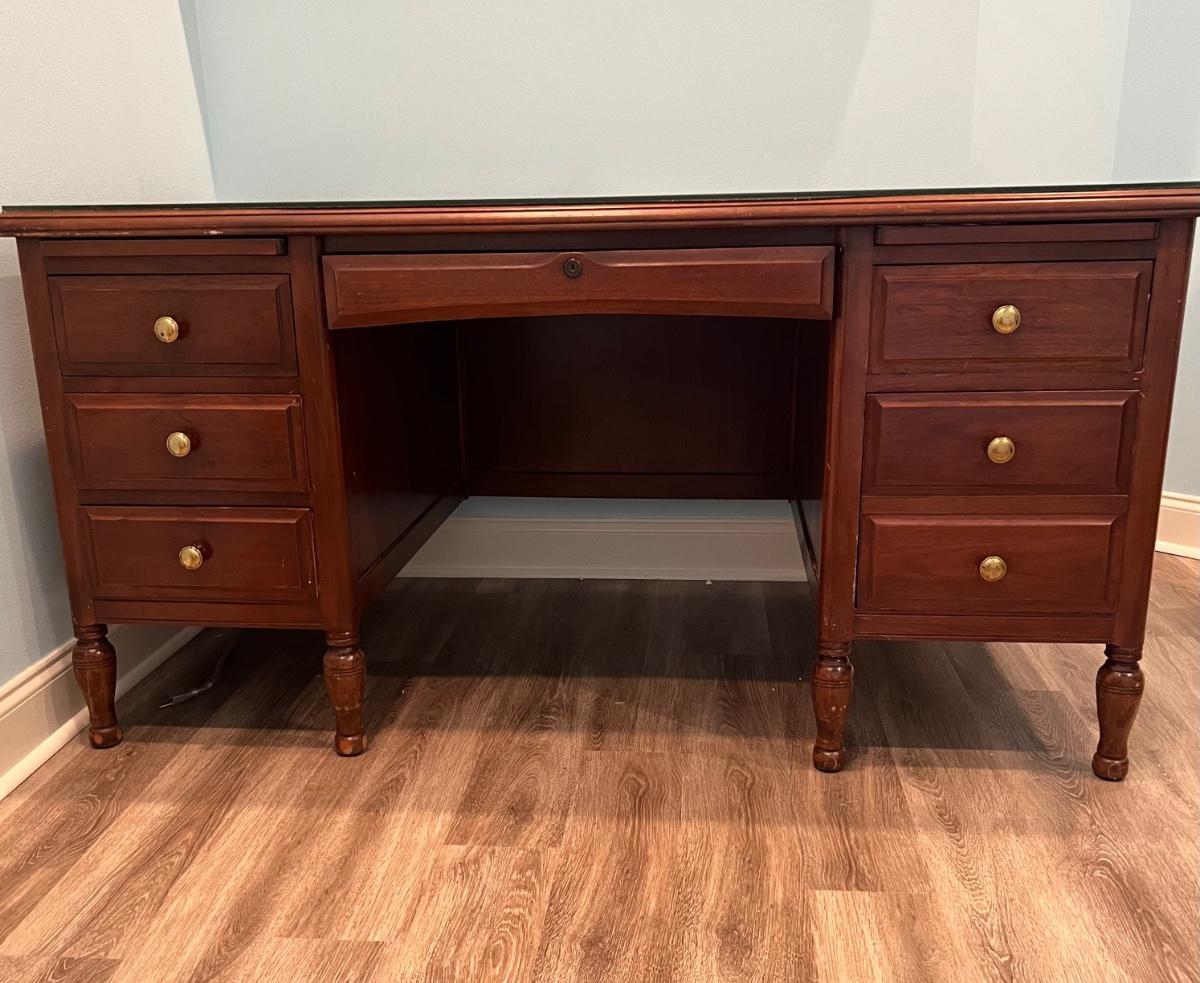 This is SOLID AND HEAVY!! HOOSIER DESK CO. Desk With glass top. Measures 31 inches Tall 60 inches Wide and 34 inches deep. A power strip is mounted on the back of the desk.