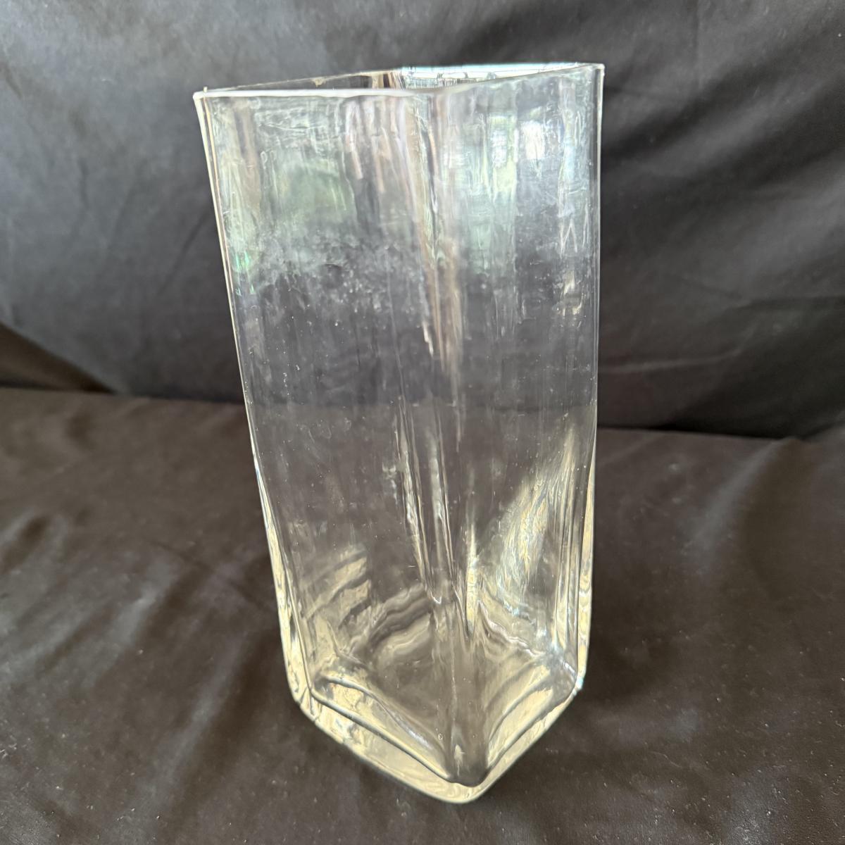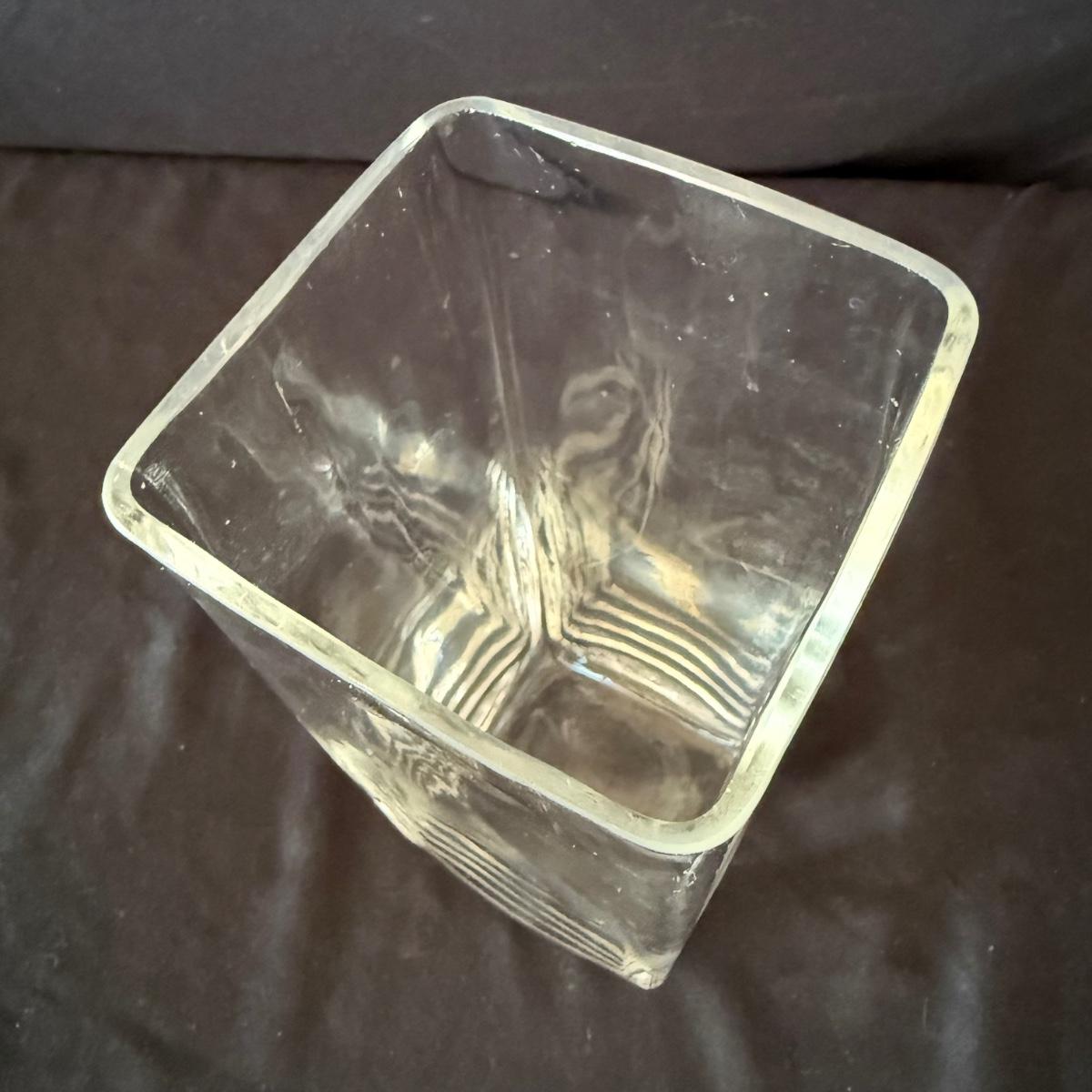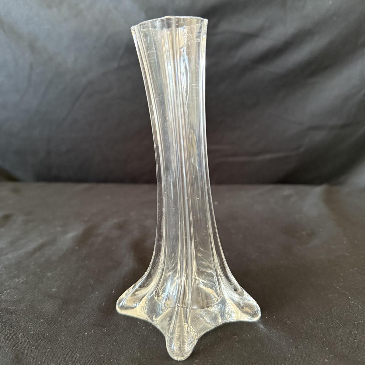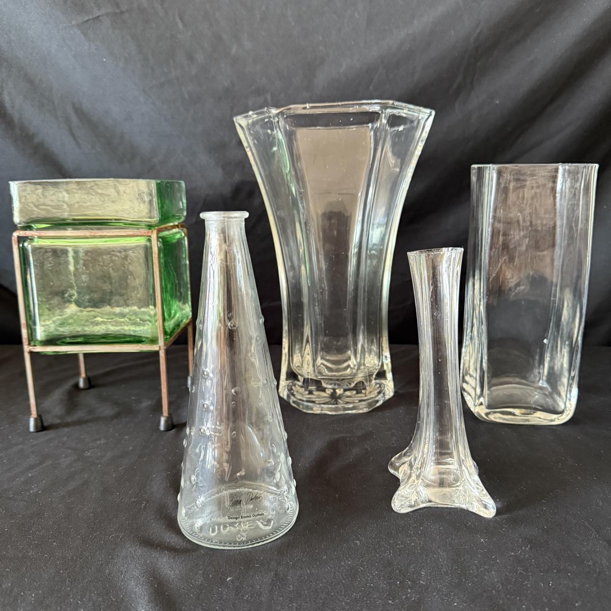 Nine clear glass vases. The cube vase on the metal stand has a tinge of green. The largest vase is the hexagonal Hoosier Glass vase that measures 6” x 7” x 10.25”H. The three hobnail bud cases are IKEA brand labeled as designed by Emma Dafnäs. The cylindrical case appears to be hand-blown. Metal stand is rusty, and items show signs of use.