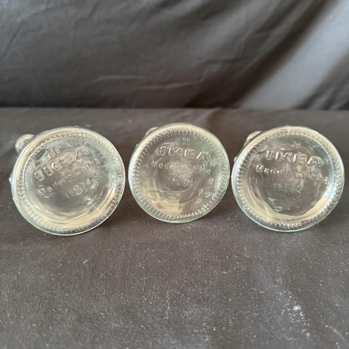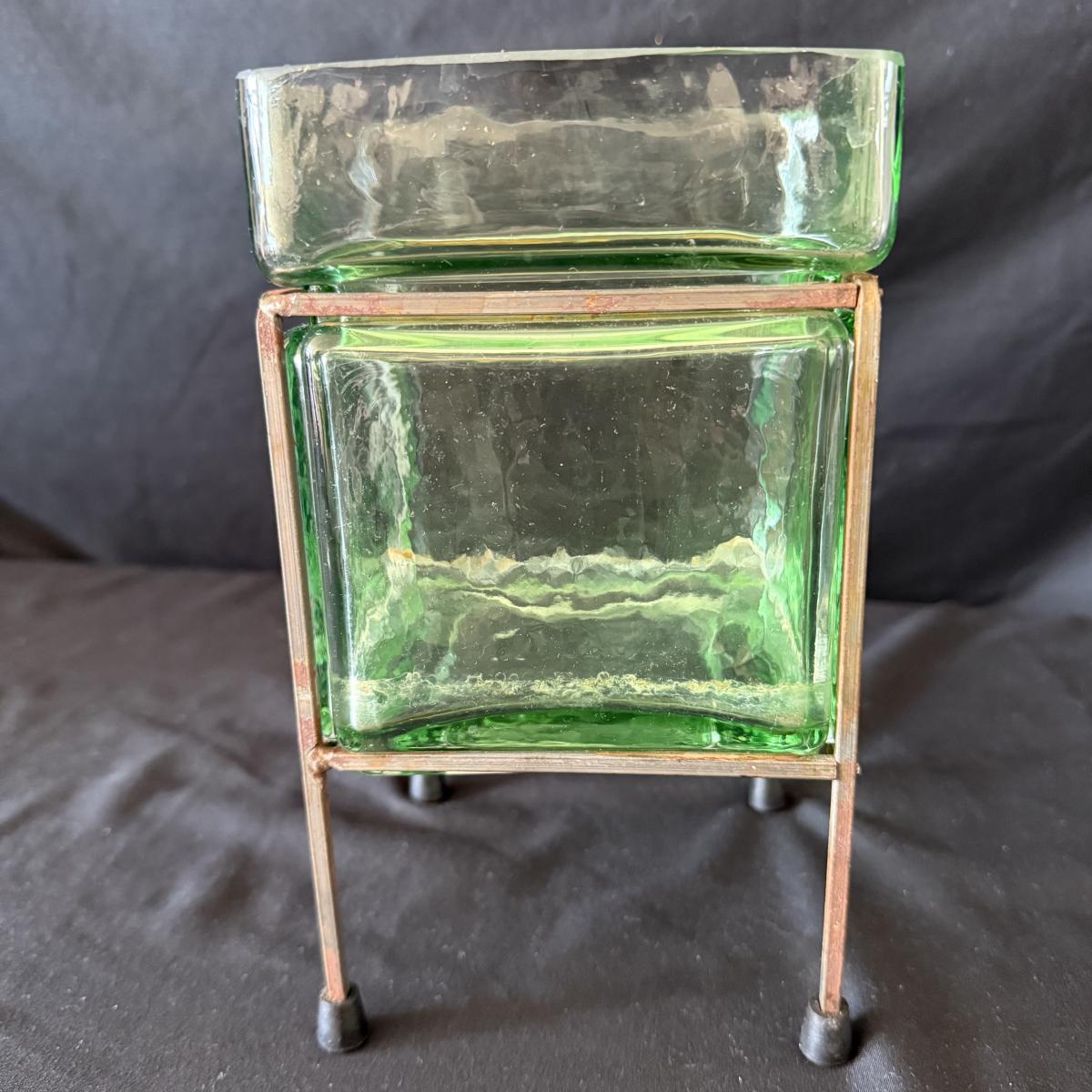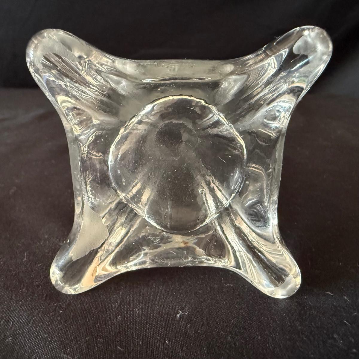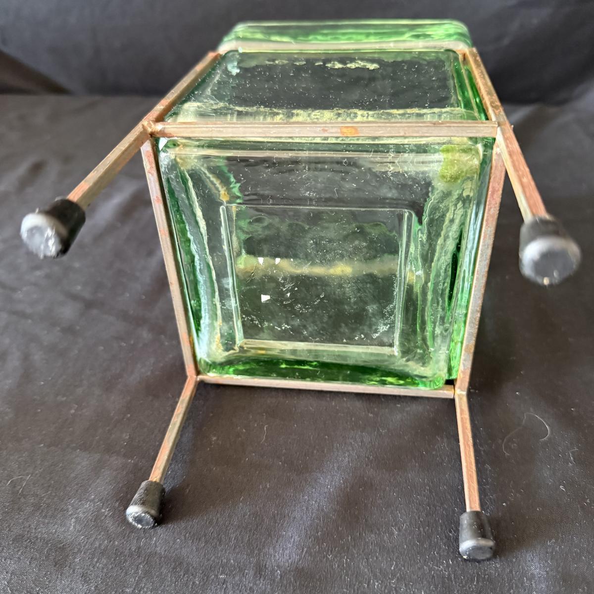 Nine clear glass vases. The cube vase on the metal stand has a tinge of green. The largest vase is the hexagonal Hoosier Glass vase that measures 6” x 7” x 10.25”H. The three hobnail bud cases are IKEA brand labeled as designed by Emma Dafnäs. The cylindrical case appears to be hand-blown. Metal stand is rusty, and items show signs of use.