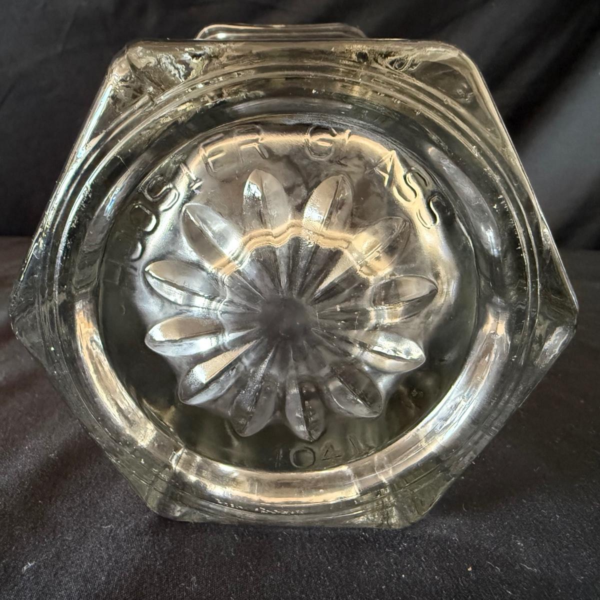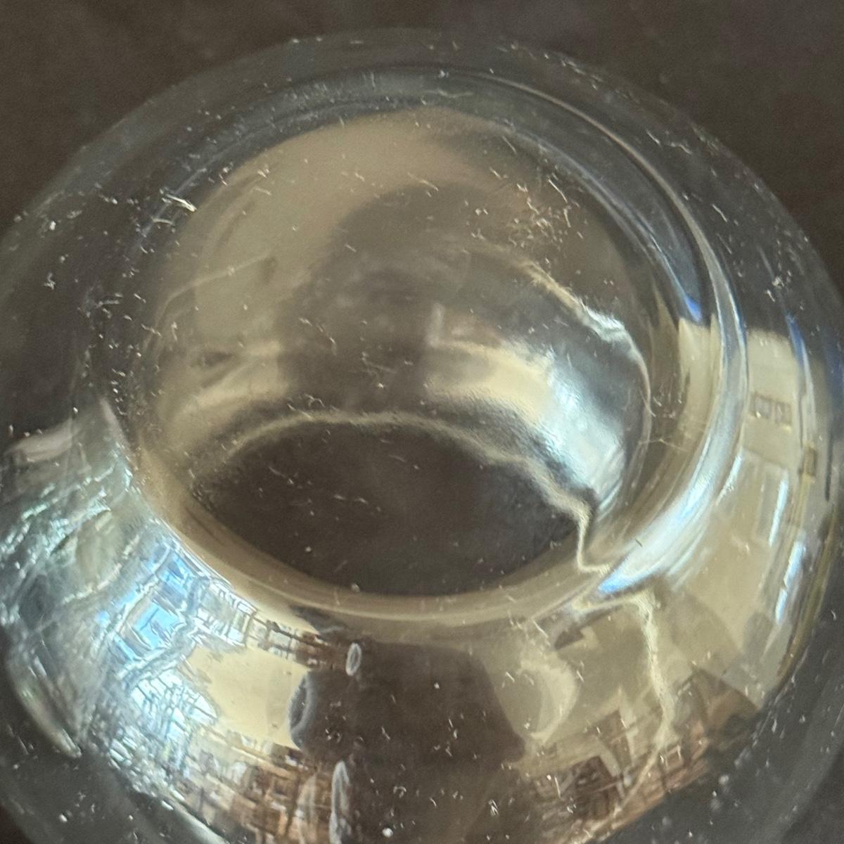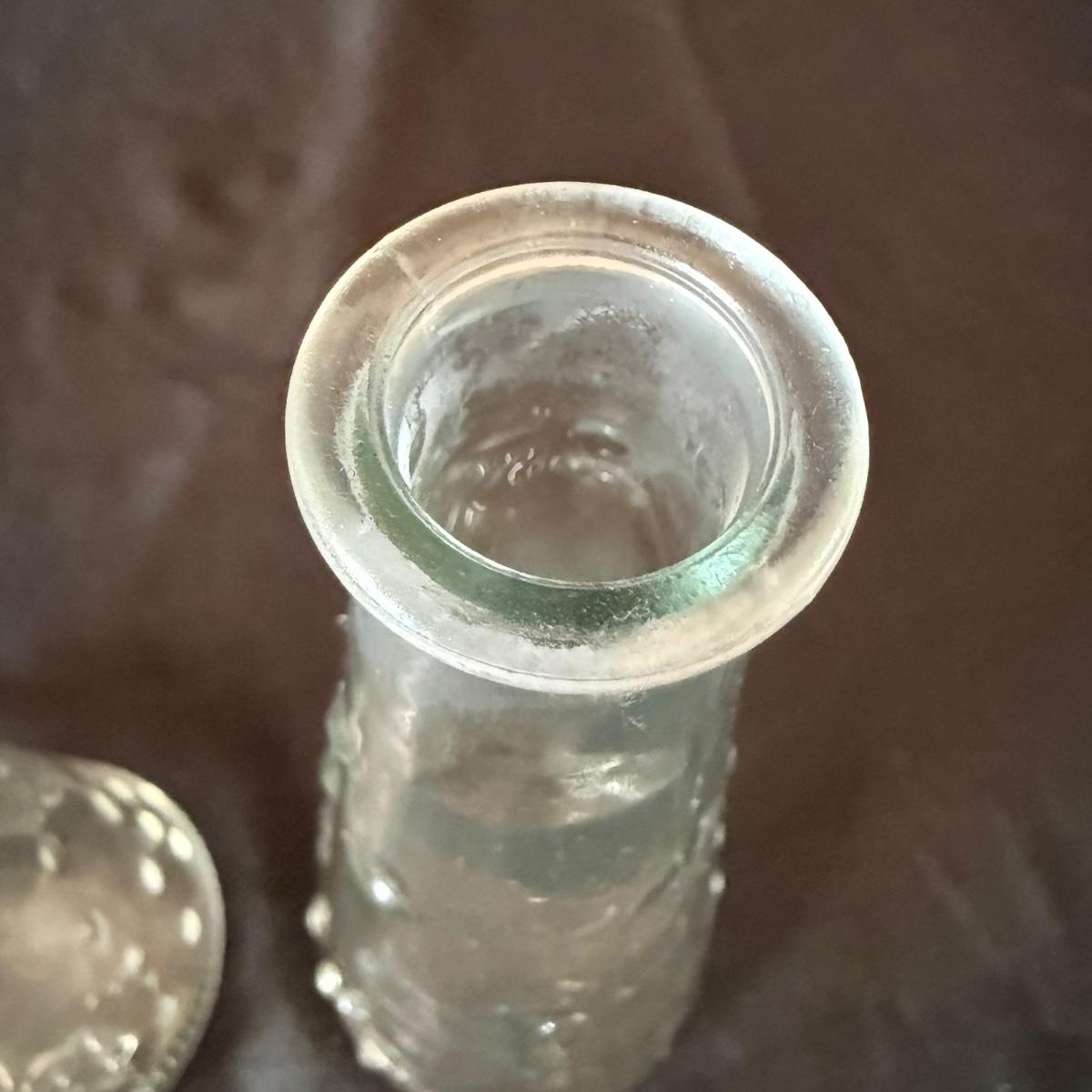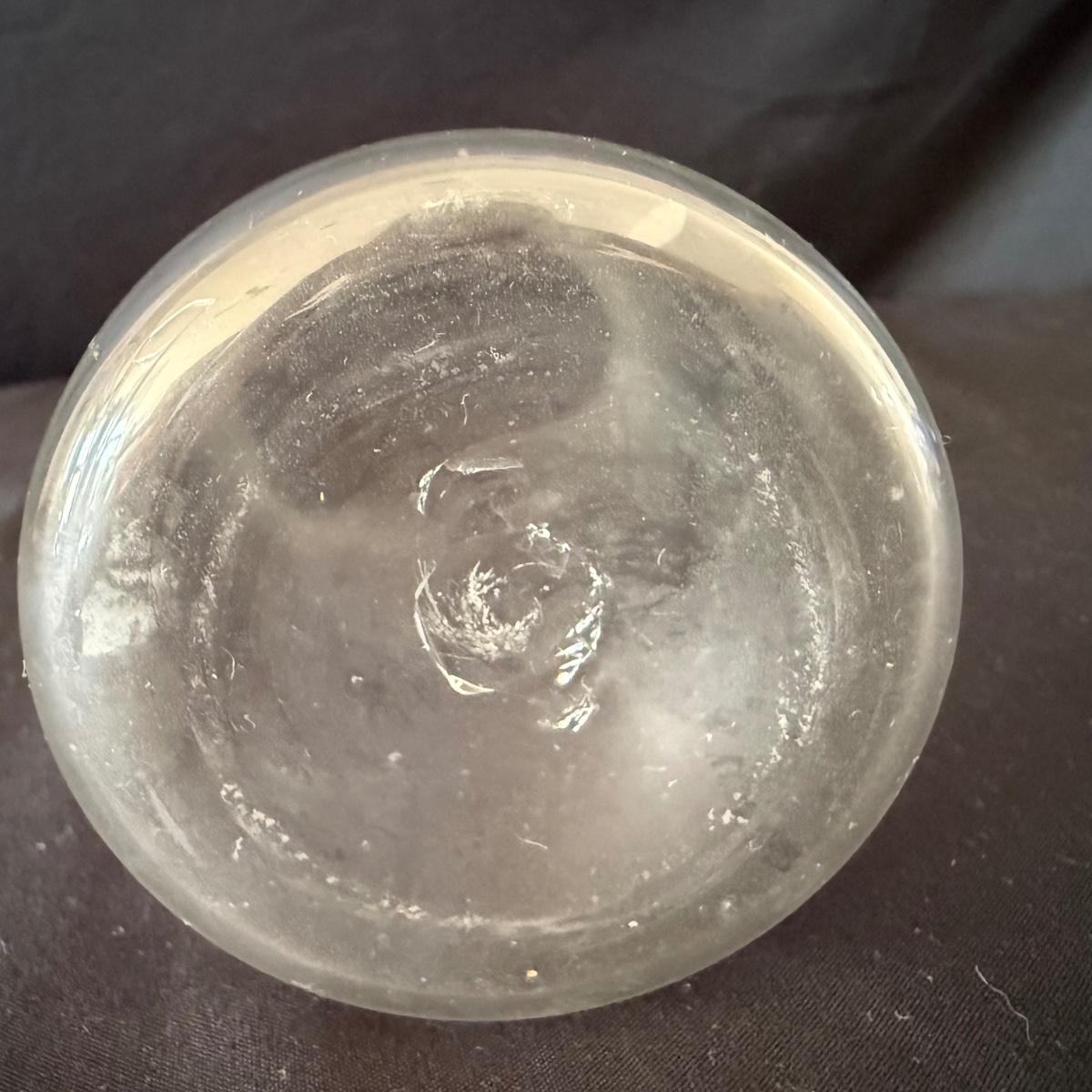 Nine clear glass vases. The cube vase on the metal stand has a tinge of green. The largest vase is the hexagonal Hoosier Glass vase that measures 6” x 7” x 10.25”H. The three hobnail bud cases are IKEA brand labeled as designed by Emma Dafnäs. The cylindrical case appears to be hand-blown. Metal stand is rusty, and items show signs of use.