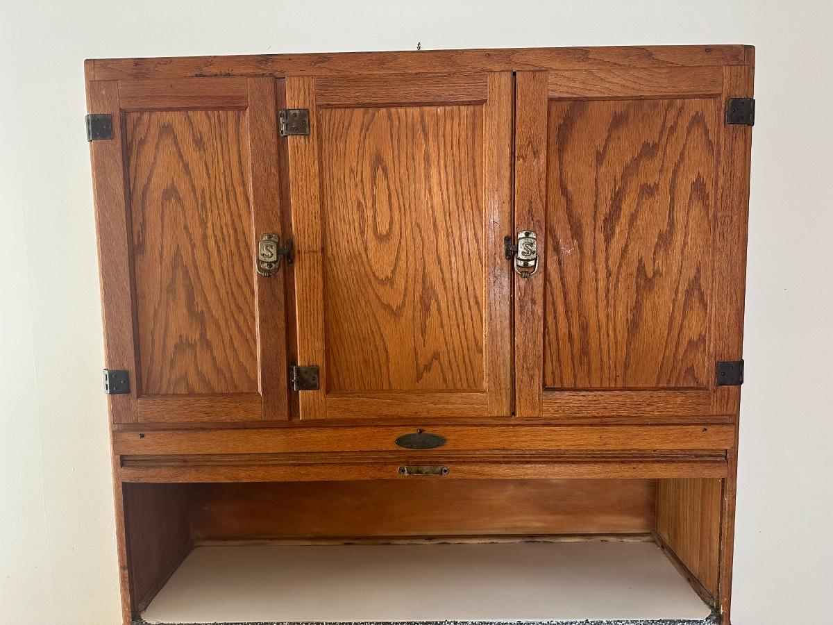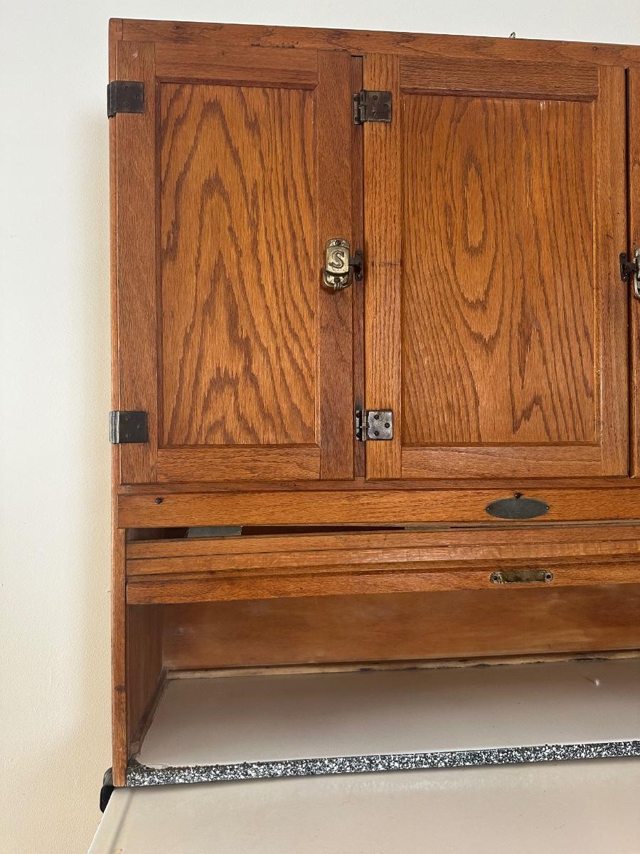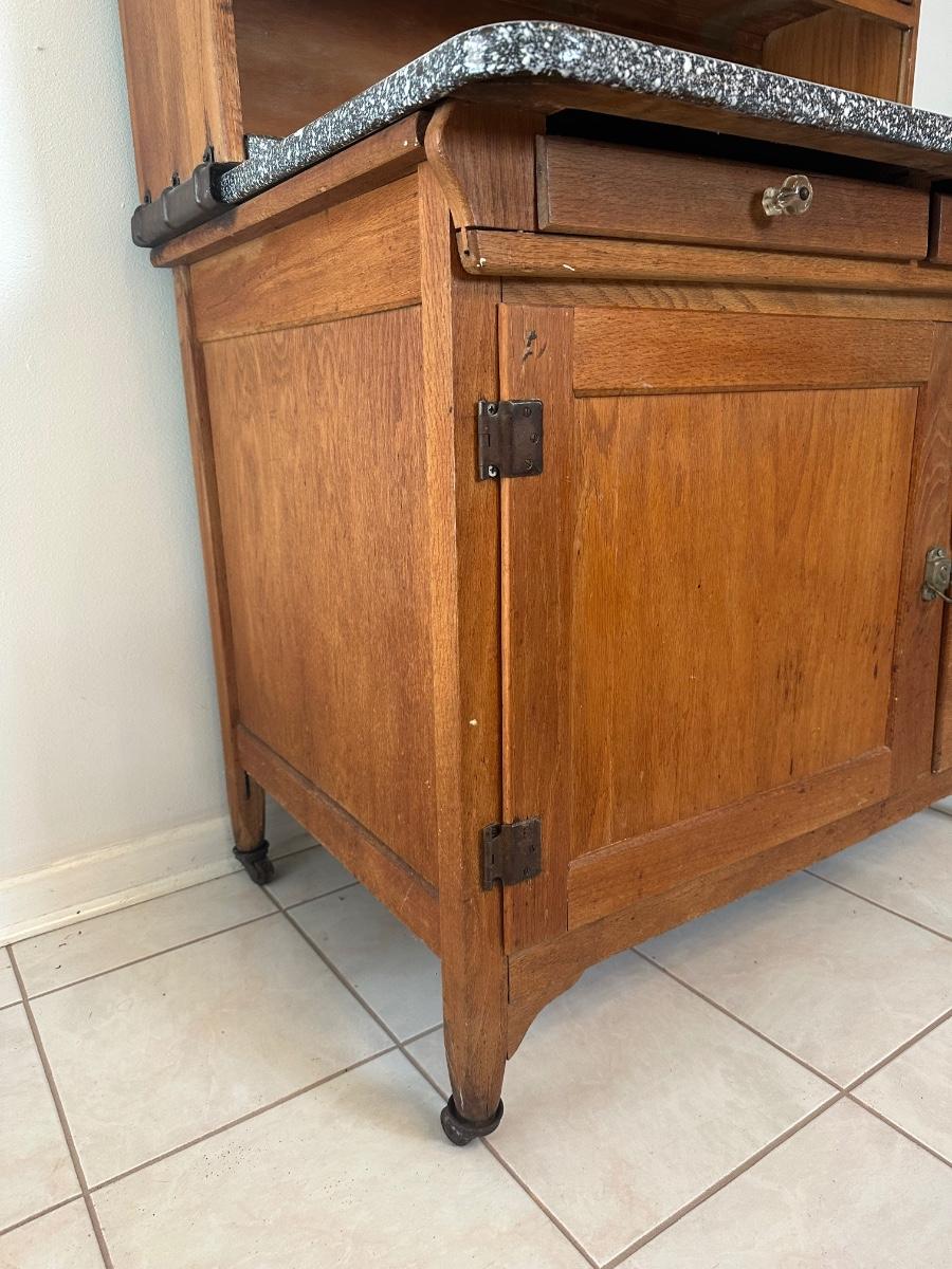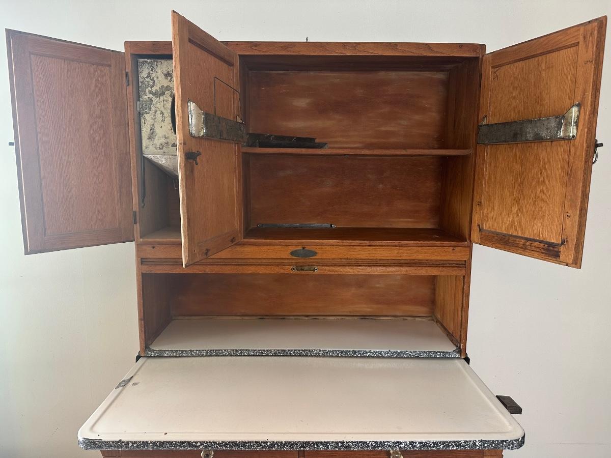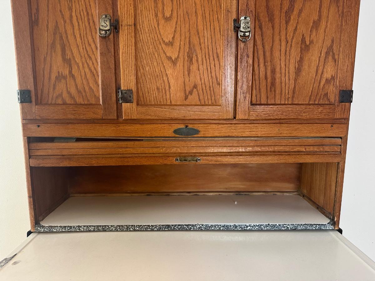 1930s Hoosier Oak Kitchen Cabinet with Porcelain Top