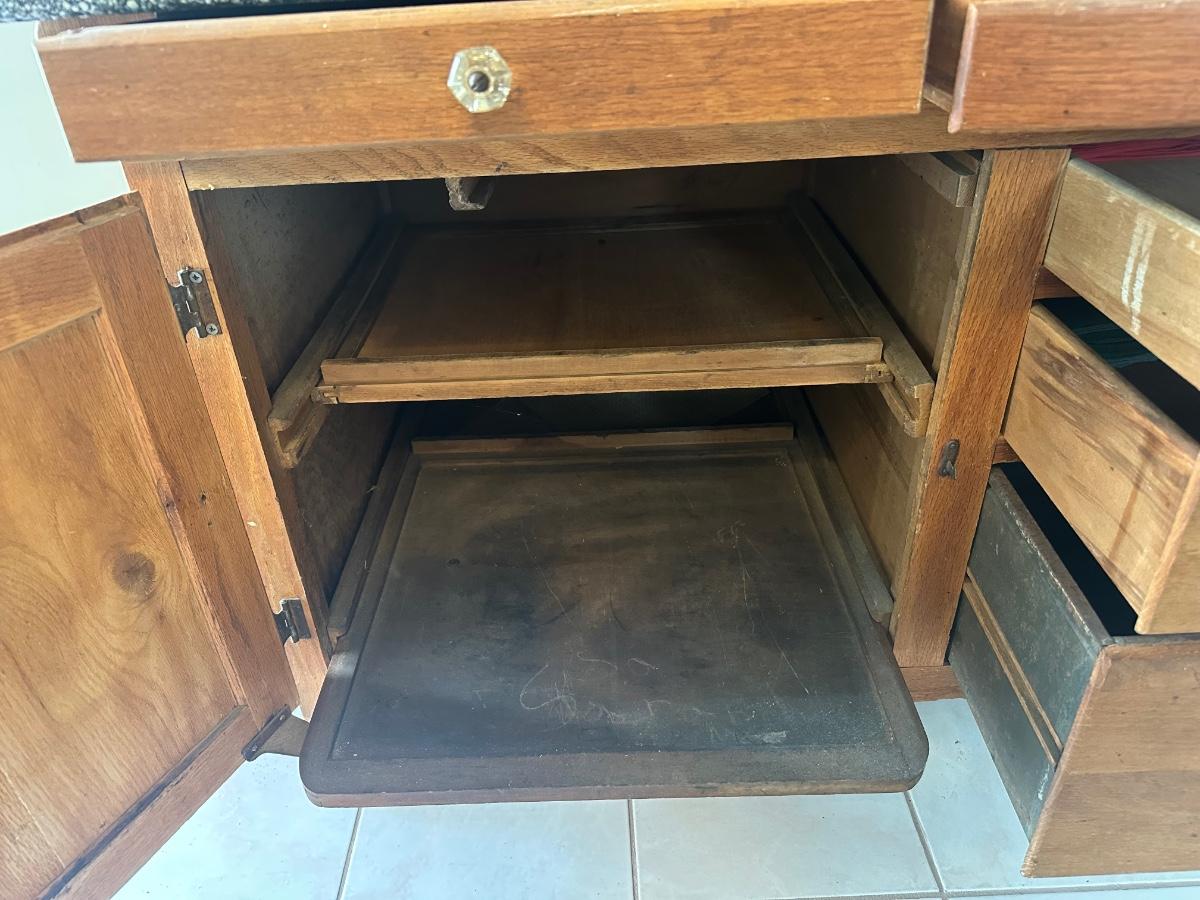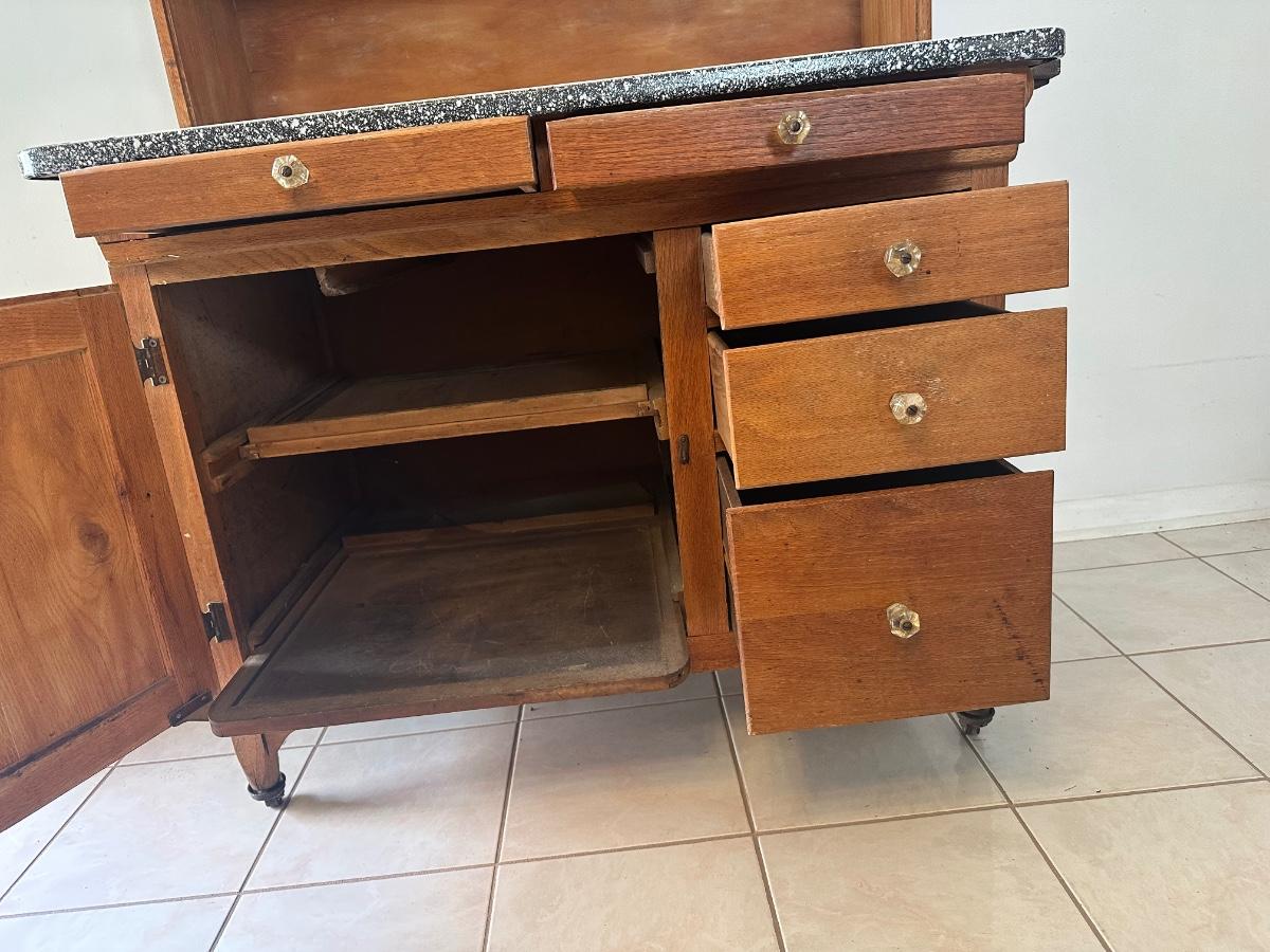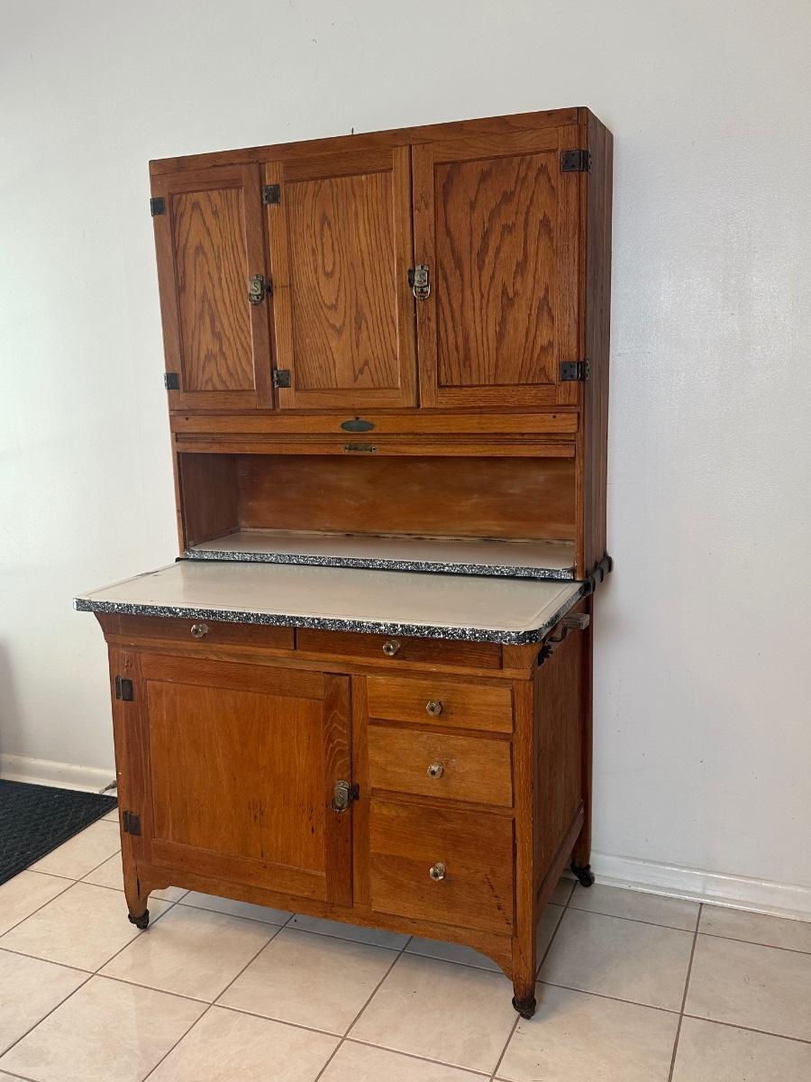Vintage Hoosier-style oak kitchen cabinet featuring a porcelain-enamel over steel work surface, upper storage cabinets, multiple drawers, and a built-in metal flour bin. Early 20th-century utility cabinet with paneled doors, solid oak construction, and original interior components. The porcelain-enamel top shows chips and wear consistent with age and use. Interior and exterior display honest wear throughout.
